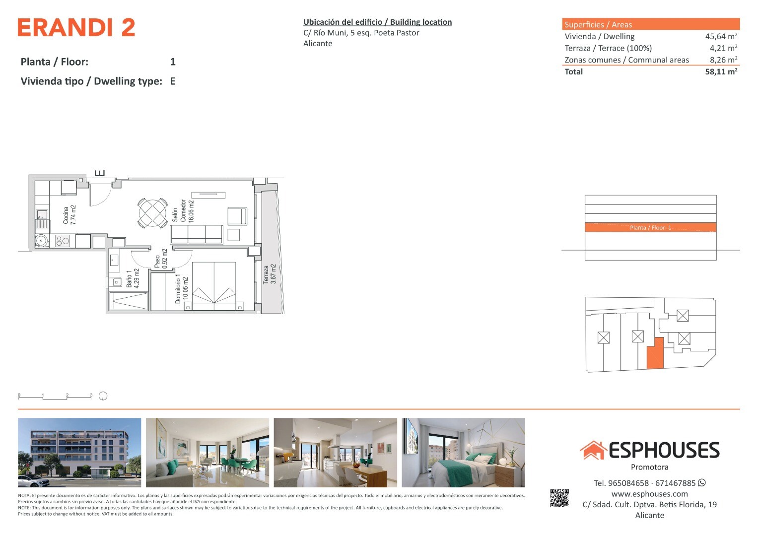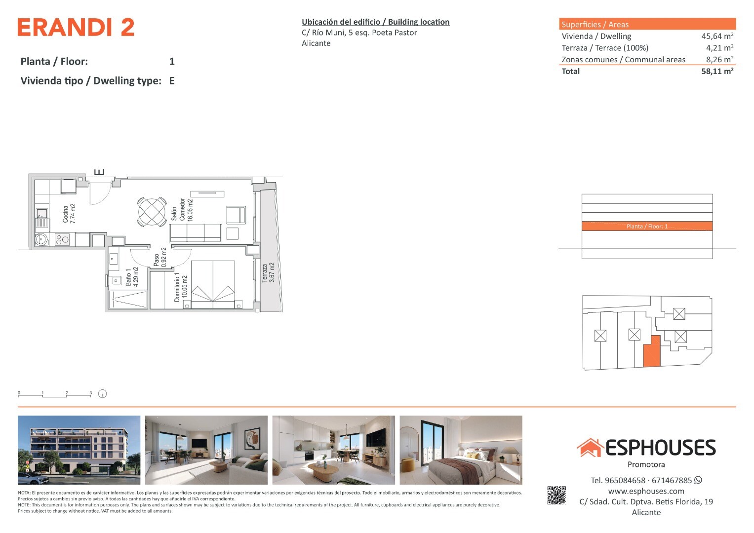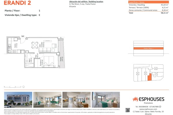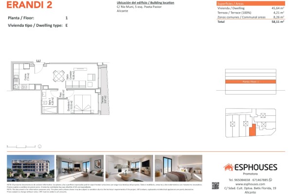 Denna nybyggda och trivsamma bostad ligger på första våningen i ERANDI 2-byggnaden och har en total yta på 45,64 m². Planlösningen är funktionell och består av ett sovrum med inbyggd garderob, ett komplett badrum och ett ljust vardagsrum med öppet kök. Dessutom finns en terrass på 4,21 m² i västerläge — perfekt för att njuta av eftermiddagssolen.