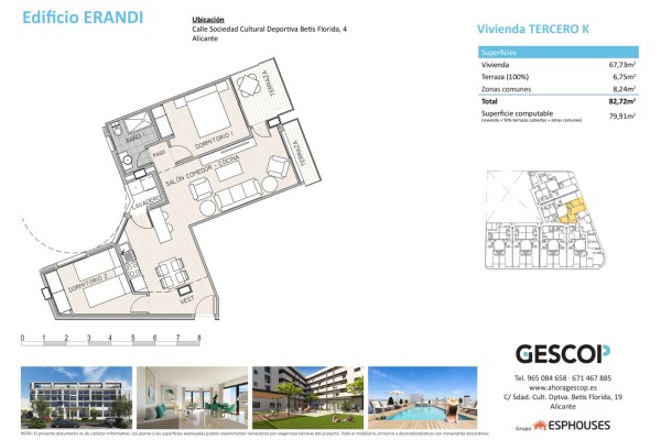 ERANDI-byggnaden ligger bara några minuters promenad från köpcentret Puerta de Alicante, endast 2 km från stranden och 12 km från Alicante–Elche flygplats. Mycket goda kollektivtrafikförbindelser gör att Alicantes centrum kan nås på cirka 10–15 minuter. Ett utmärkt val både som permanentboende och investering i ett av stadens mest lovande områden.