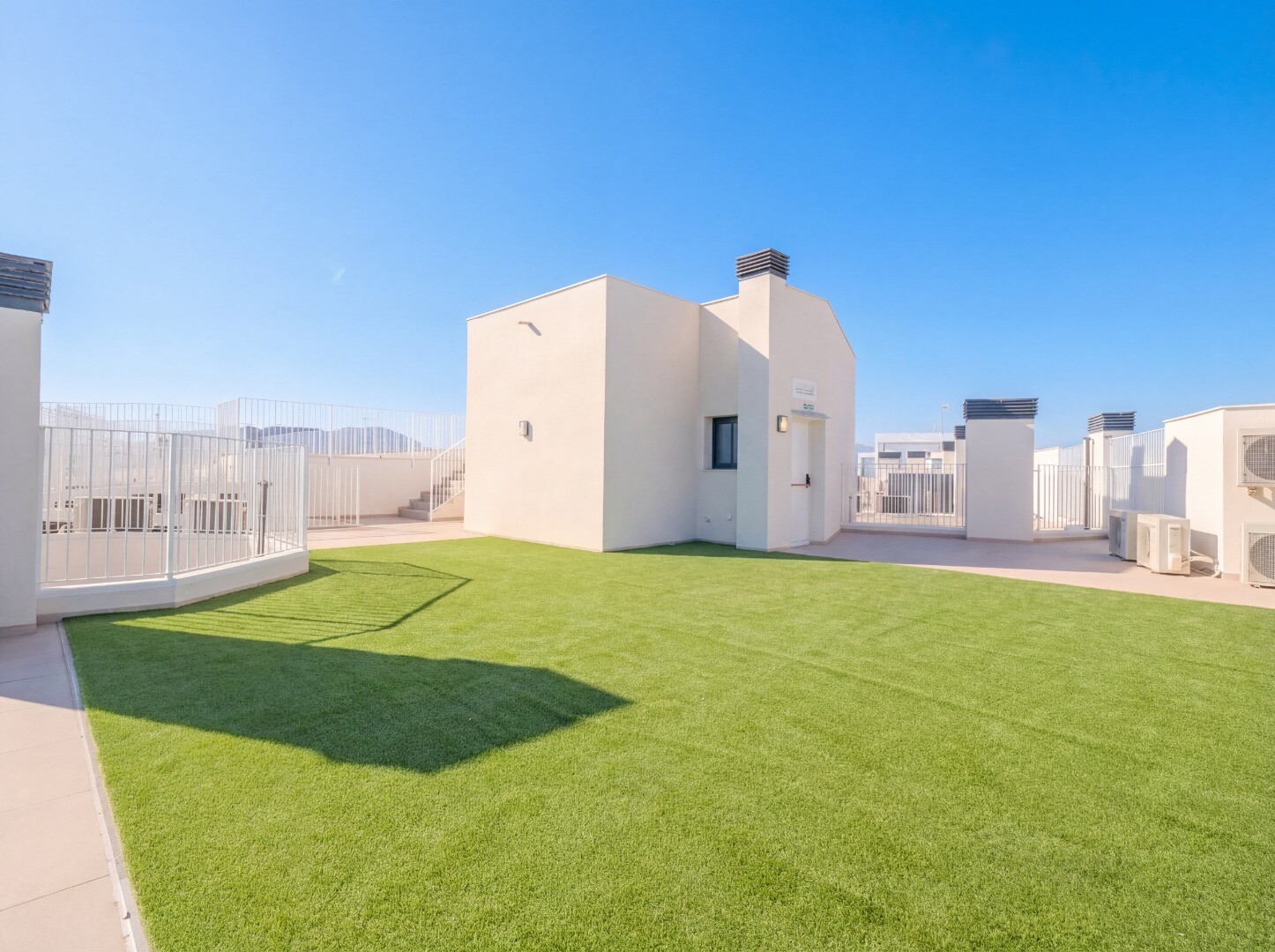 Bostadsområdet erbjuder kompletta gemensamma utrymmen, inklusive gemensam pool och chillout-zon på takterrassen, samt grönområden och lekplats för barn, perfekt för fritid och avkoppling.