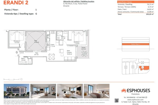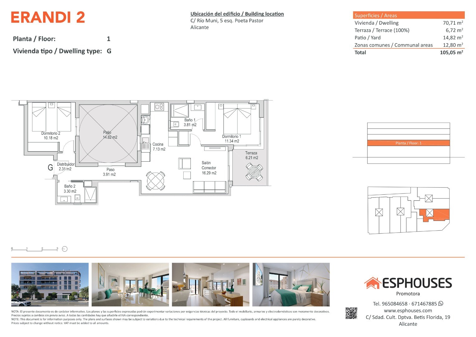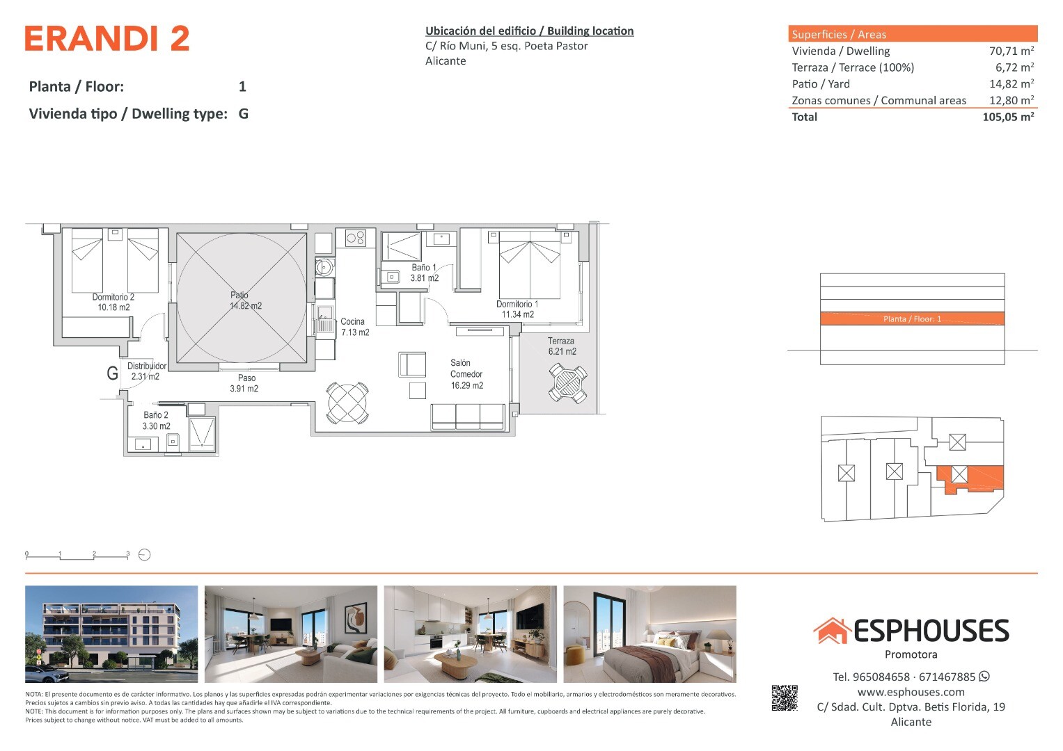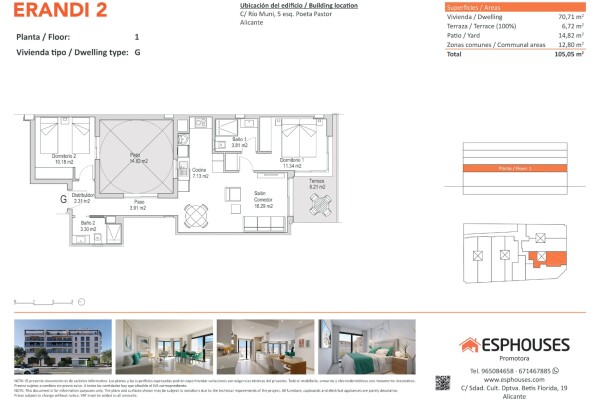 Denna nybyggda lägenhet ligger på första våningen i byggnaden ERANDI 2 och har en total boyta på 70,71 m². Bostaden består av två sovrum med inbyggda garderober, två kompletta badrum, ett vardagsrum med öppen planlösning och ett 6,72 m² stort sydvänt terrass, kompletterat med en rymlig privat uteplats på 14,82 m² – perfekt för att njuta av utomhusl...ivet året runt.