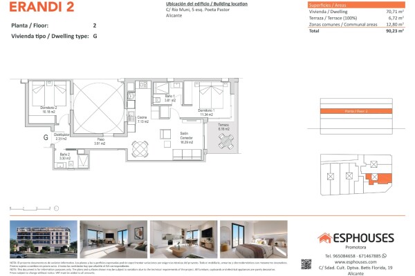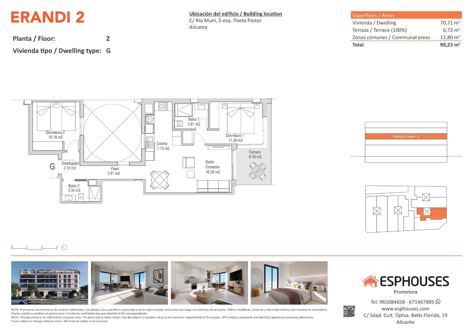 Denna moderna nybyggda lägenhet ligger på andra våningen i byggnaden ERANDI 2 – ett stilrent bostadskomplex med gemensam pool på taket, beläget i det välkända området La Florida, en av Alicantes bäst anslutna och snabbast växande stadsdelar. Bostaden har en yta på 70,71 m² och erbjuder två sovrum med inbyggda garderober, två badrum, ett vardagsrum ...med öppen planlösning samt en härlig södervänd terrass på 6,72 m² – perfekt för att njuta av solen hela dagen.