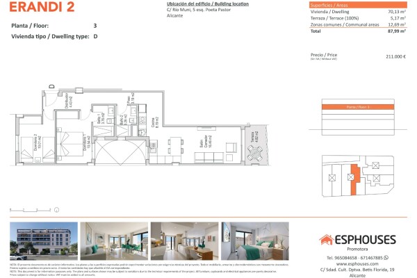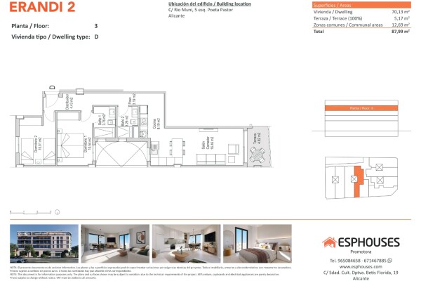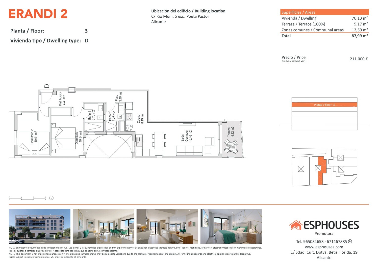 Denna nyproducerade och välplanerade lägenhet ligger på tredje våningen i Edificio ERANDI 2 och utmärker sig med sin moderna design, fina materialval och fantastiska läge i La Florida — ett av Alicantes mest eftertraktade och välförbundna områden.
