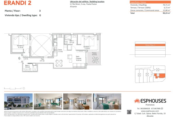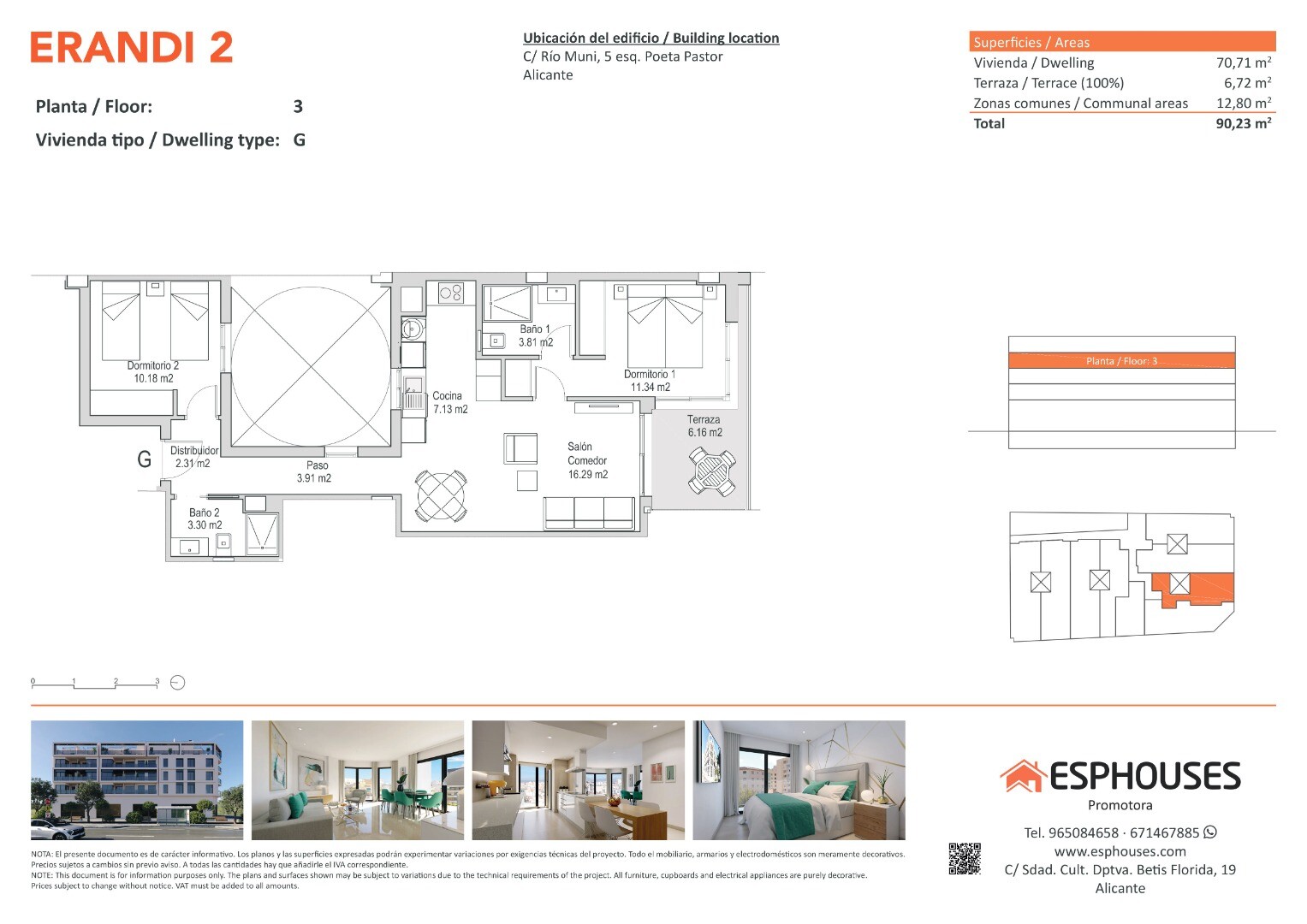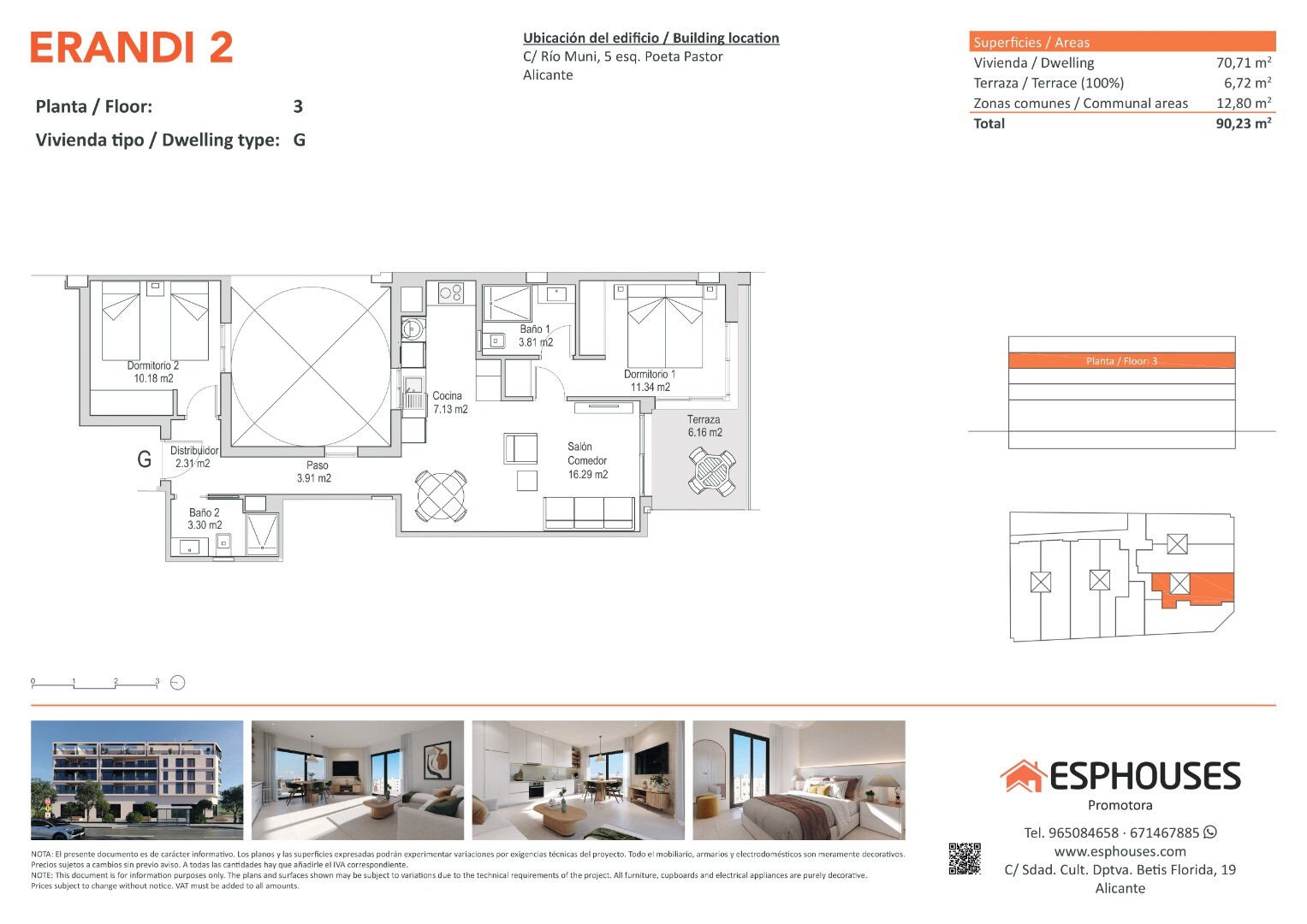 Bostaden har en byggd yta på 70,71 m² och erbjuder två sovrum med inbyggda garderober, två badrum, ett... vardagsrum med öppen planlösning samt en privat terrass på 6,72 m² — perfekt för att njuta av det medelhavska klimatet.