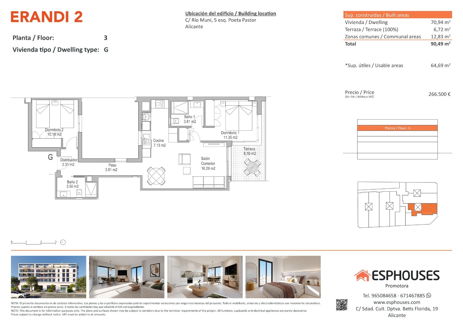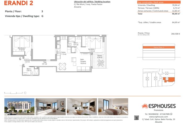 Bostaden har en byggd yta på 70,94 m² och erbjuder två sovrum med inbyggda garderober, två badrum, ett... vardagsrum med öppen planlösning samt en privat terrass på 6,72 m² — perfekt för att njuta av det medelhavska klimatet.