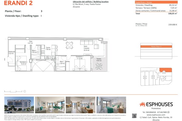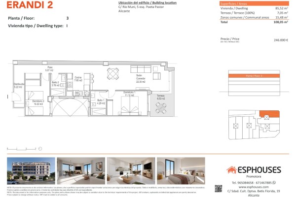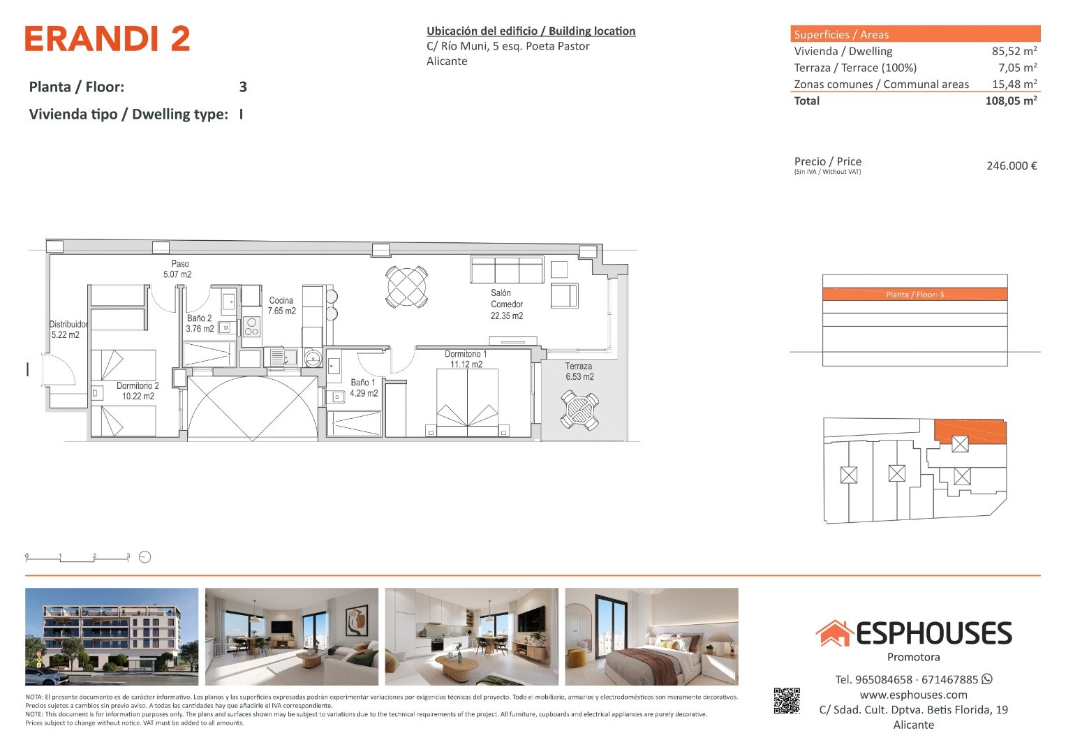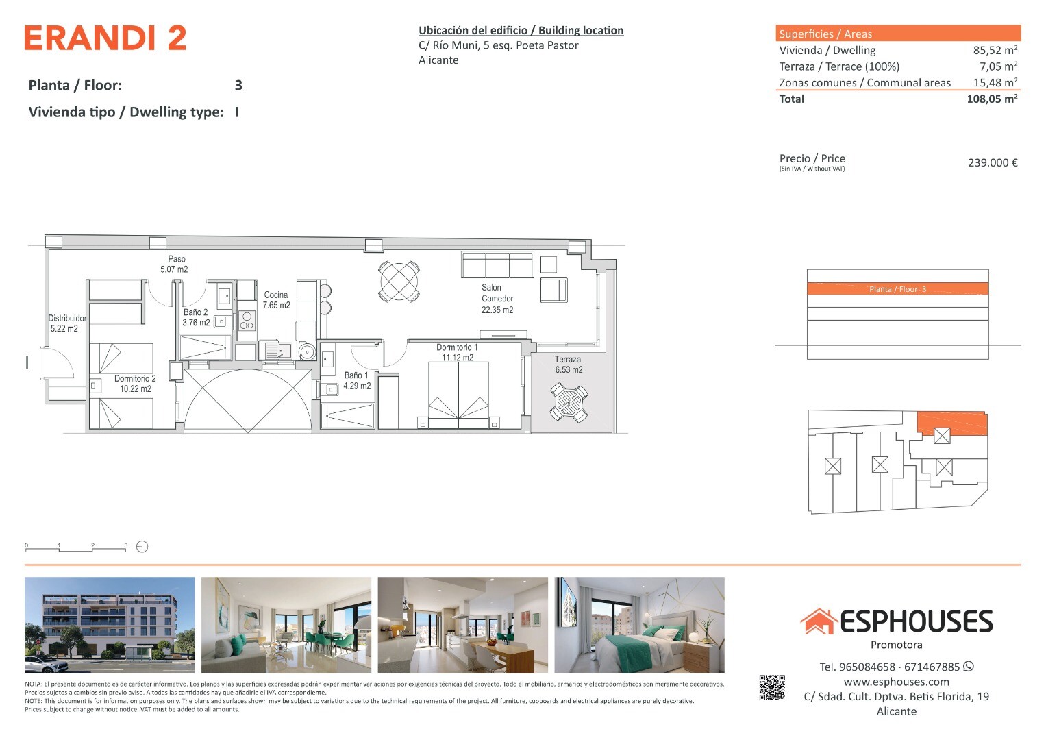 Denna ljusa nyproduktion ligger på tredje våningen i ERANDI 2 och erbjuder en boyta på 85,52 m². Med söderläge och smart planlösning är den ett perfekt val i den populära och välanslutna stadsdelen La Florida i Alicante.