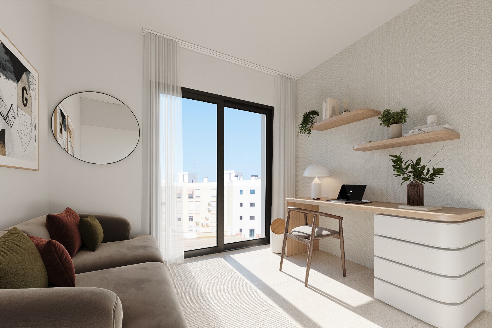 Lägenheten är byggd med material av högsta kvalitet och har moderna finishar. Det finns förinstallation för luftkonditionering. Byggnaden erbjuder även tillgång till en gemensam pool på taket samt valfria parkeringsplatser och förråd.