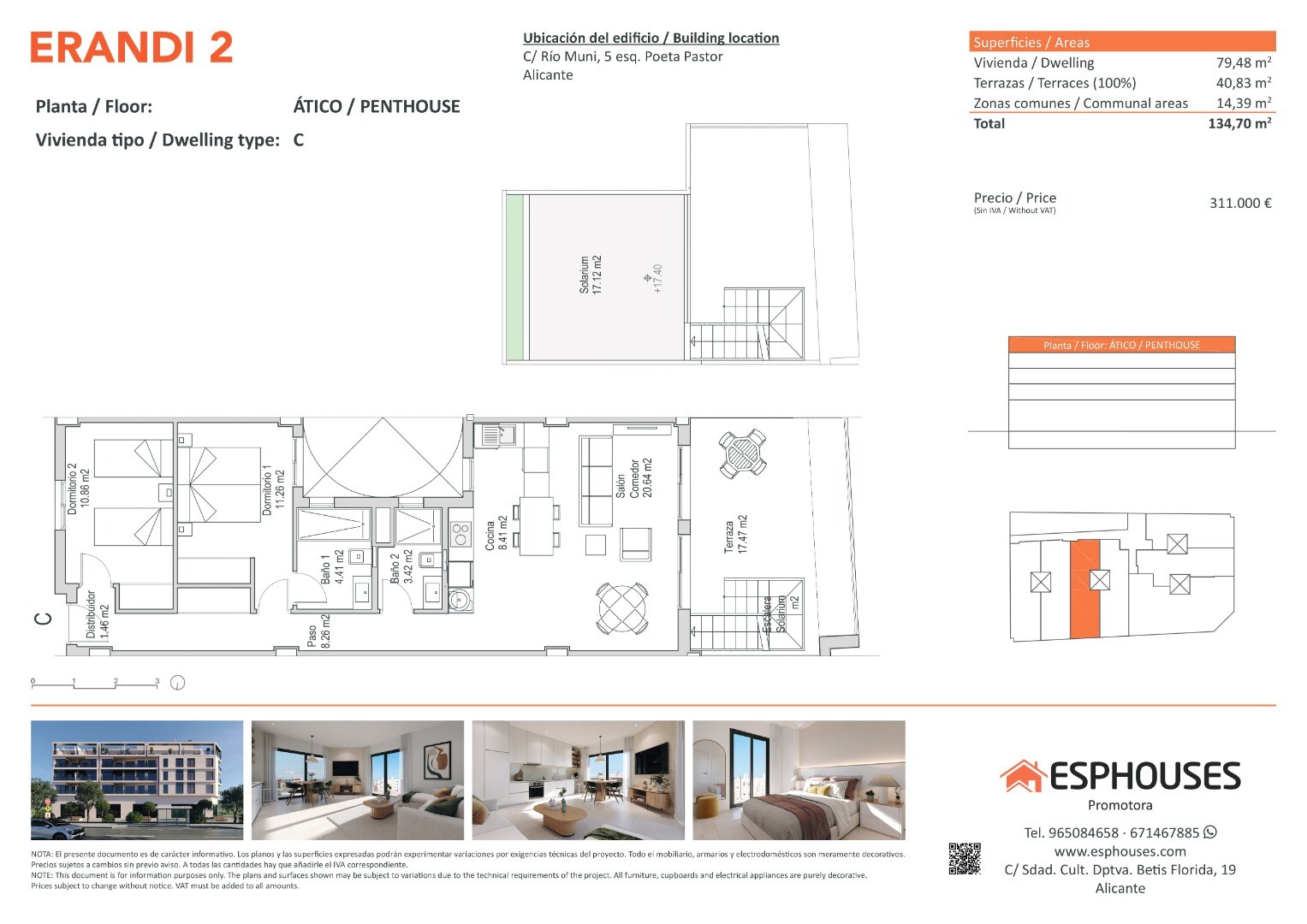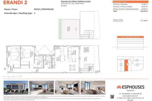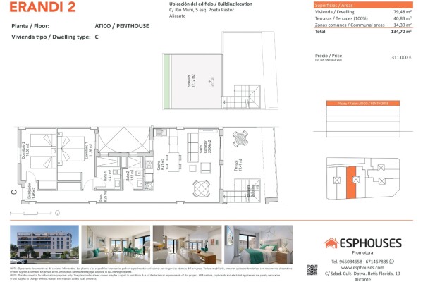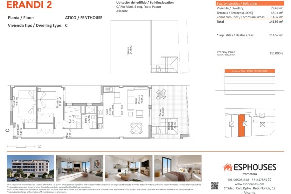 Upptäck denna ljusa penthouse-lägenhet på fjärde våningen i byggnaden ERANDI 2 i det välkända och välanslutna La Florida-området i Alicante. Med en boyta på 79,48 m² innehåller bostaden två sovrum med inbyggda garderober, två badrum och ett rymligt vardagsrum med modern öppen planlösning och kök.