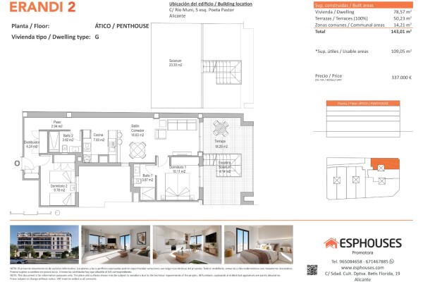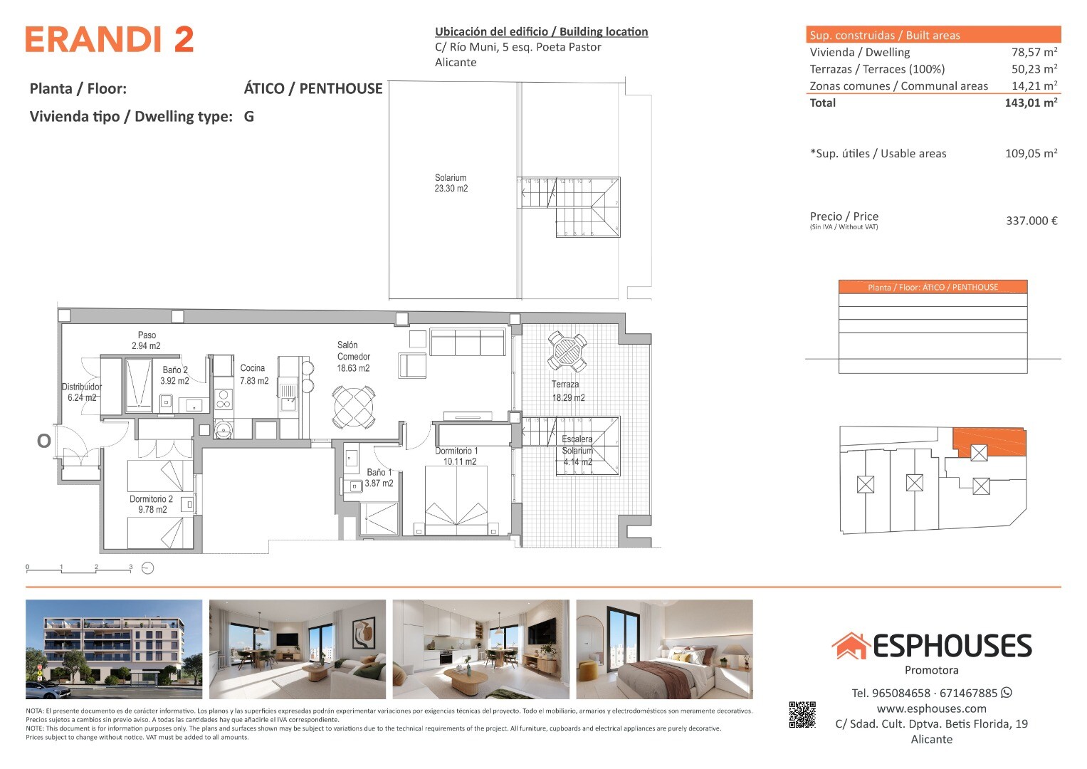 Denna eleganta nyproducerade takvåning ligger på fjärde våningen i byggnaden ERANDI 2, belägen i det välkända området La Florida – ett väletablerat och välanslutet kvarter i Alicante. Bostaden har en boyta på 78,57 m² och erbjuder två sovrum med inbyggda garderober, två kompletta badrum och ett ljust vardagsrum med öppen planlösning och kök i moder...n stil.