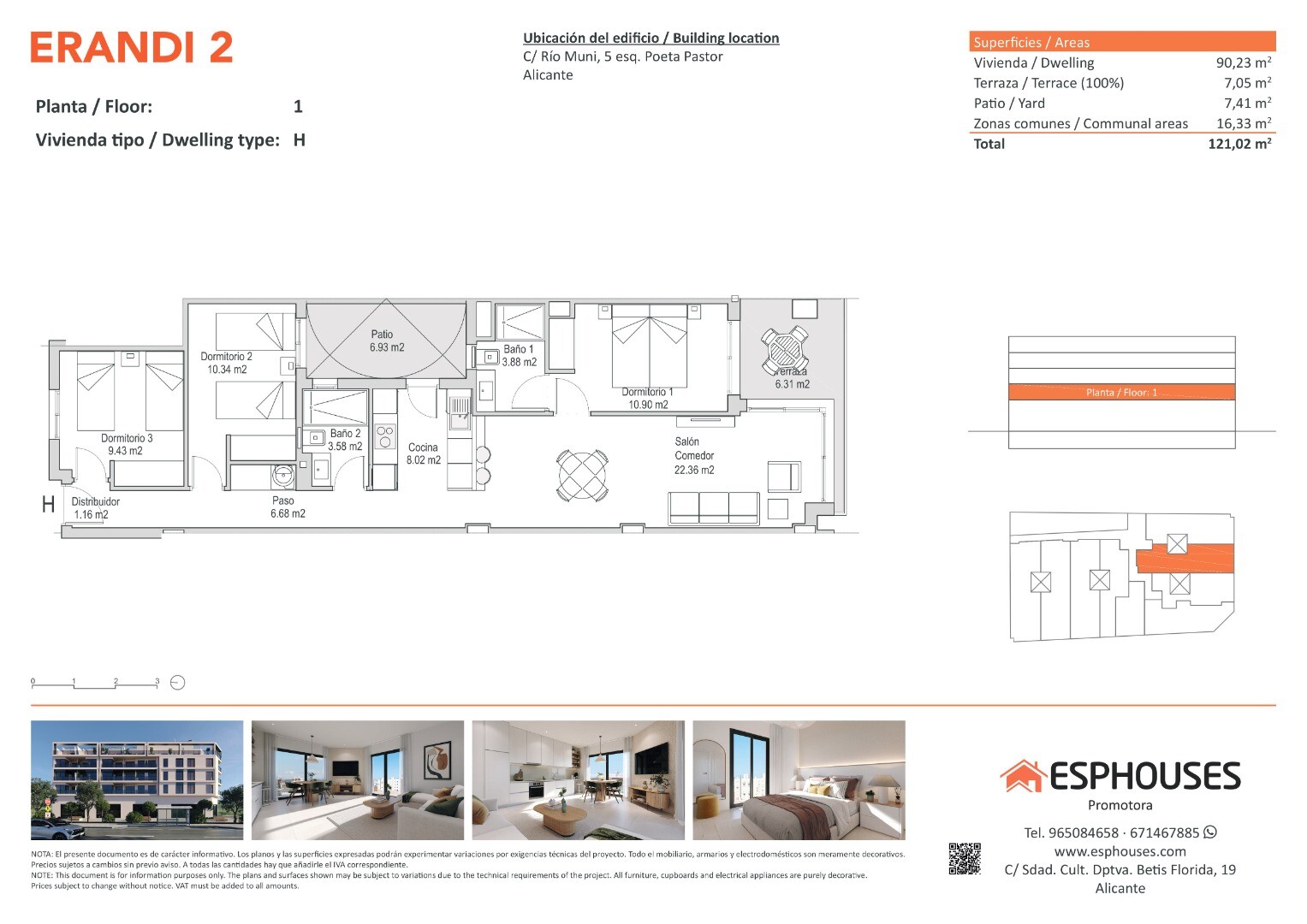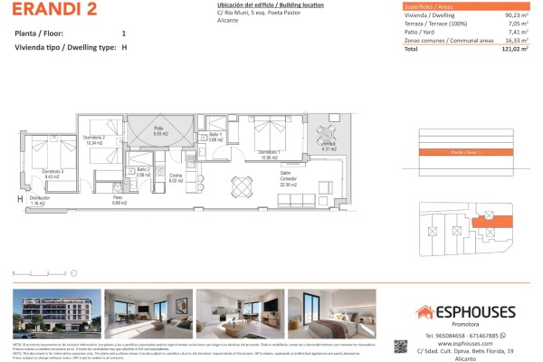 Denna nybyggda lägenhet ligger på första våningen i ERANDI 2-byggnaden och har en boyta på 90,23 m². Den består av tre sovrum med inbyggda garderober, två kompletta badrum, ett vardagsrum med öppen planlösning och kök, en terrass på 7,05 m² i söderläge samt en privat uteplats på 7,41 m² — perfekt för att njuta av utomhuslivet året runt.