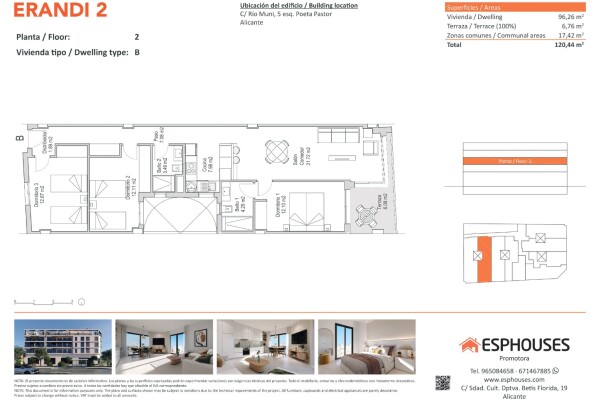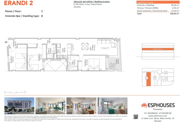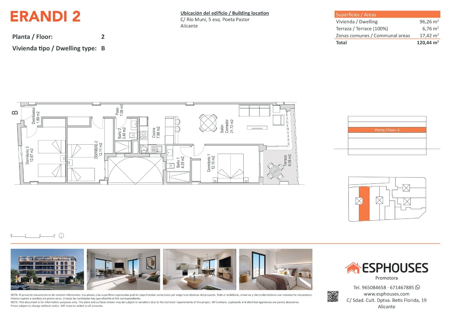 Denna moderna nyproducerade bostad ligger på andra våningen i byggnaden ERANDI 2 och kombinerar design, komfort och ett fantastiskt läge i det välkända området La Florida – en av de mest etablerade och välförbundna delarna av Alicante. Med en byggyta på 96,26 m² erbjuder bostaden tre sovrum med inbyggda garderober, två kompletta badrum, ett vardags...rum med öppen planlösning och en västvänd terrass på 6,76 m² – perfekt för att njuta av eftermiddagssolen.