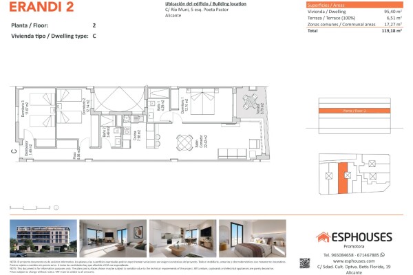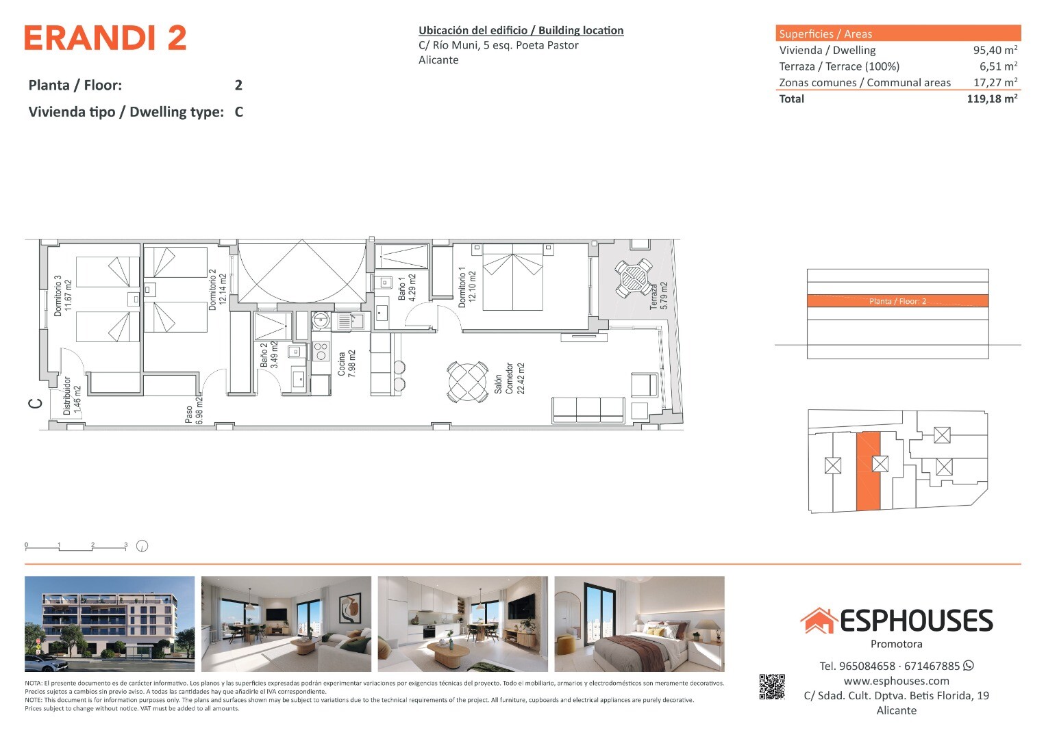 Denna moderna nyproducerade bostad ligger på andra våningen i byggnaden ERANDI 2 – ett samtida boende med gemensam pool på taket, beläget i det välkända området La Florida, en välansluten stadsdel med full service i Alicante. Bostaden har en boyta på 95,40 m² och erbjuder tre sovrum med inbyggda garderober, två kompletta badrum, ett rymligt vardags...rum med öppen planlösning samt en västvänd terrass på 6,51 m² – perfekt för att njuta av eftermiddagssolen.