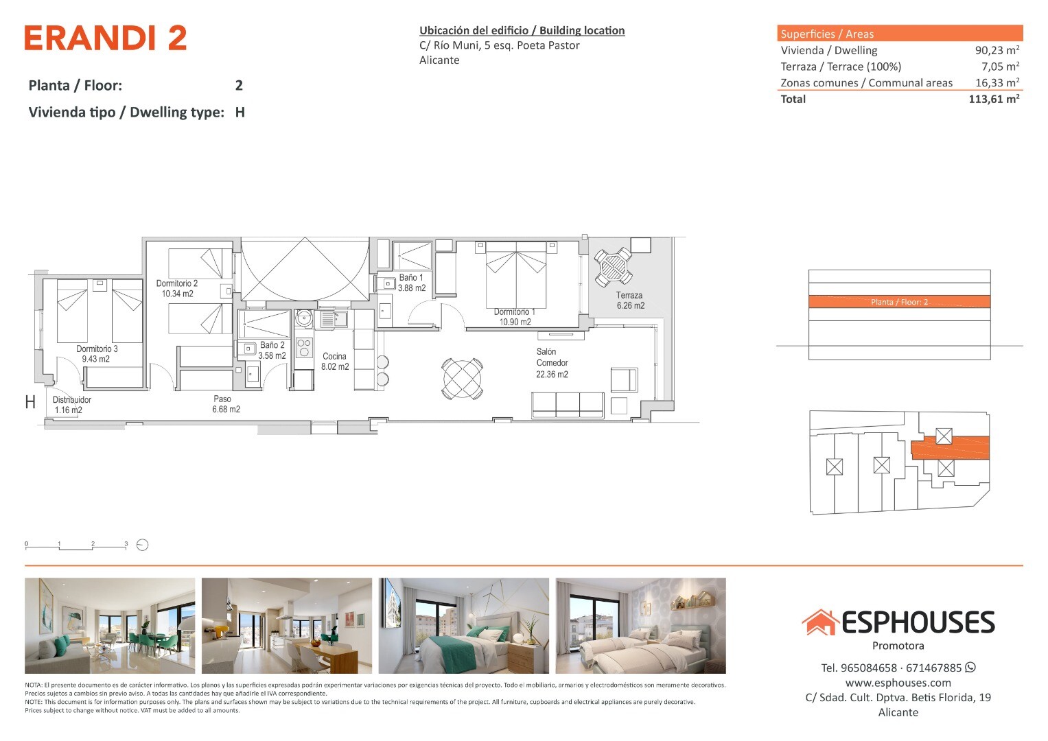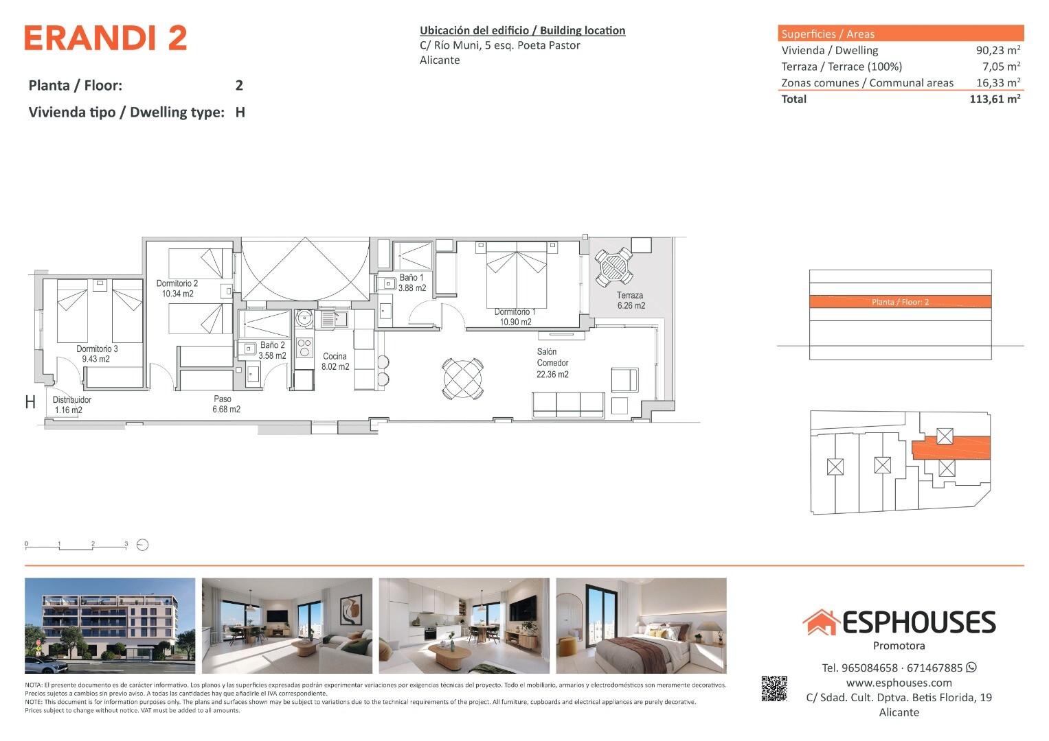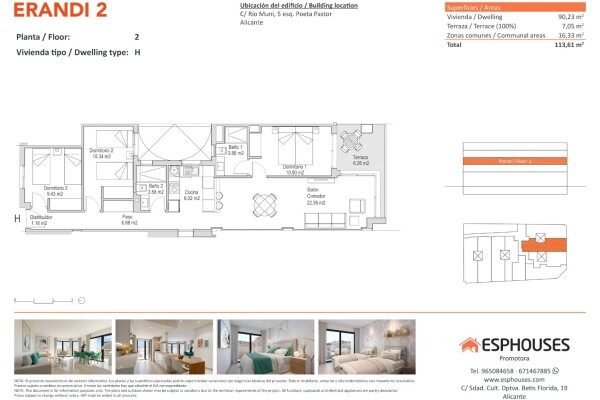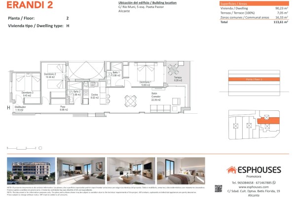 Denna ljusa nyproducerade bostad är belägen på andra våningen i byggnaden ERANDI 2, i det populära området La Florida – en välansluten stadsdel med komplett service i Alicante. Lägenheten har en boyta på 90,23 m² och erbjuder tre sovrum med inbyggda garderober, två badrum, ett vardagsrum med öppen planlösning samt en solig terrass på 7,05 m² i söde...rläge – perfekt för att njuta av solen hela dagen.