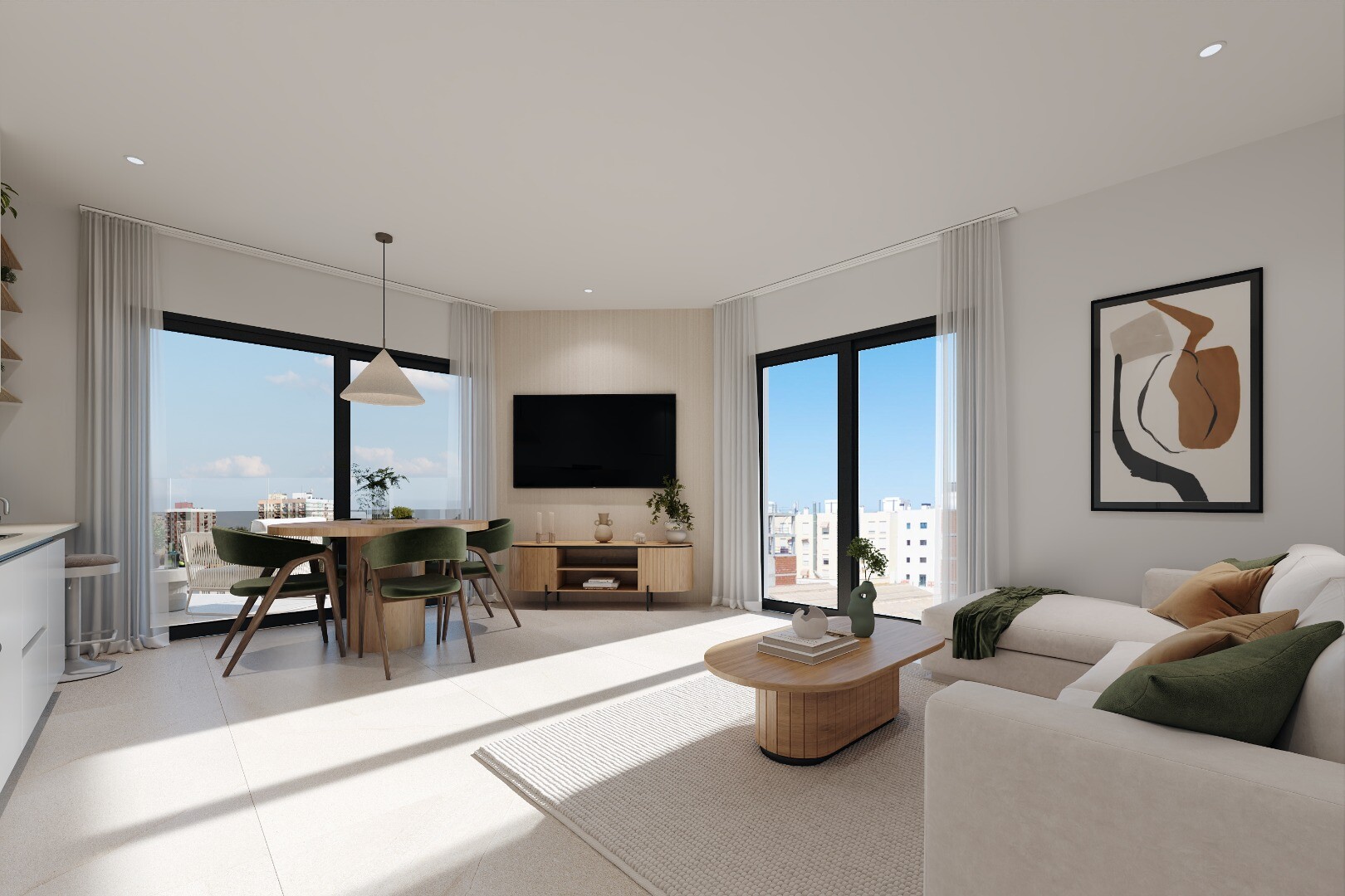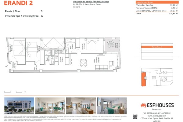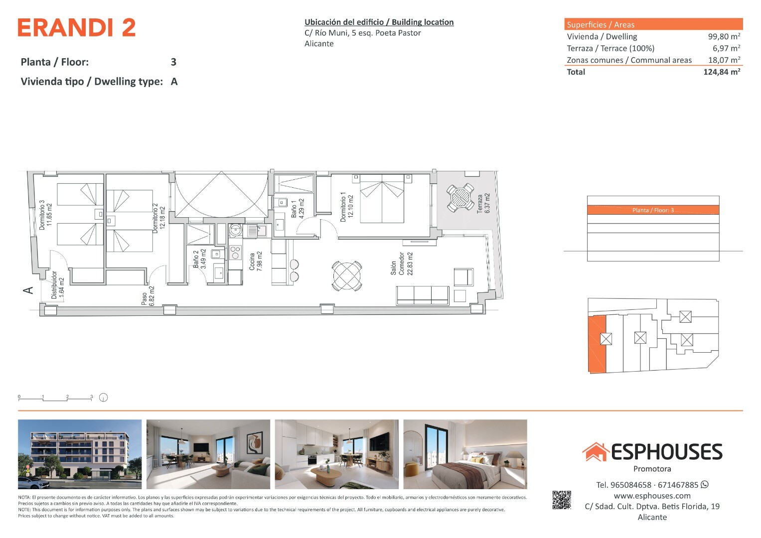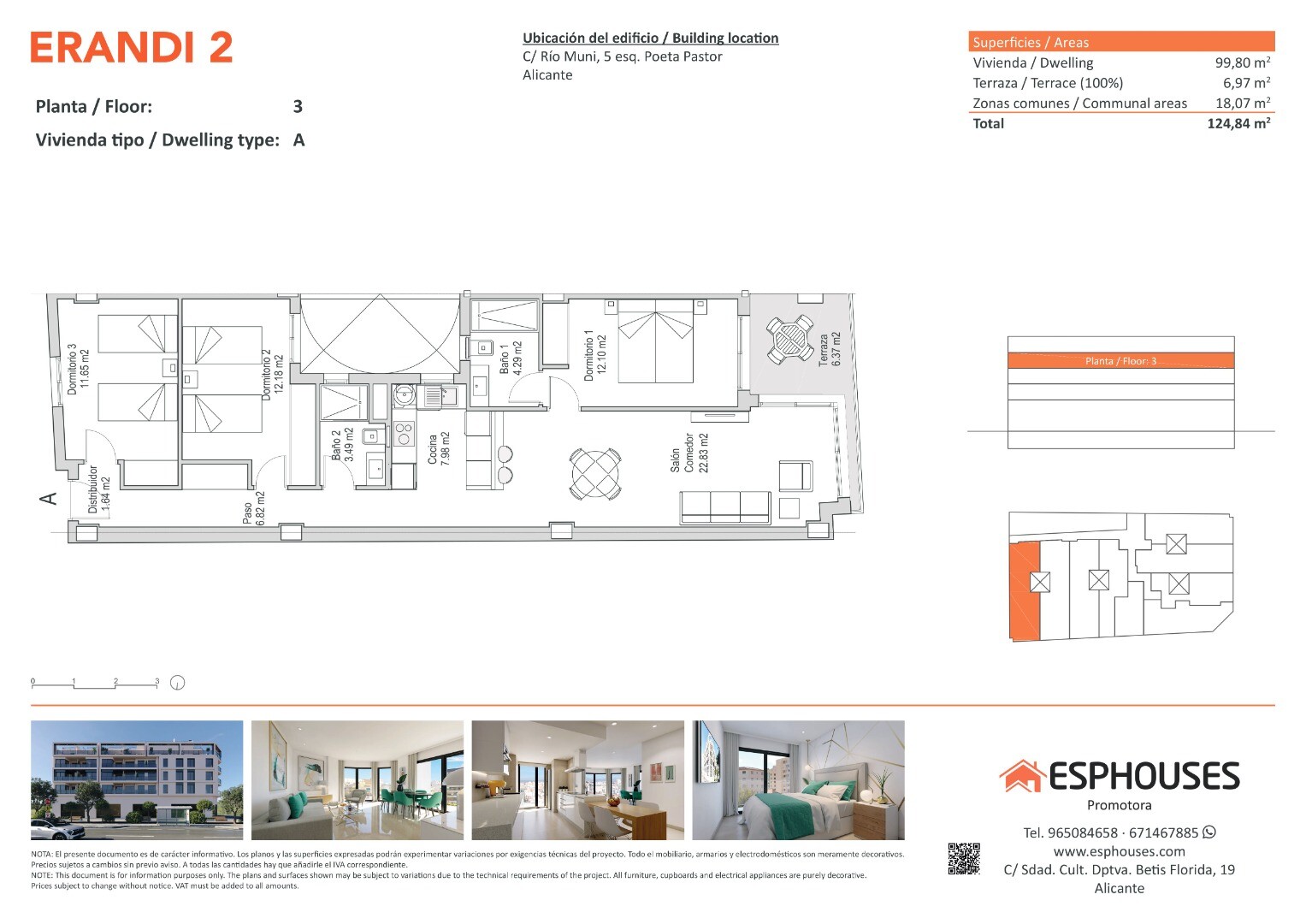 Denna rymliga nyproducerade lägenhet ligger på tredje våningen i det moderna bostadshuset ERANDI 2, med gemensam pool på taket, beläget i det väletablerade och välanslutna området La Florida i Alicante. Bostaden har en yta på 99,80 m² och består av tre sovrum med inbyggda garderober, två badrum, ett stort vardagsrum med öppen planlösning samt en vä...stvänd terrass på 6,97 m² – perfekt för eftermiddagssolen.