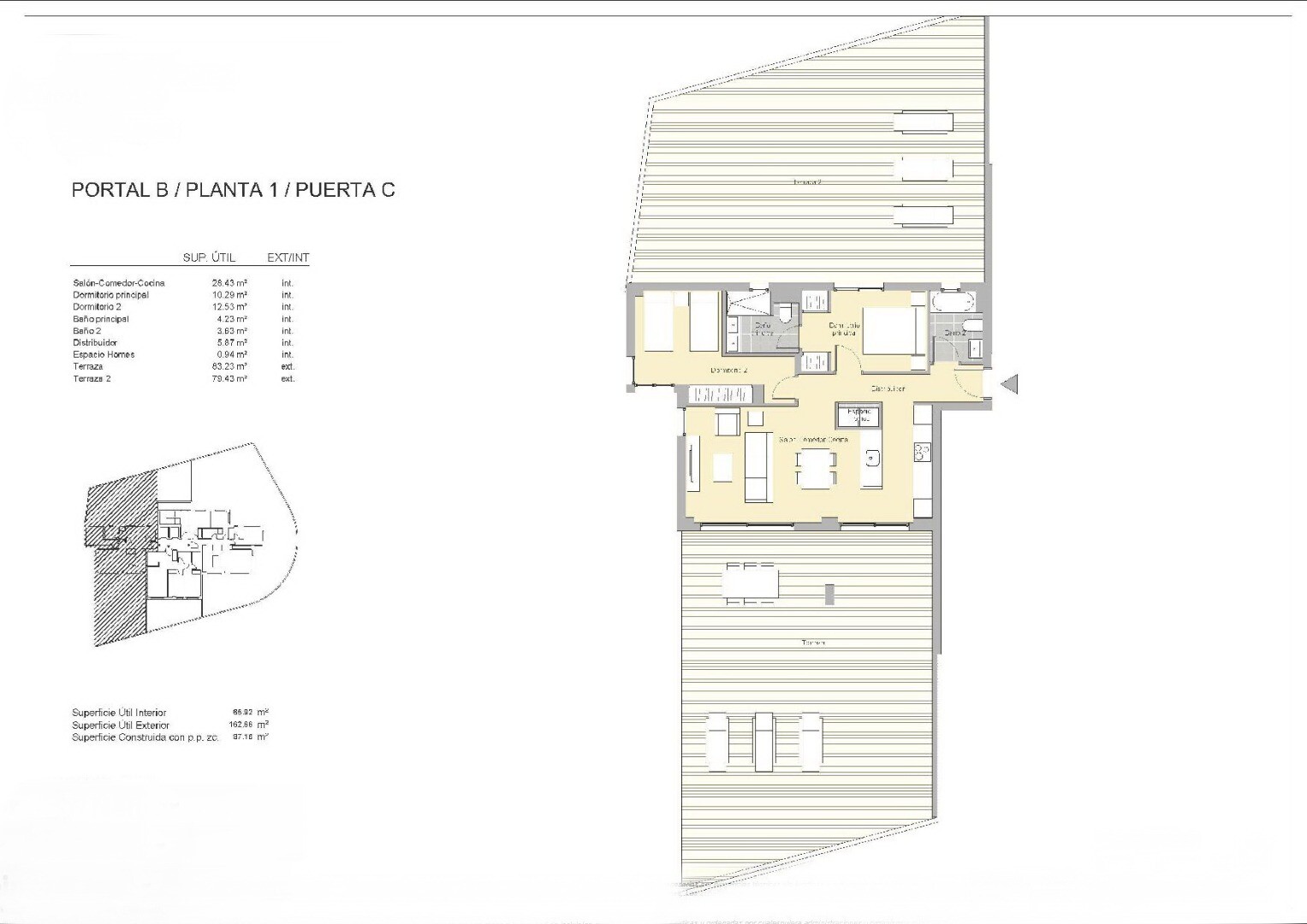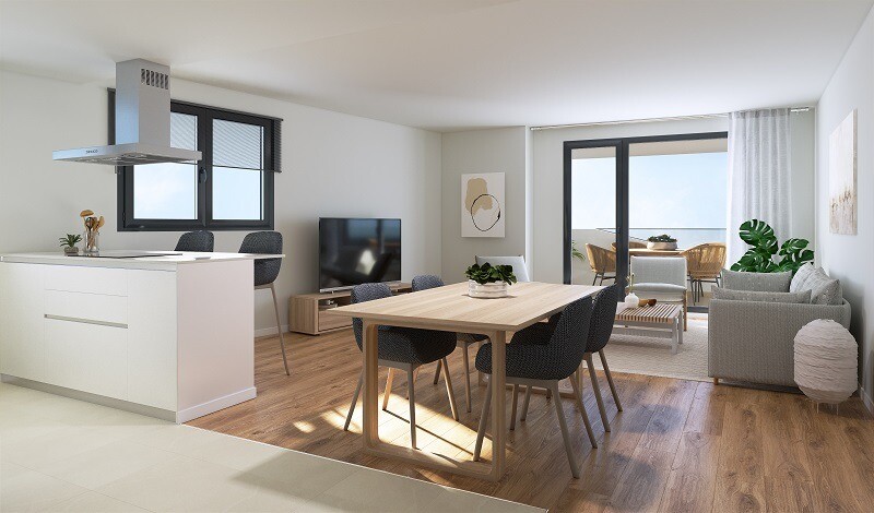 Bottenvåning med 163m² terrass, parkeringsplats, förråd, lekplats, pool, grönområden, cykelförråd, gourmetrum, etc.
