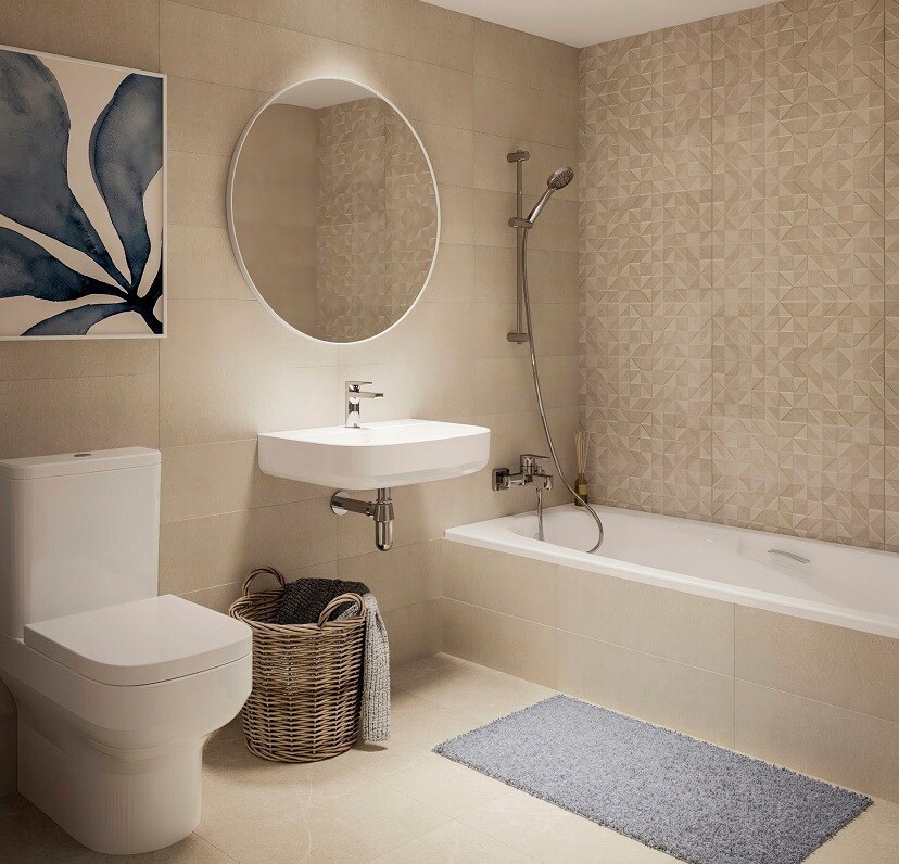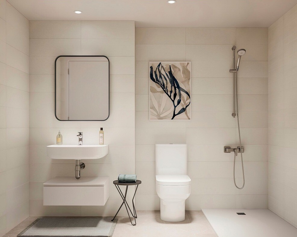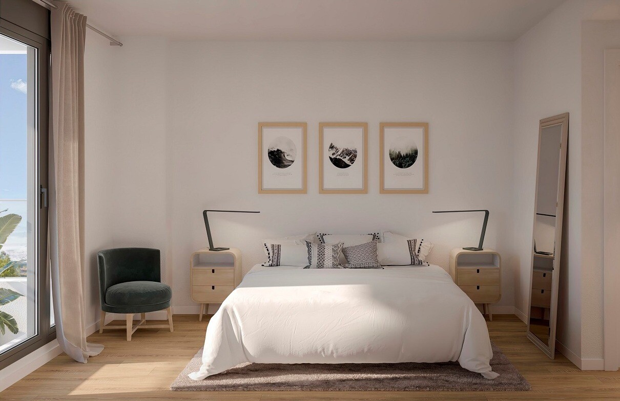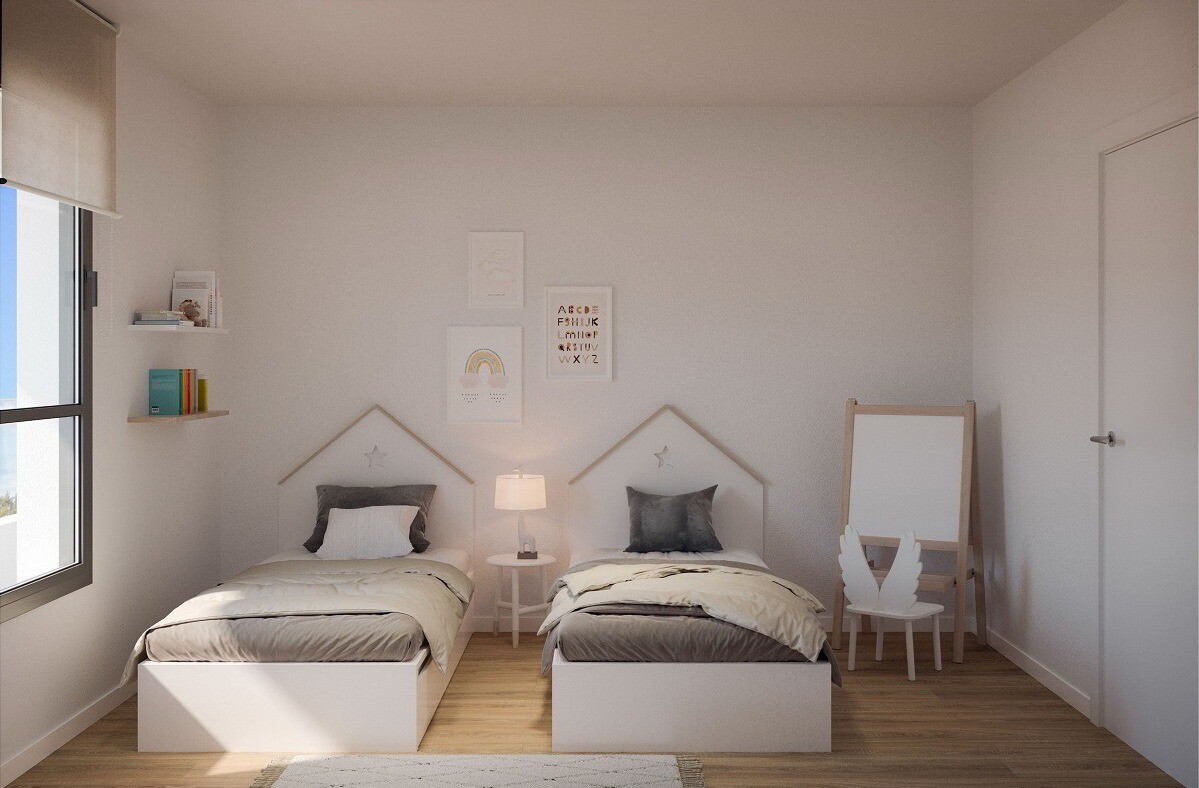 Nytt bostadsområde som inrymmer 2- och 3-rumshus med terrass, pooler och gemensamma utrymmen.