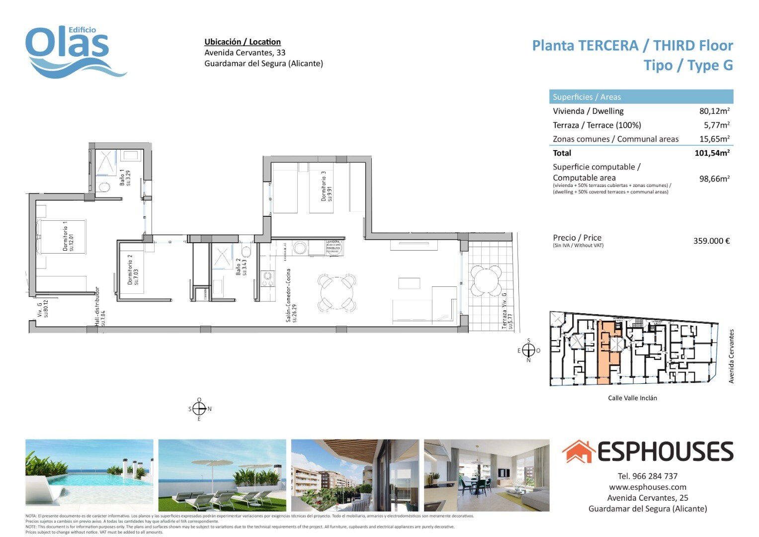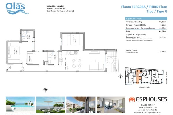 Den byggda ytan för lägenheten kommer att vara 98,66 kvadratmeter, vilket ger gott om utrymme för att leva och koppla av. Dessutom kommer det att finnas en terrass på 5,77 kvadratmeter, perfekt för att njuta av Medelhavsklimatet och skapa en utomhusatmosfär.