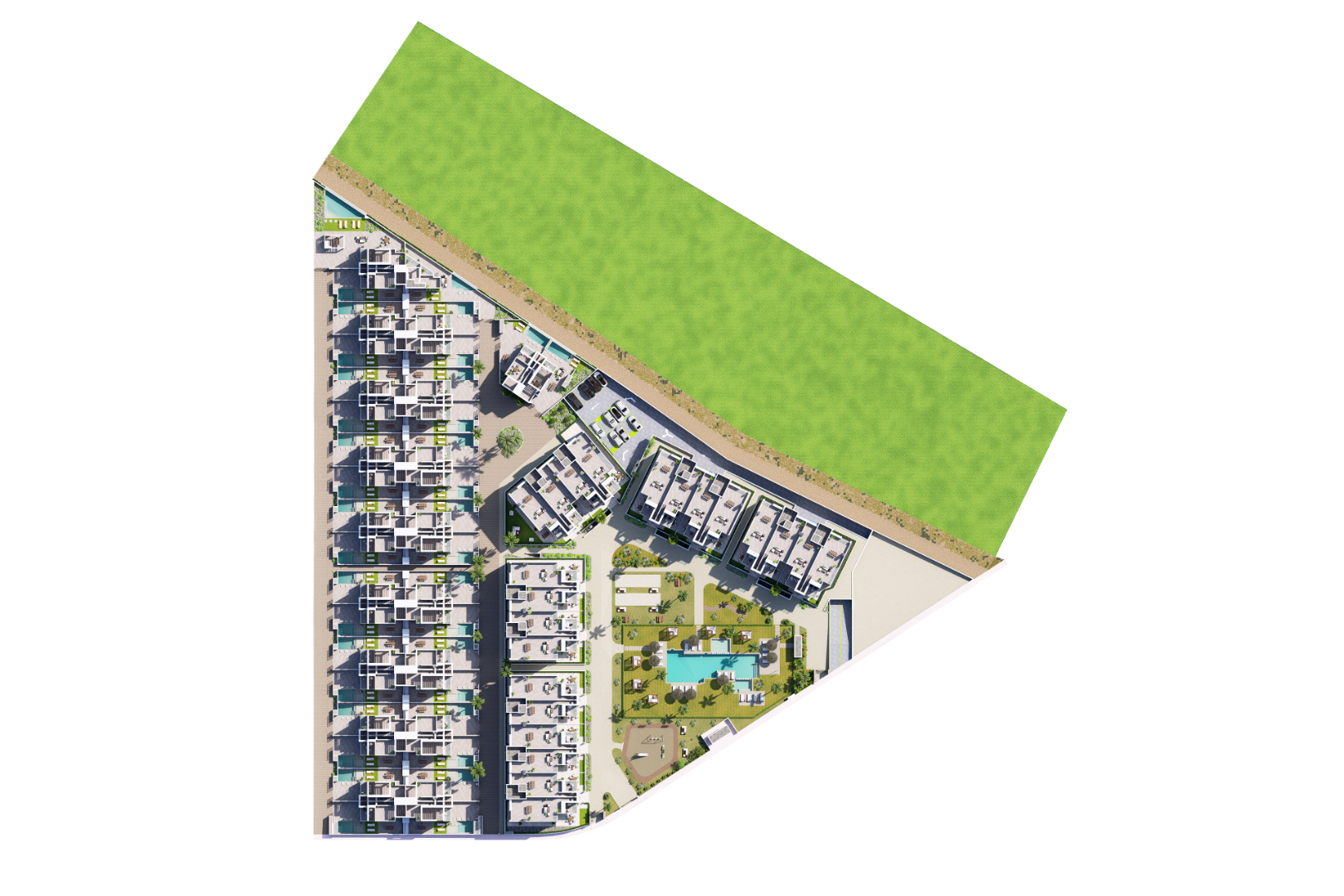 Bostadsområdet erbjuder fantastiska gemensamma faciliteter såsom en stor central strandpool, balinesiska sängar, jacuzziområde, barnpool, två boulebanor, lekplats, gym samt bastu/spa.