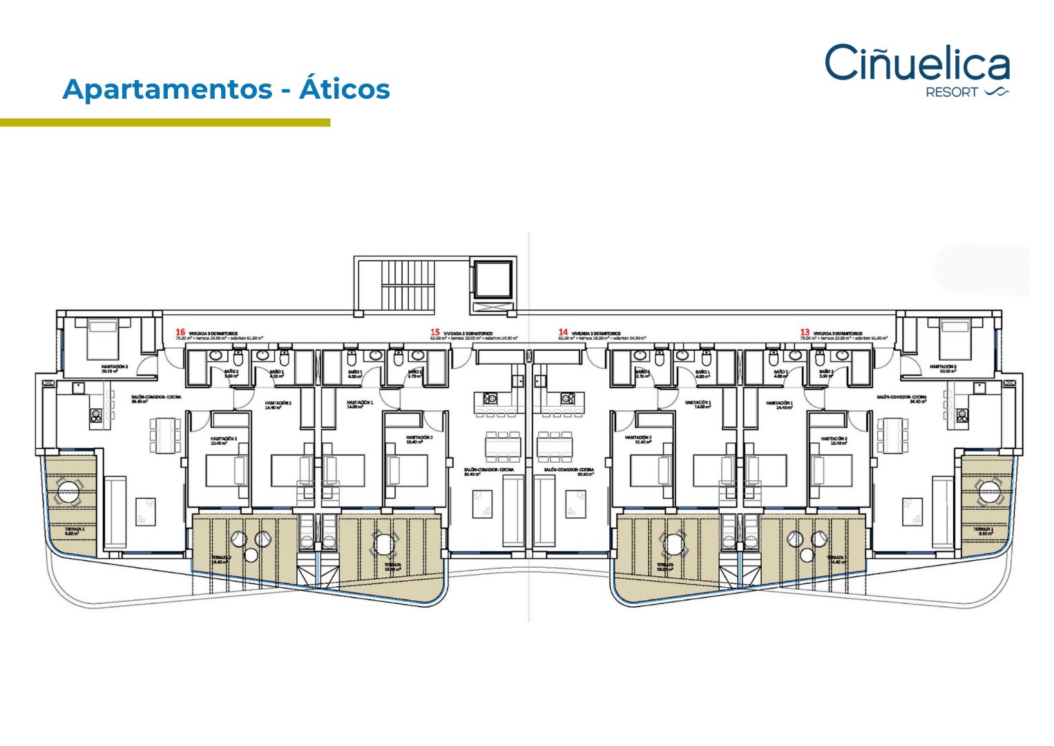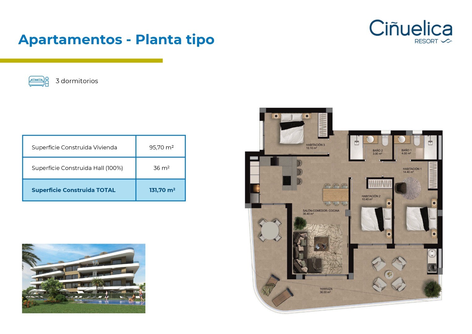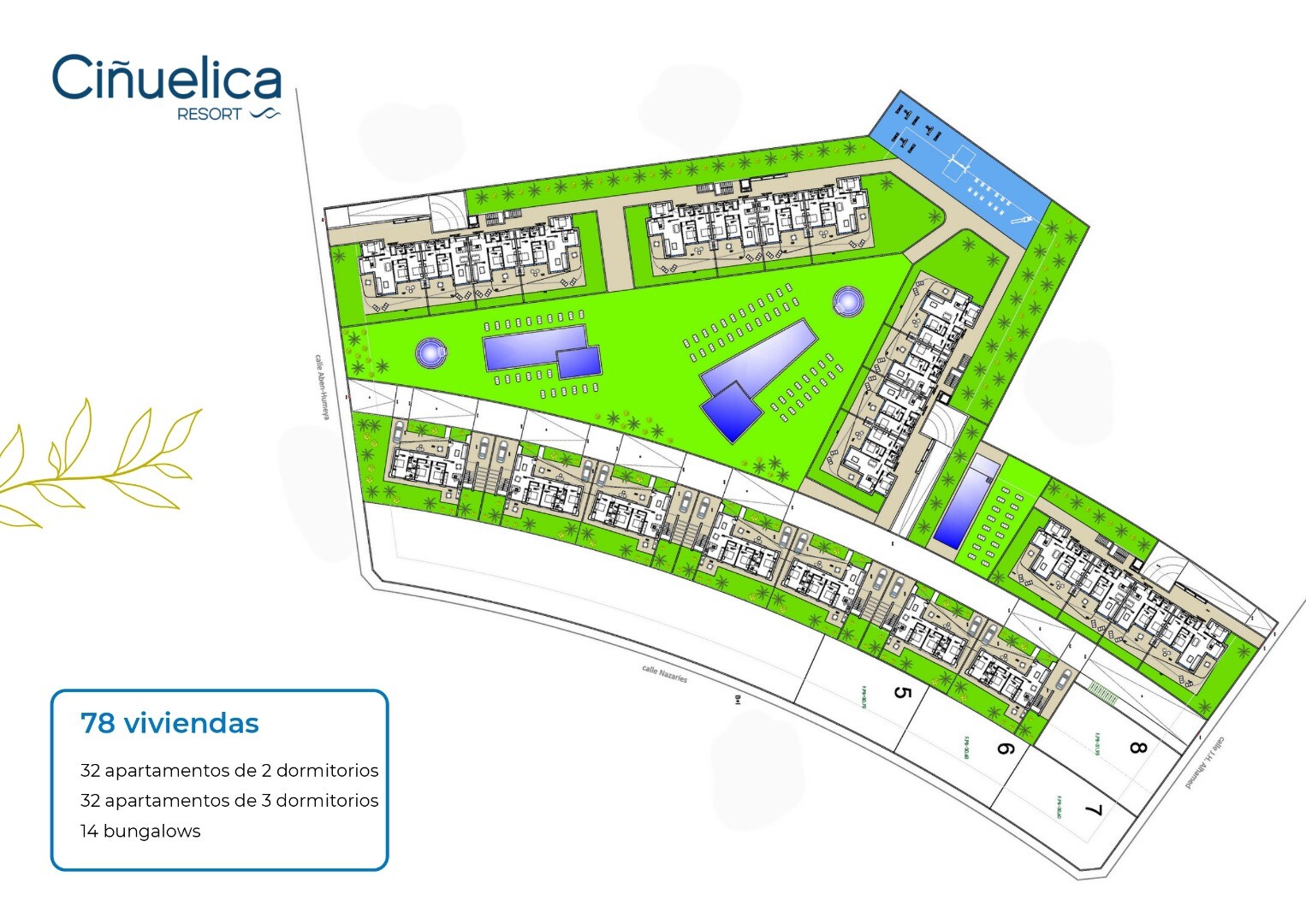 La Cinuelica Resort är ett residens som består av 4 flerfamiljshus med totalt 32 2-rumslägenheter, 32 3-rumslägenheter och 14 bungalower med 3 sovrum. Lägenheterna levereras med underjordisk parkeringsplats och förråd, köksmaskiner (kyl-frys-kombination, keramikhäll, ugn, mikrovågsugn, diskmaskin, tvättmaskin och fläkt), elektriska fönsterluckor, a...erotermisk vattenpanna, förinstallerad A/C genom luftkanaler och för taksolarier förinstallation för utekök och Jaccuzi. De gemensamma utrymmena inkluderar anlagda trädgårdar med 3 pooler och 2 uppvärmda jacuzzis, ett gym utomhus och en lekplats. Residenset ligger 1000 meter från stranden i Punta Prima och 500 meter från kommersiella centra med snabbköp, barer, restauranger, bankomat, affärer etc.