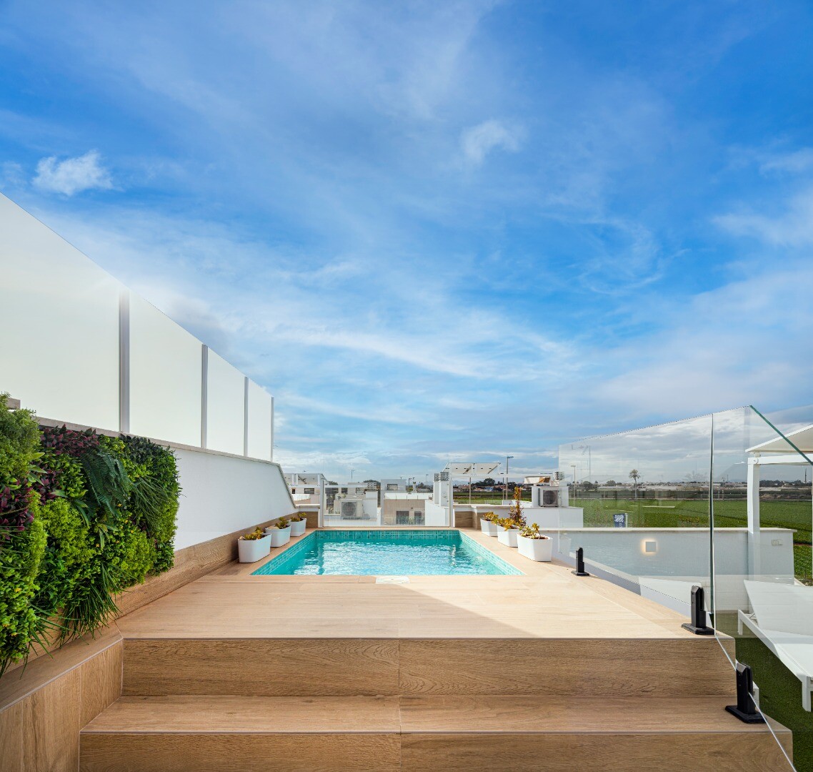 Denna bostad "Portomarina Higuericas" ligger bara 500 meter från stranden. Om du vill bo 500 meter från den populäraste stranden i Orihuela Costa, passa på att ta del av denna möjlighet eftersom det bara finns 2 kvar, med leveransdatum sommaren 2025. Men denna nyckelfärdiga takvåning kommer inte att levereras med alla möbler och installationer förr...än i början av 2026. Alla hus har en privat pool, köksapparater (induktionshäll, köksfläkt, ugn, mikrovågsugn, kyl-frys och tvättmaskin), fullt utrustade badrum med duschväggar, handfat med spegel och golvvärme, förinstallation av luftkonditionering med luftkanaler, LED-belysning inomhus och utomhus, dusch med varmvatten på terrassen. Husen har energiklass A, eftersom de använder dubbla Climalit-glas och en solpanel. Torre de la Horadada centrum, med sina många barer och restauranger, ligger cirka 1 800 meter bort. Murcias och Alicantes flygplatser kan nås på cirka 35 minuter för Murcia respektive 45 minuter för Alicante.