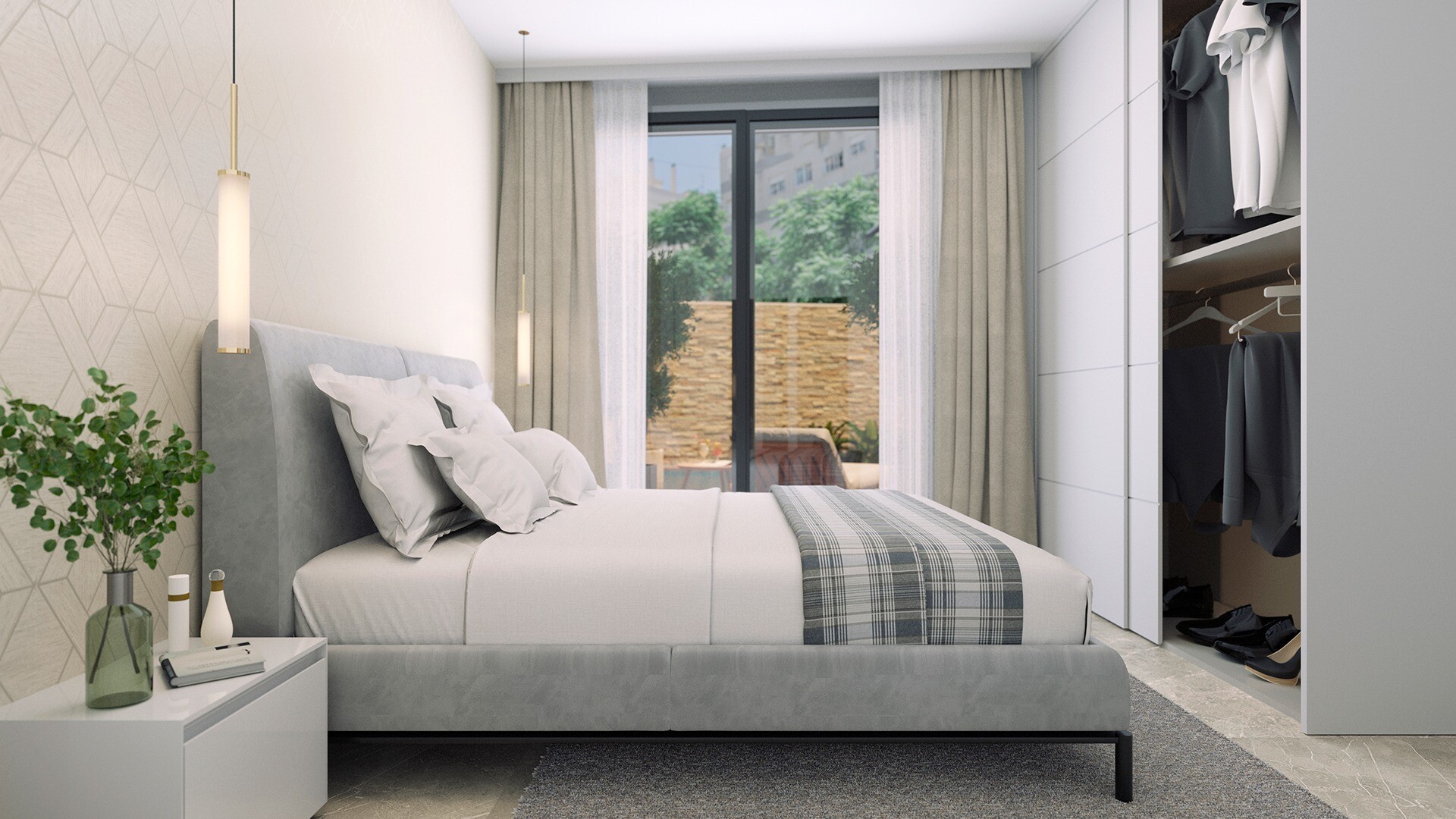 Byggnaden har utmärkta gemensamma utrymmen: en pool på bottenvåningen med barnområde, gym och bastu, samt en takterrass med chill-outzoner omgivna av frodig grönska.