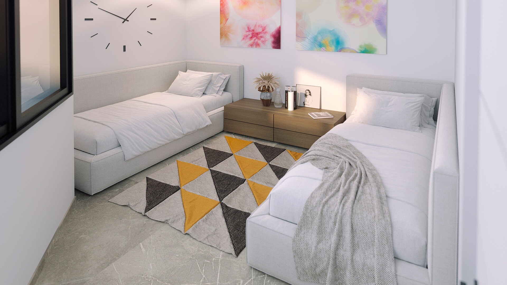 Byggnaden har utmärkta gemensamma utrymmen: en pool på bottenvåningen med barnområde, gym och bastu, samt en takterrass med chill-outzoner omgivna av frodig grönska.