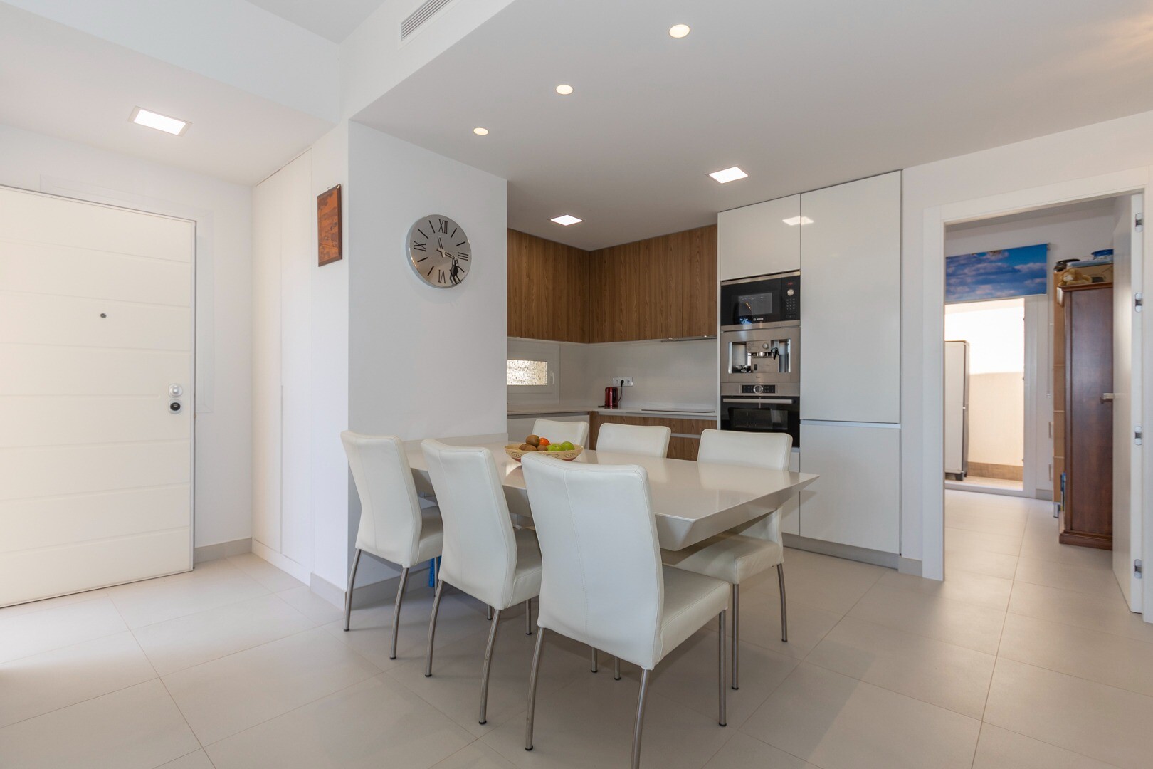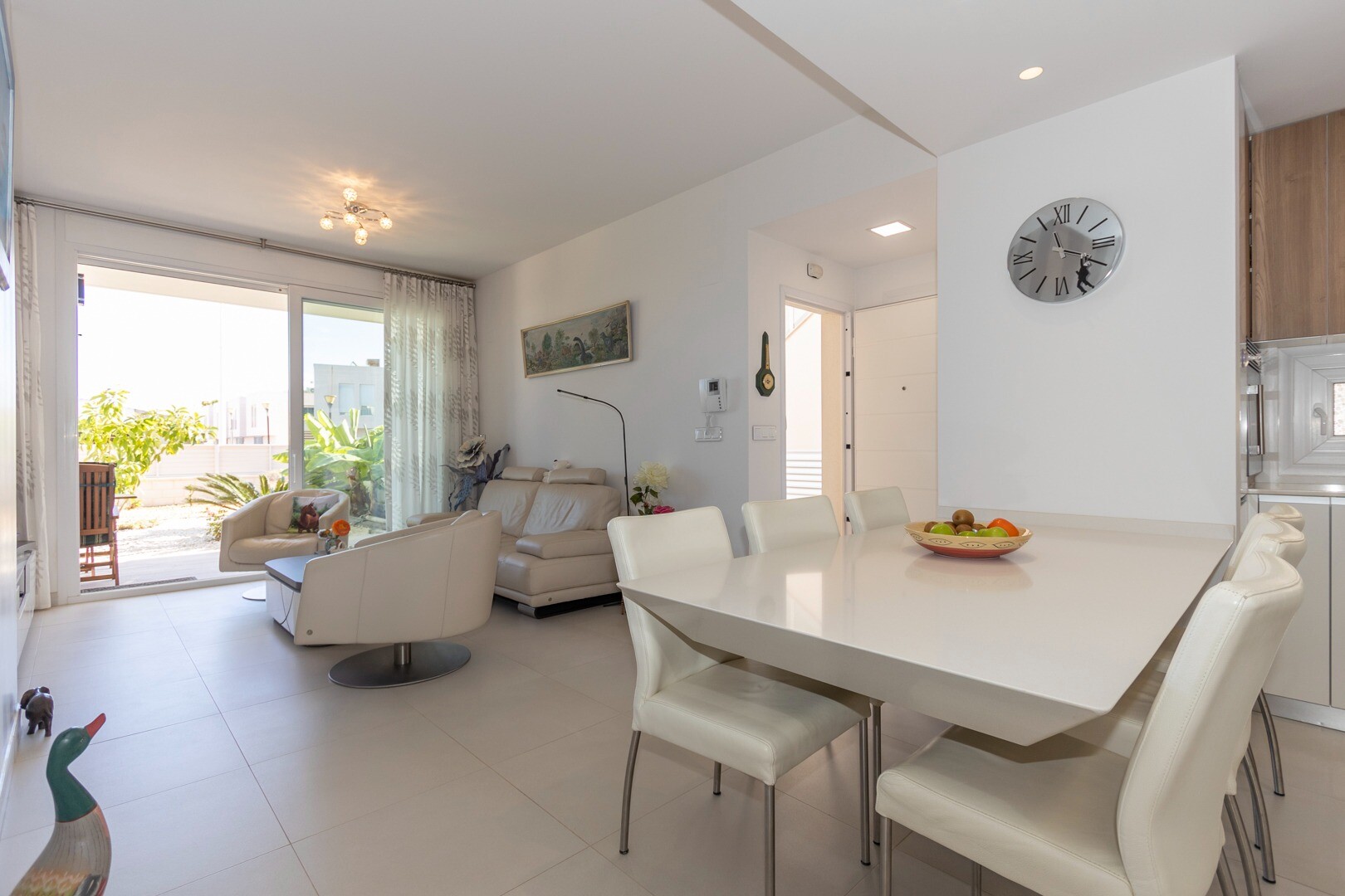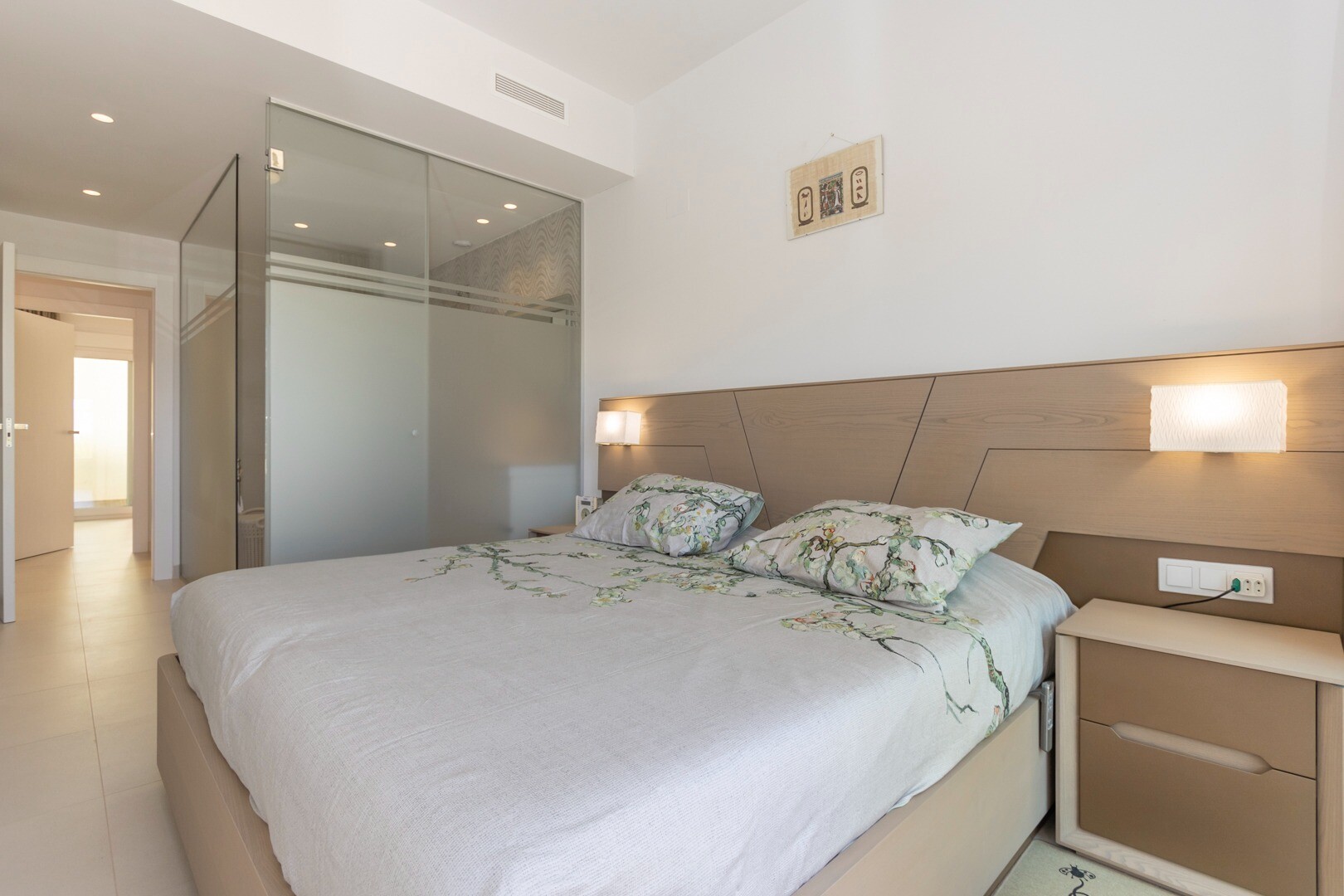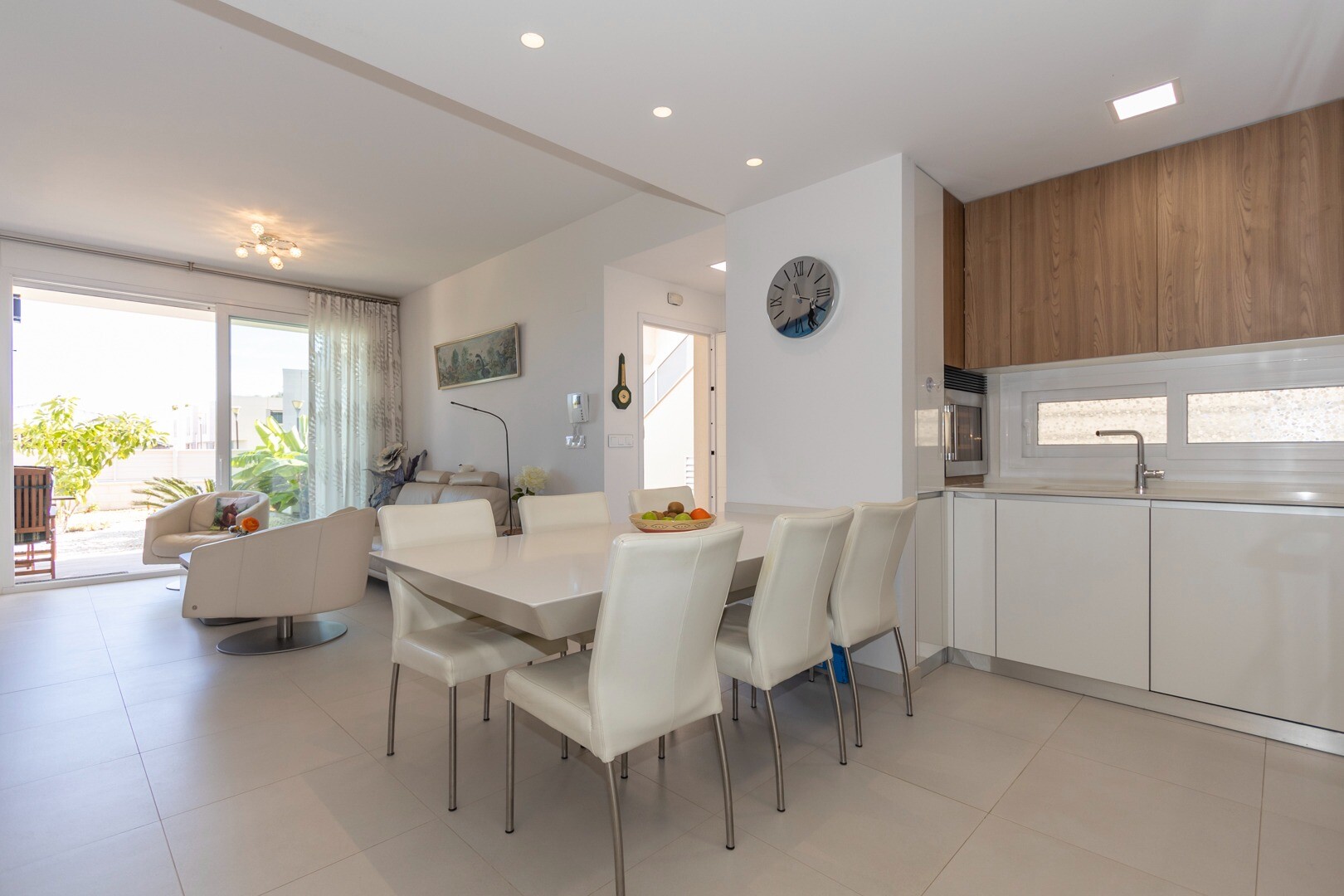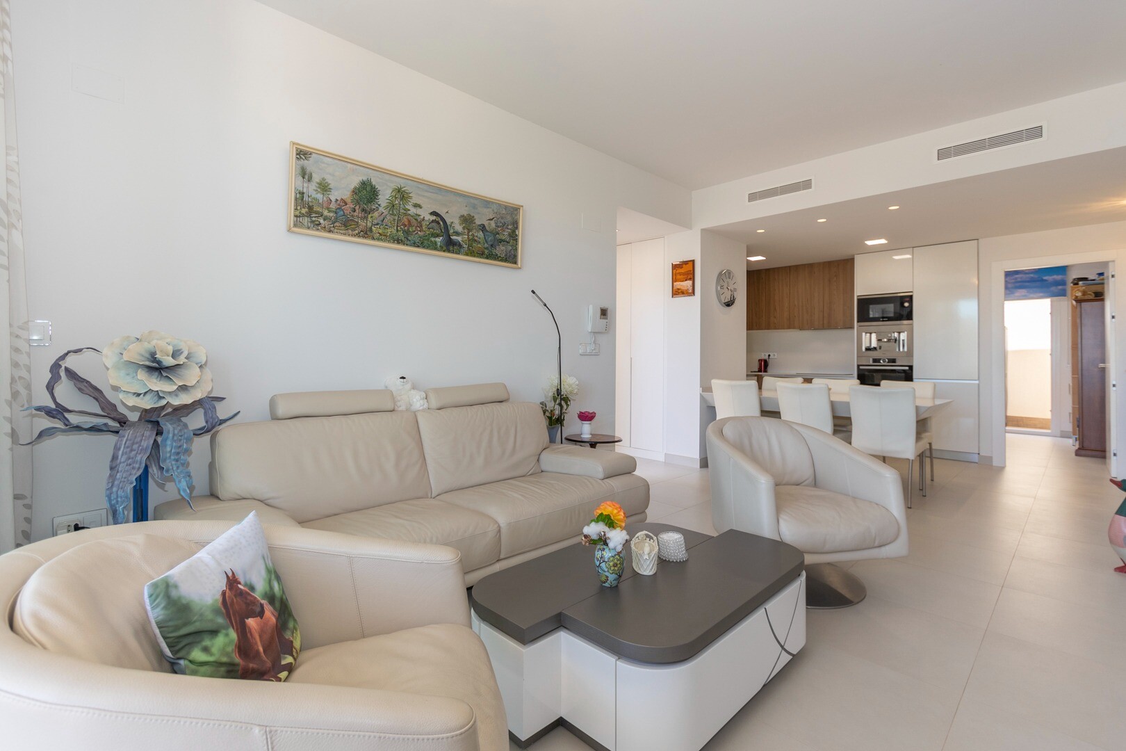 Du kommer in i huset genom en liten hall som mynnar ut i ett stort vardagsrum och öppet kök med stora skjutdörrar i ...glas som leder ut mot en stor terrass på 50m2. I köket har du alla bekvämligheter i ett modernt kök, inklusive en inbyggd kaffebryggare. Lägenheten har rymliga sovrum med eget badrum i master bedroom och stora skjutdörrar i glas som öppnar ut mot terrassen.