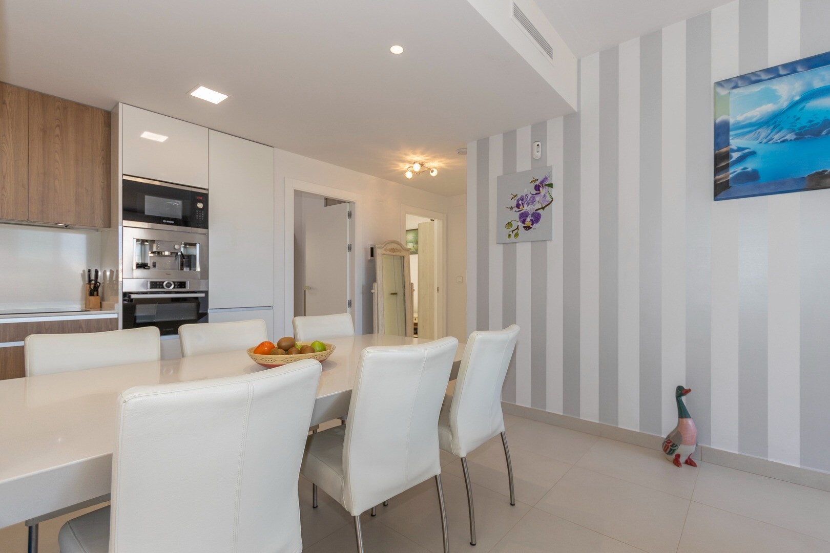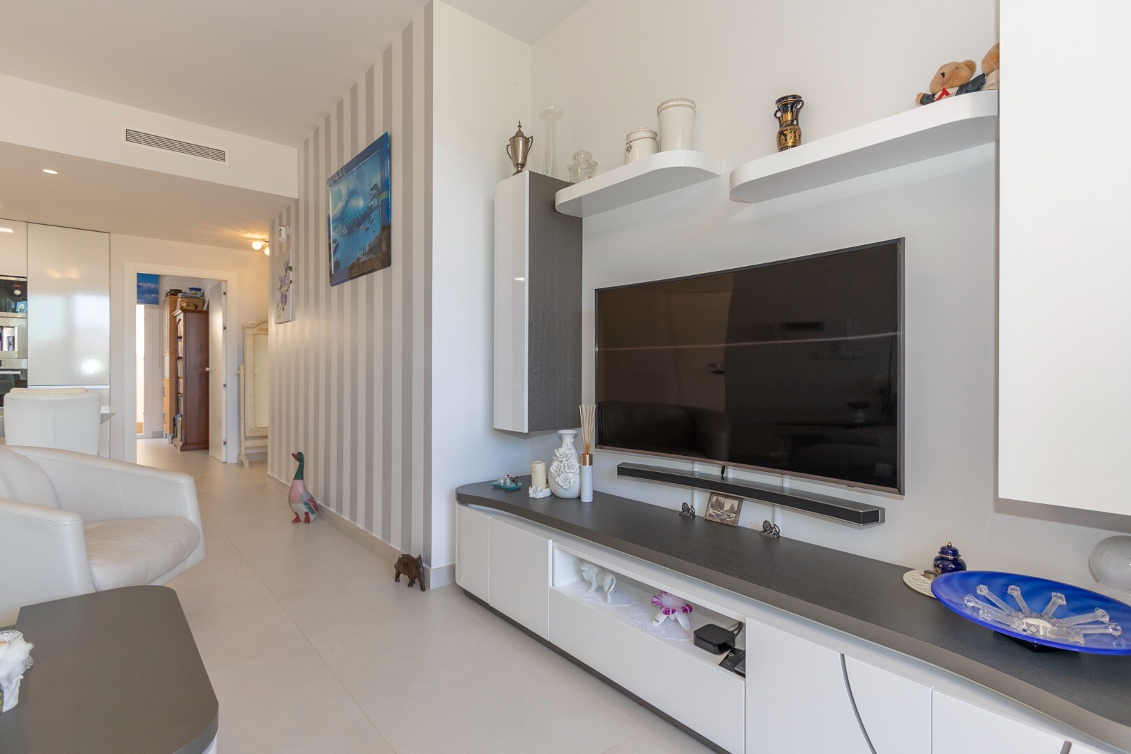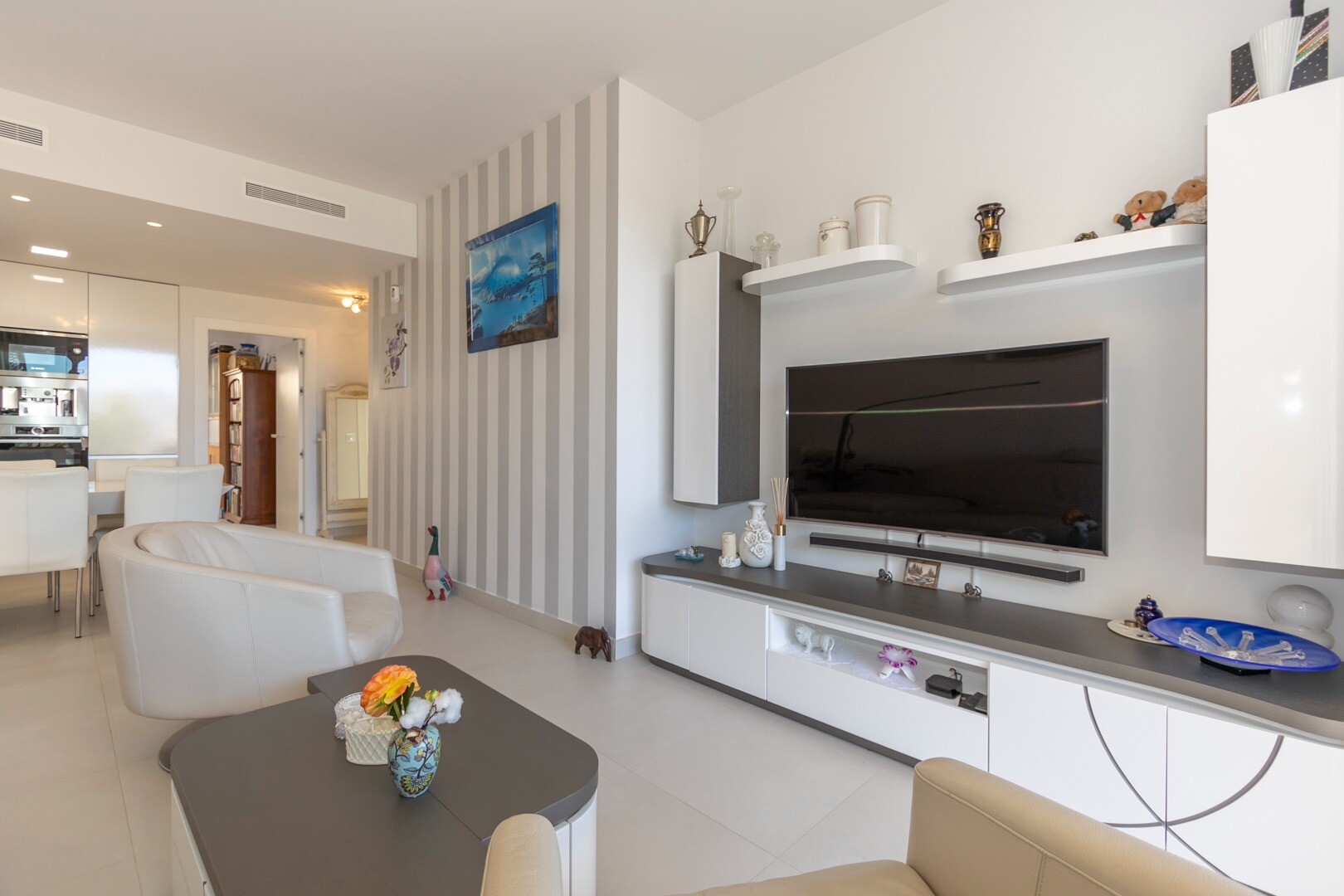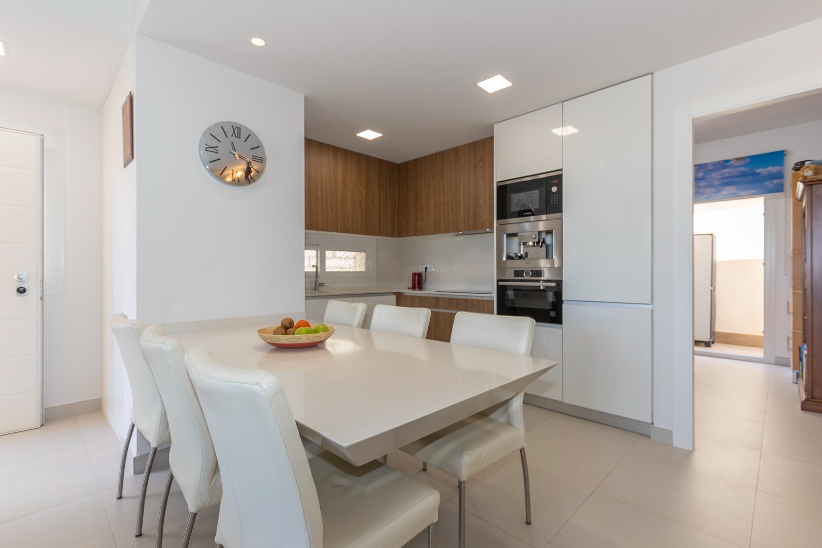 Du kommer in i huset genom en liten hall som mynnar ut i ett stort vardagsrum och öppet kök med stora skjutdörrar i ...glas som leder ut mot en stor terrass på 50m2. I köket har du alla bekvämligheter i ett modernt kök, inklusive en inbyggd kaffebryggare. Lägenheten har rymliga sovrum med eget badrum i master bedroom och stora skjutdörrar i glas som öppnar ut mot terrassen.