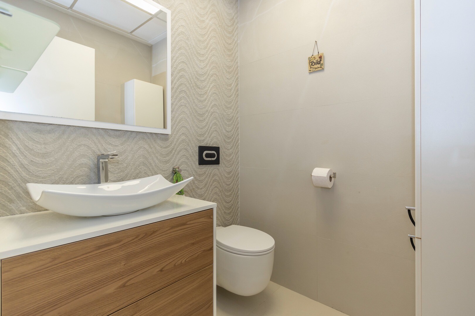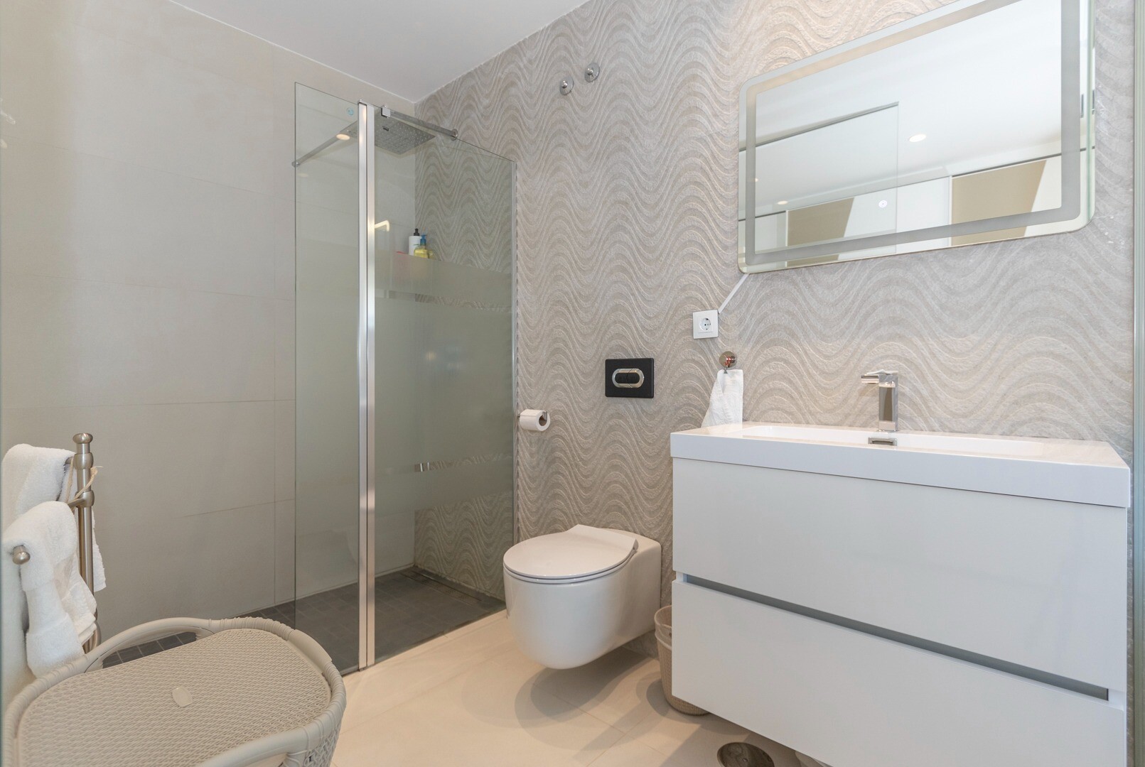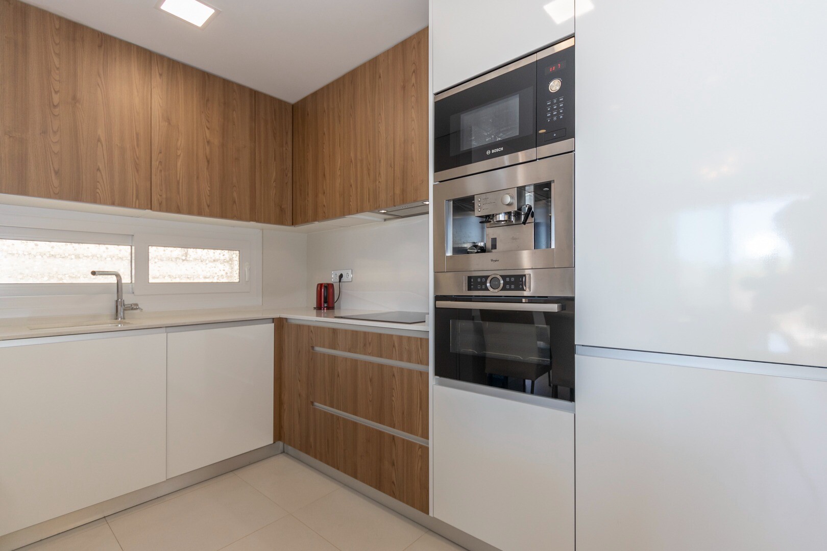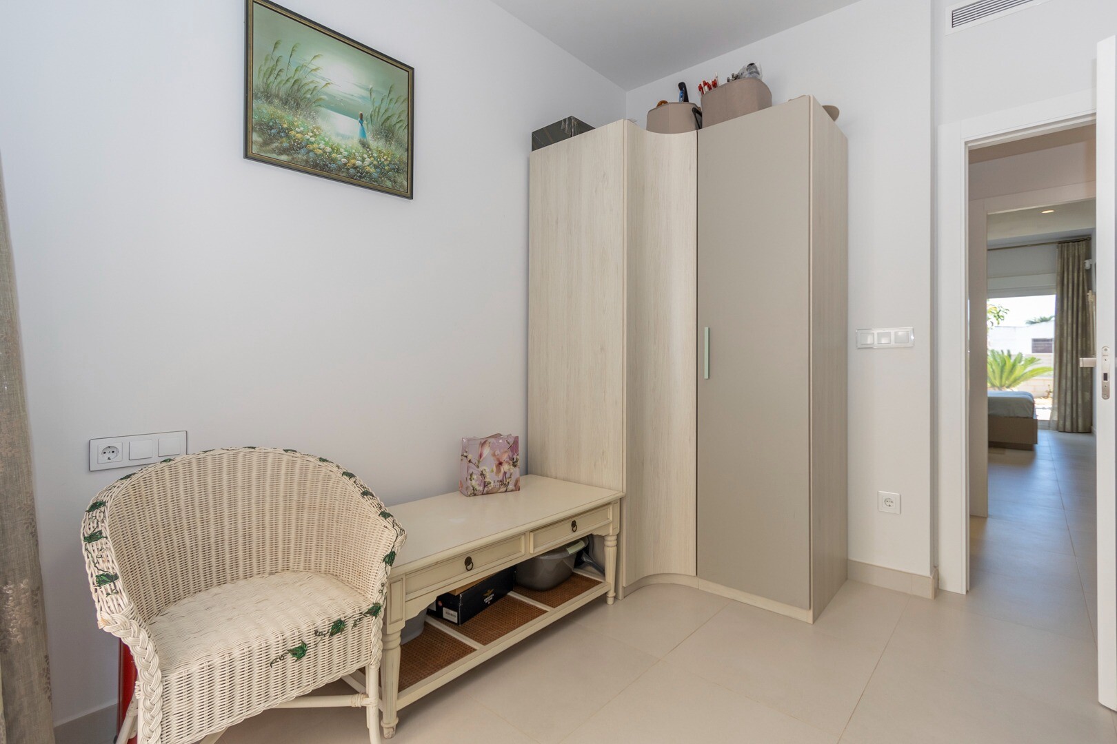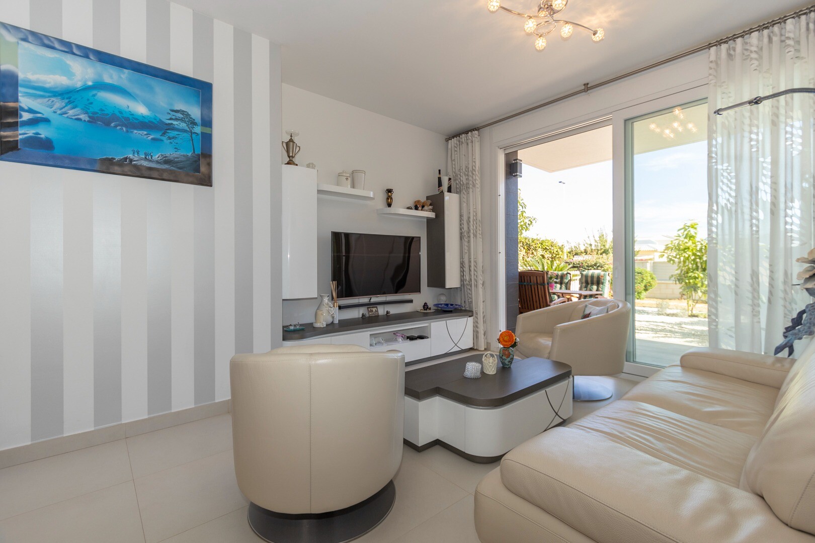 Du kommer in i huset genom en liten hall som mynnar ut i ett stort vardagsrum och öppet kök med stora skjutdörrar i ...glas som leder ut mot en stor terrass på 50m2. I köket har du alla bekvämligheter i ett modernt kök, inklusive en inbyggd kaffebryggare. Lägenheten har rymliga sovrum med eget badrum i master bedroom och stora skjutdörrar i glas som öppnar ut mot terrassen.