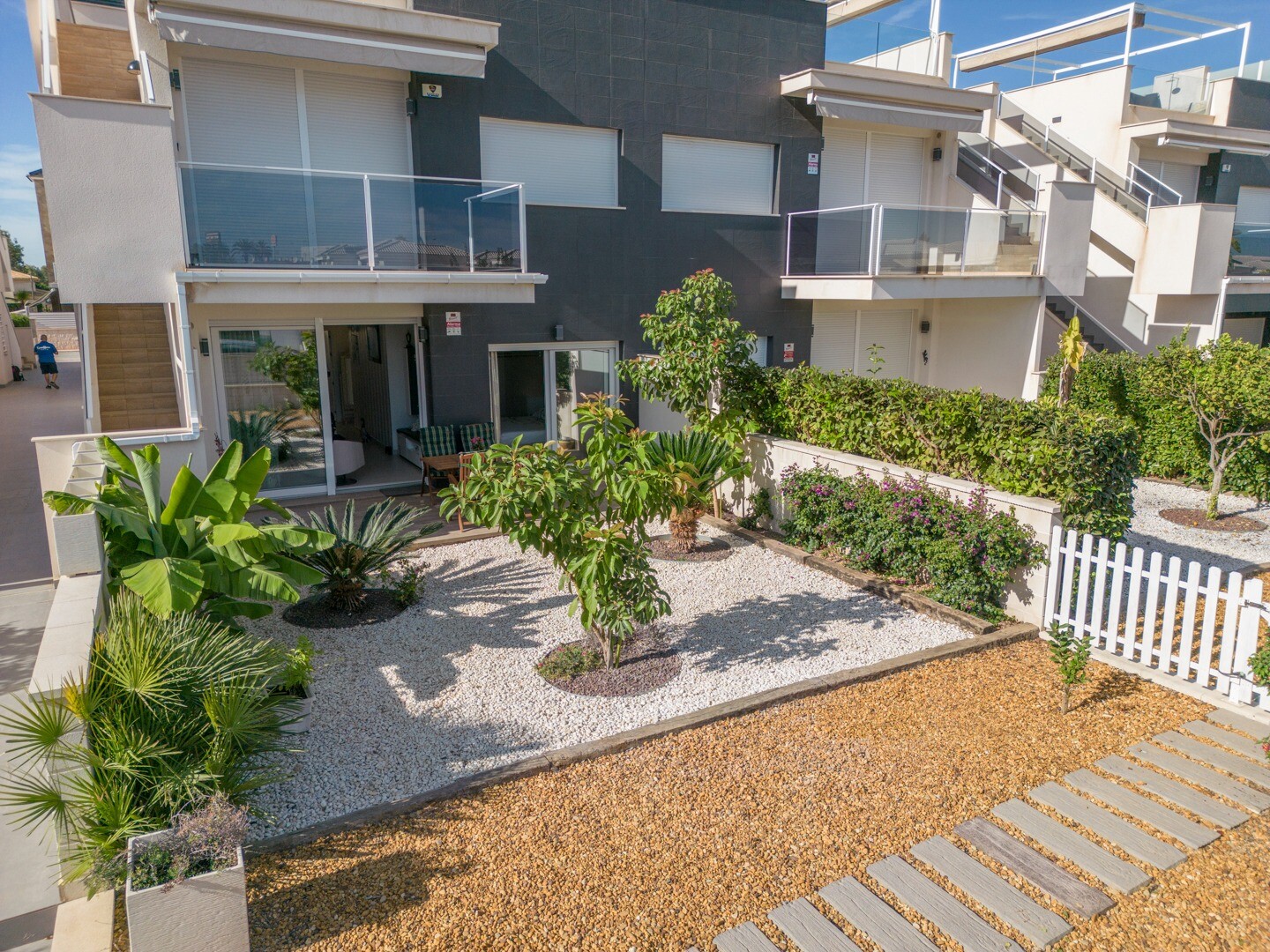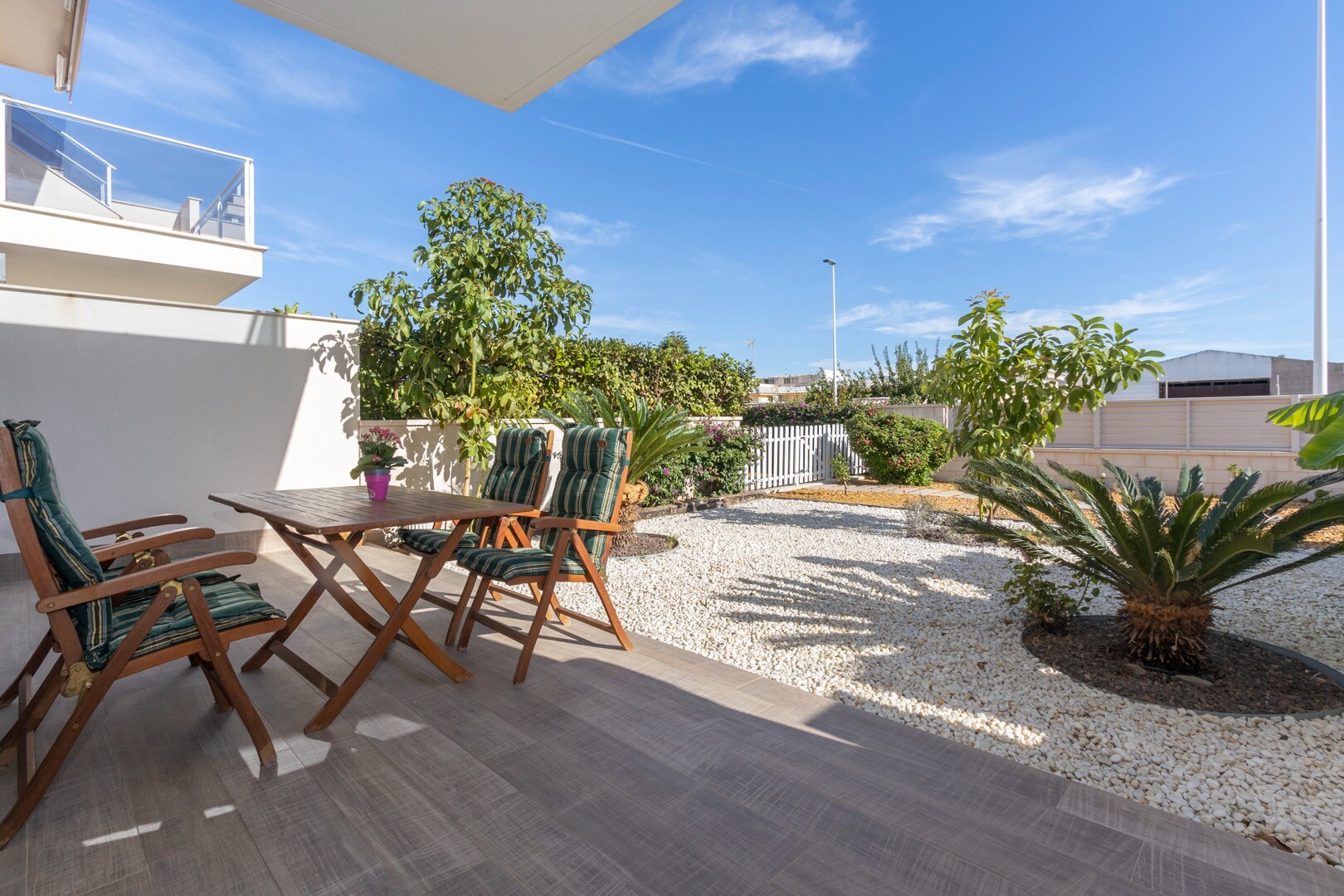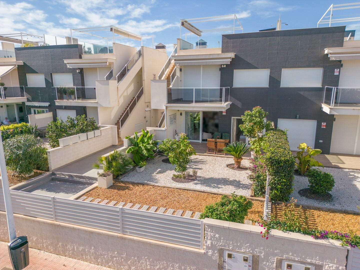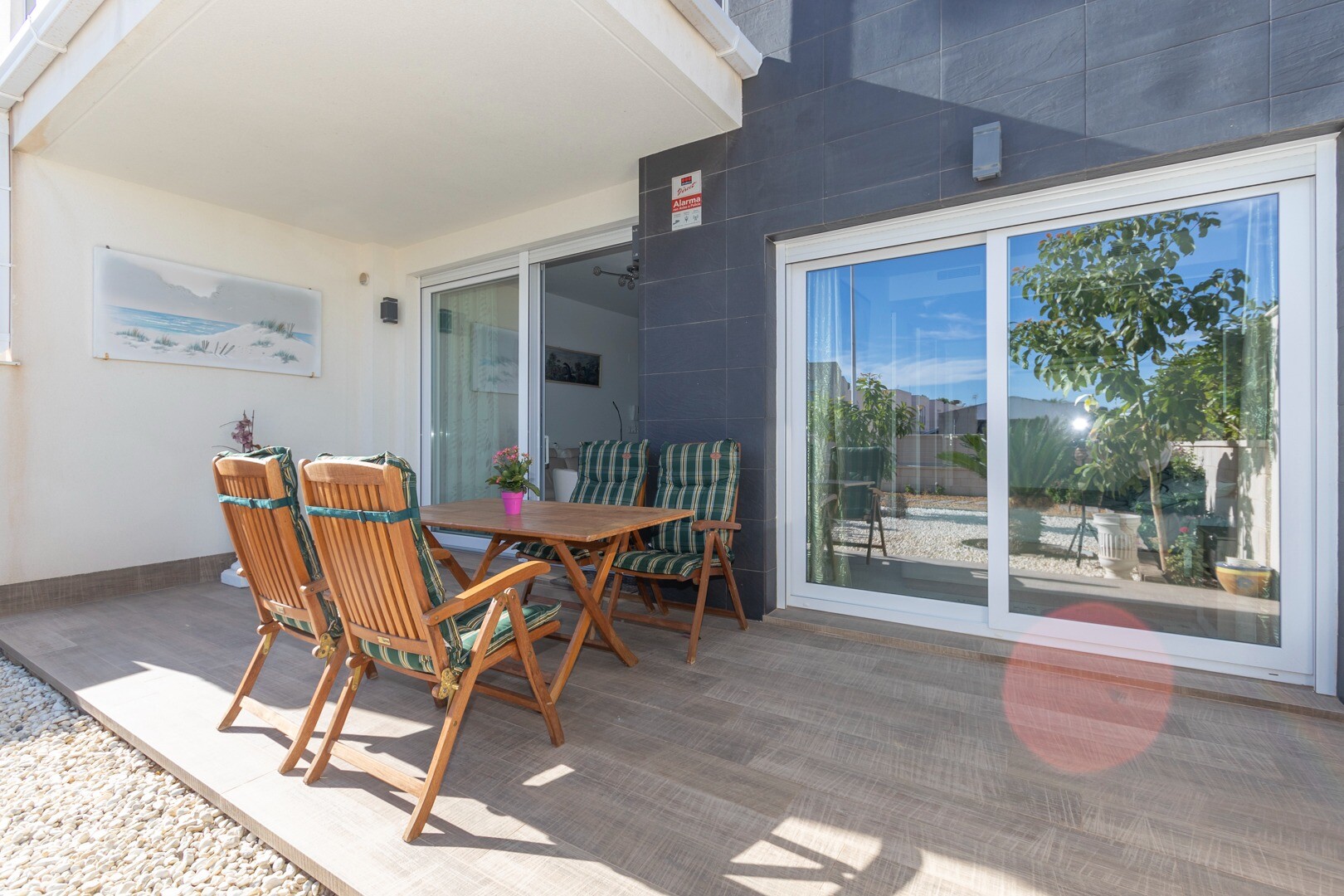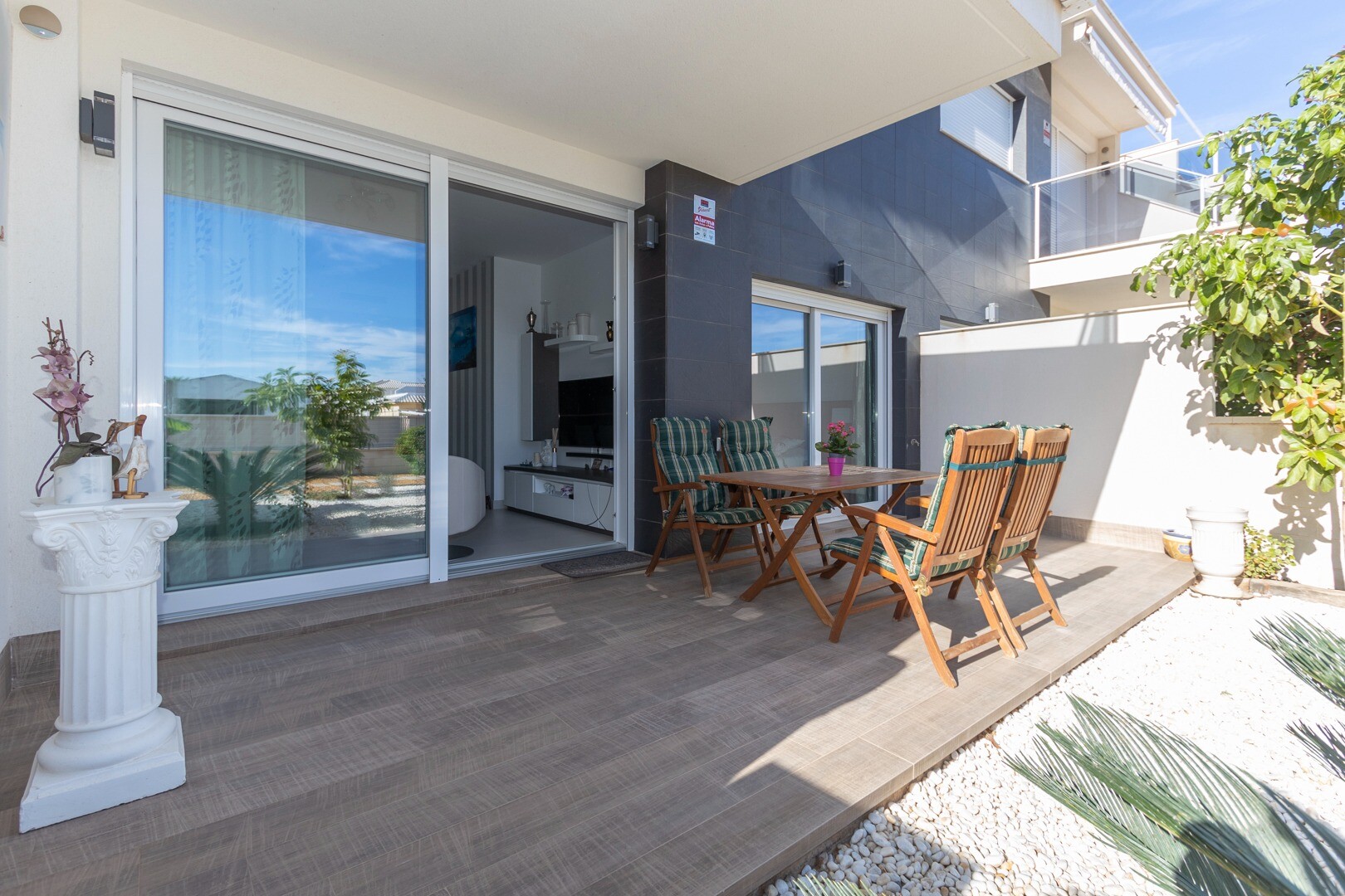 Lägenheten har inbyggd luftkonditionering i alla rum och golvvärme. Bakom lägenheten finns även en stor uteplats på 10m2, detta är ett utrymme på baksidan som kan användas som förvaring och ger naturligt ljus. Framsidan består av en stor terrass och en välskött trädgård med olika växter och ett bananträd.