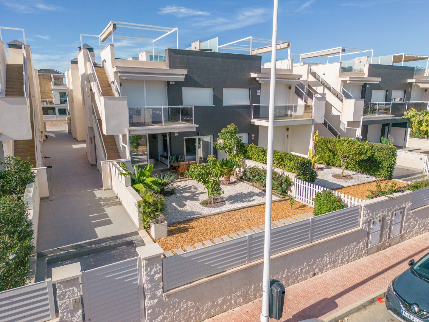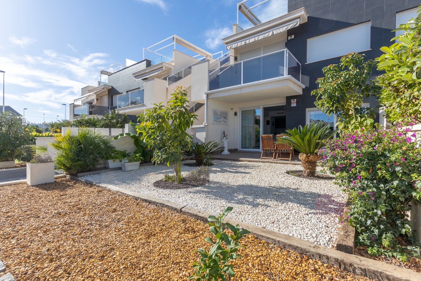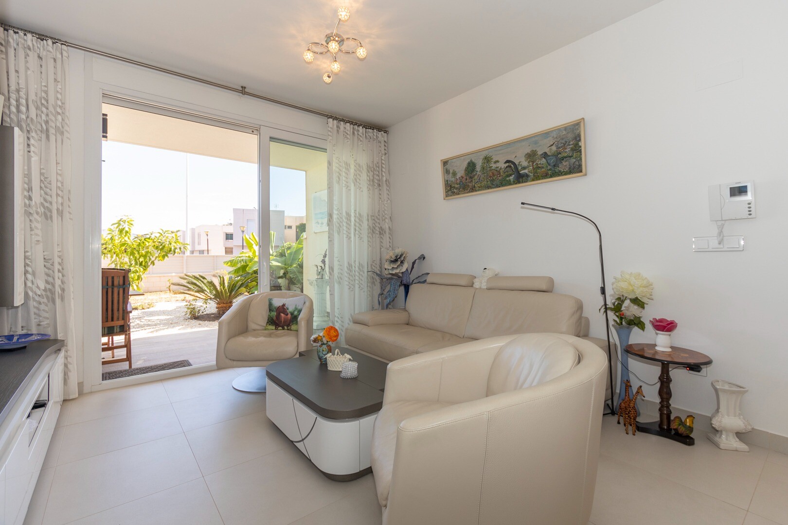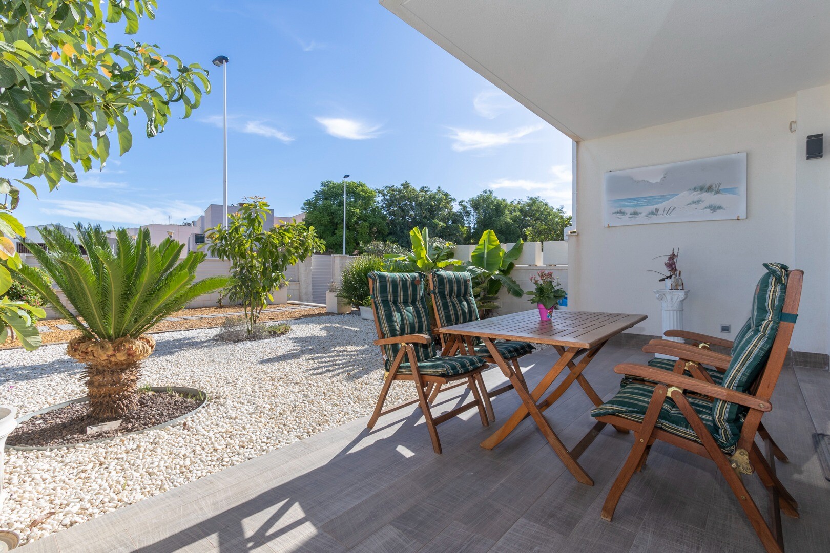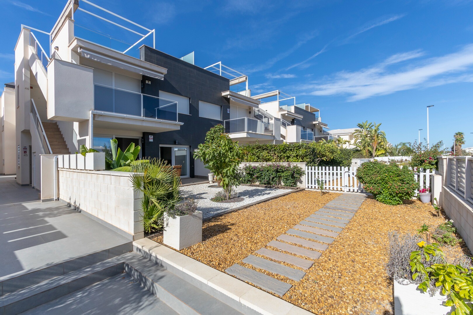 Lägenheten har inbyggd luftkonditionering i alla rum och golvvärme. Bakom lägenheten finns även en stor uteplats på 10m2, detta är ett utrymme på baksidan som kan användas som förvaring och ger naturligt ljus. Framsidan består av en stor terrass och en välskött trädgård med olika växter och ett bananträd.