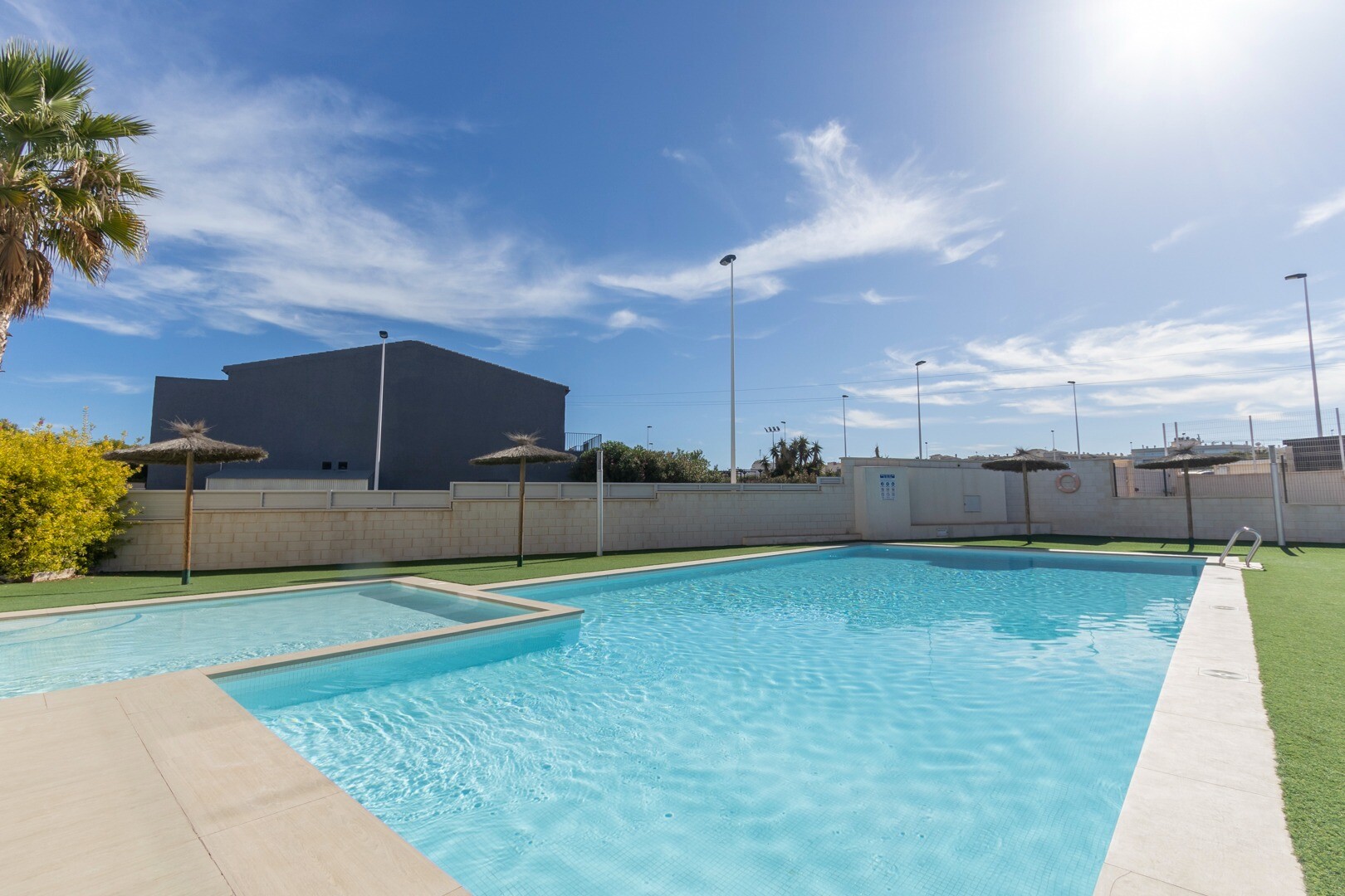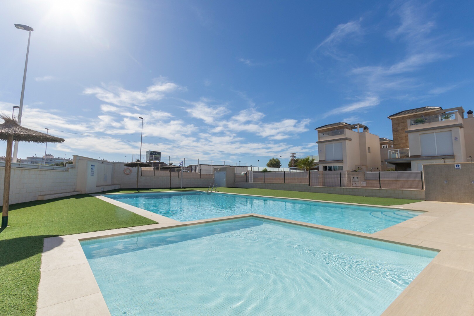 Till lägenheten hör även garageplats och underjordiskt förråd. Det finns en stor gemensam och vacker pool med barnpool, konstgräs och parasoll.