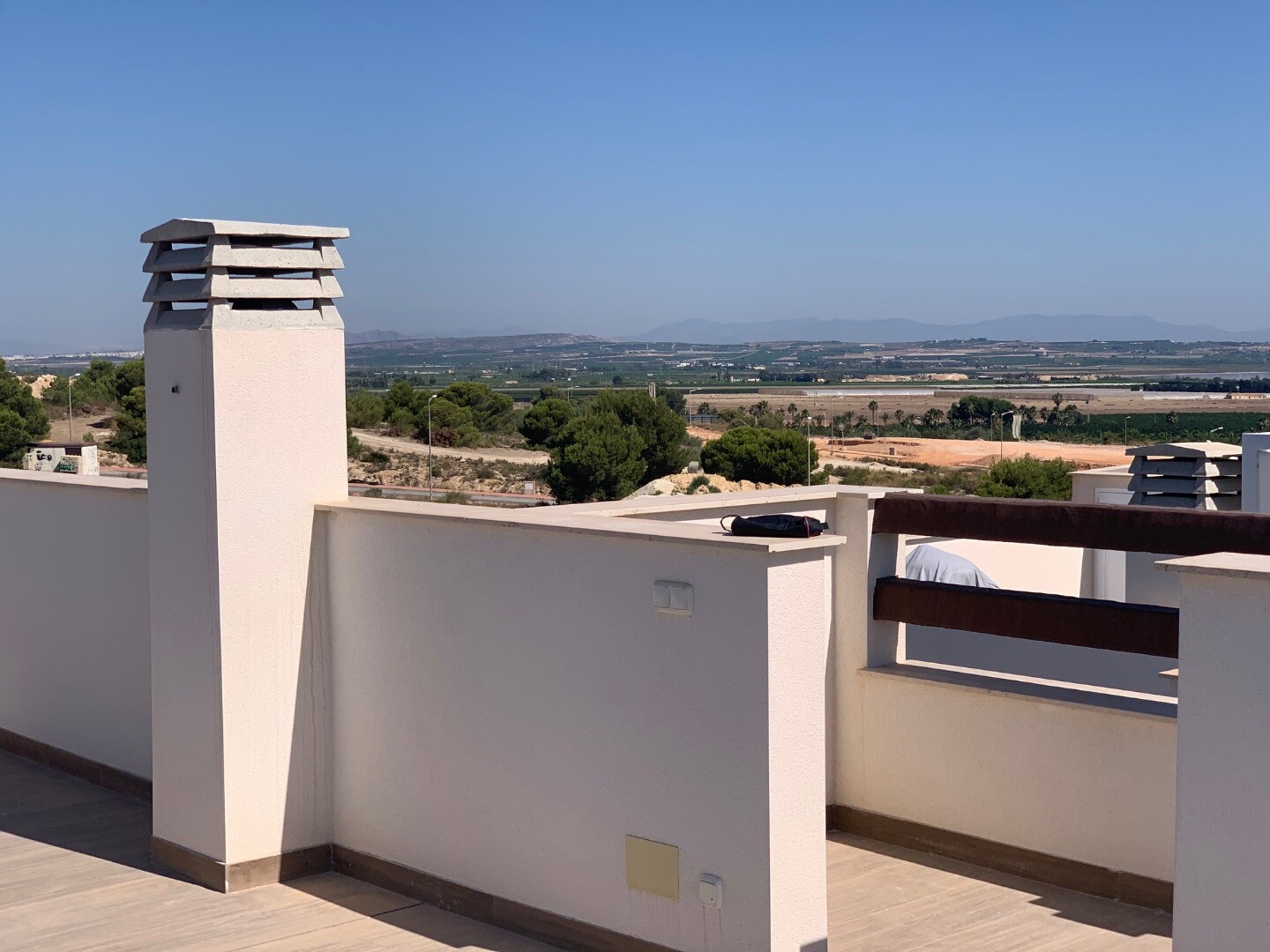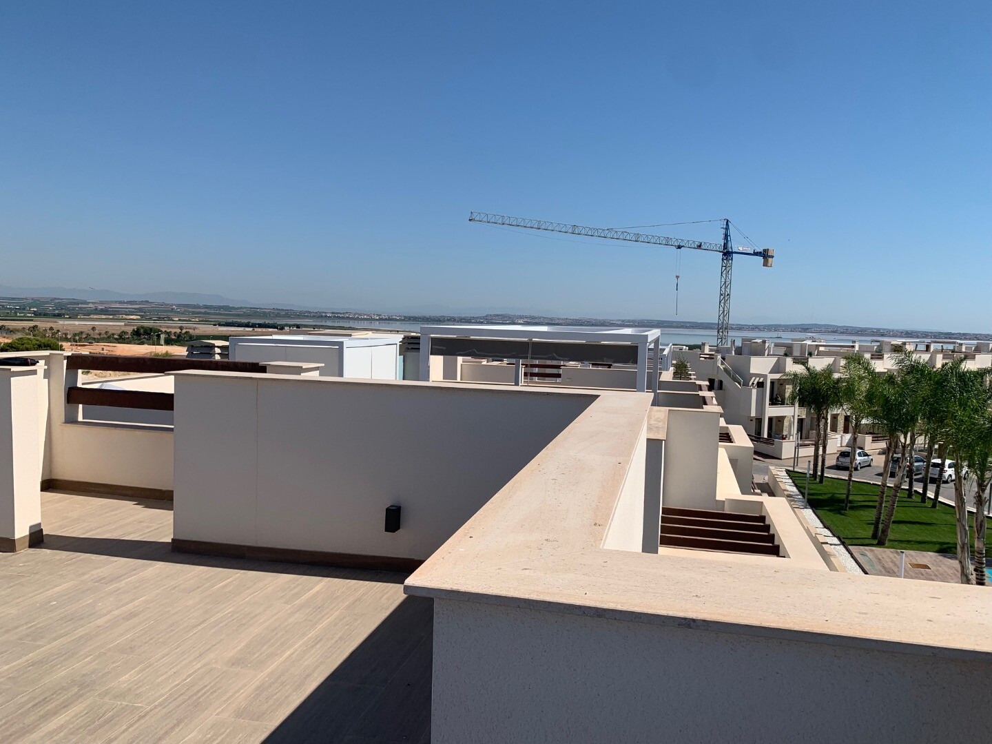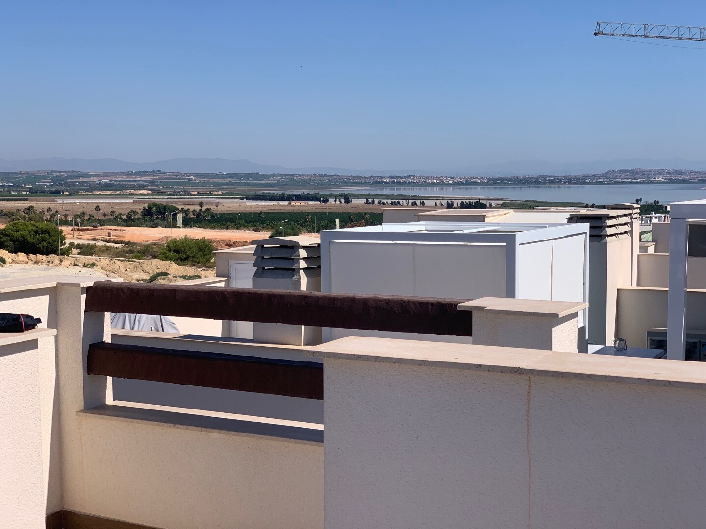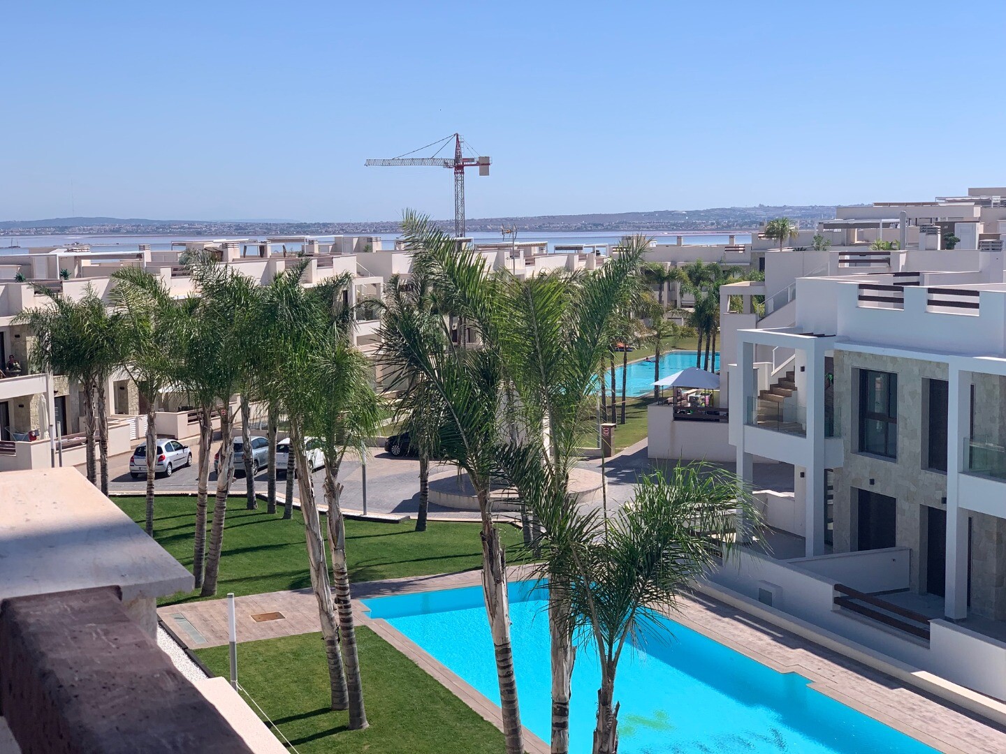 Från solariet har du en vacker utsikt över den rosa saltsjön i Torrevieja, samt lite utsikt över havet. Balkongen har utsikt över den gemensamma trädgården och poolen.