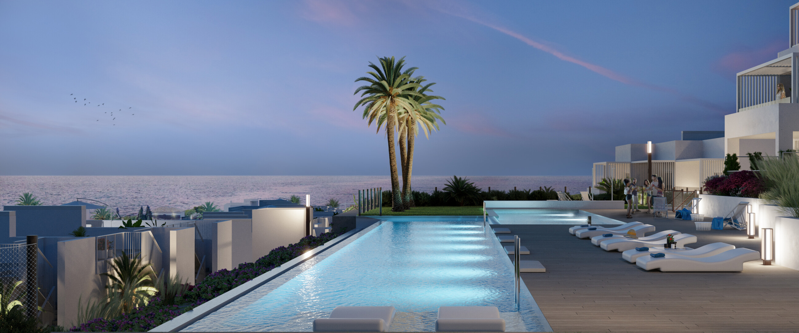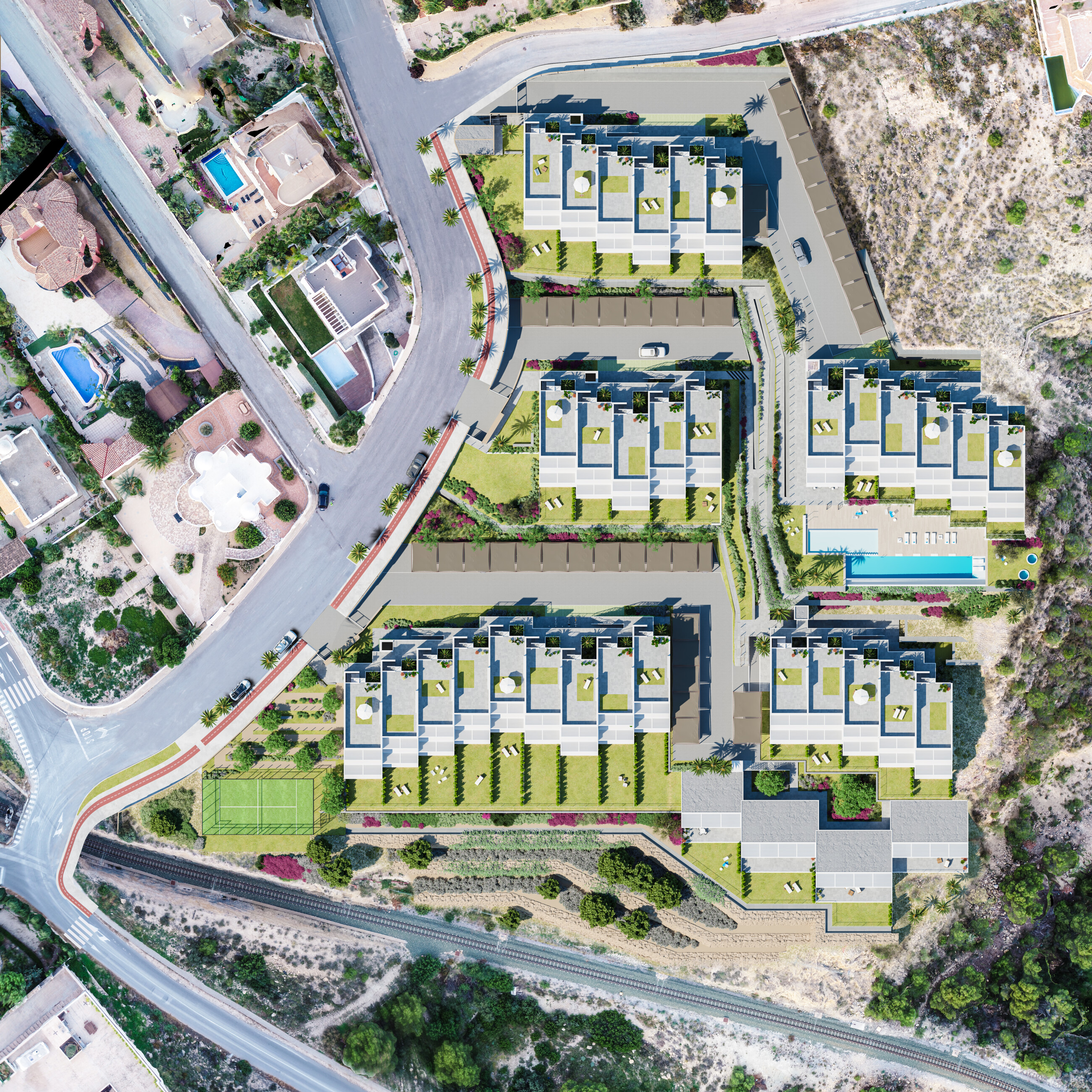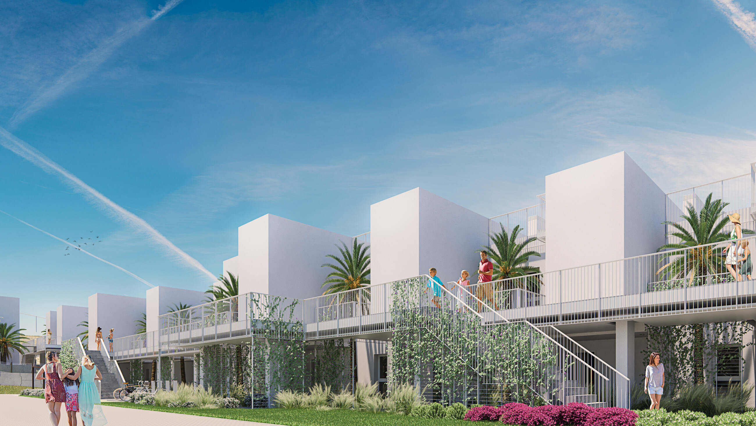 Hus med 2 och 3 sovrum med mycket stora terrasser, trädgård eller solarium. Utmärkta kvaliteter som inkluderar bland annat varm/kall luftkonditionering genom ledningssystem och golvvärme i badrummen, chans att skräddarsy ditt hem med ett urval av olika ytbehandlingsalternativ. Alla bostäder har parkeringsplats.
