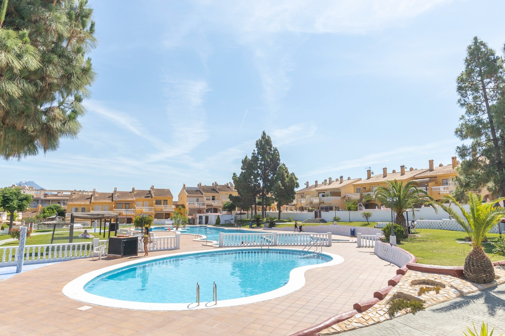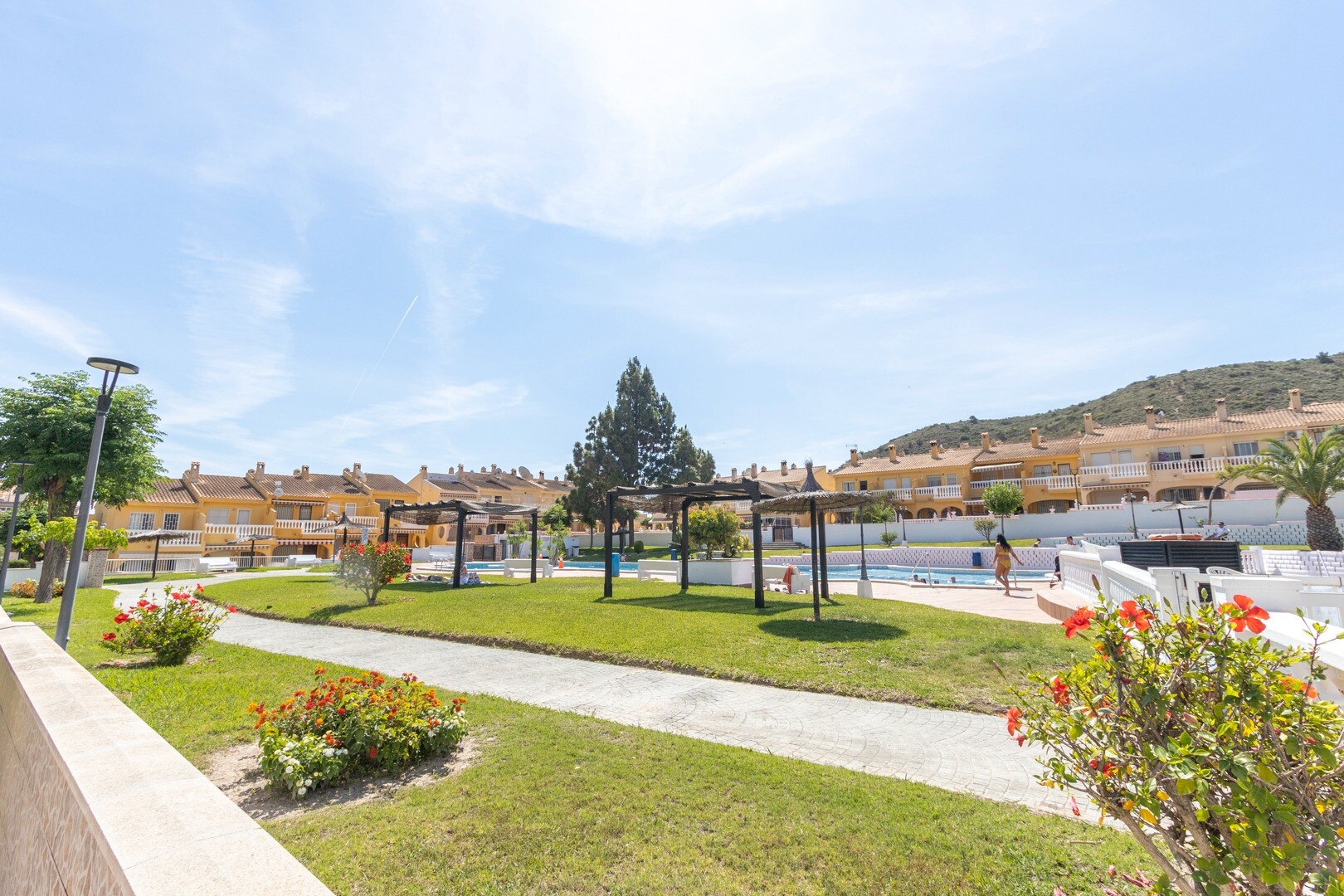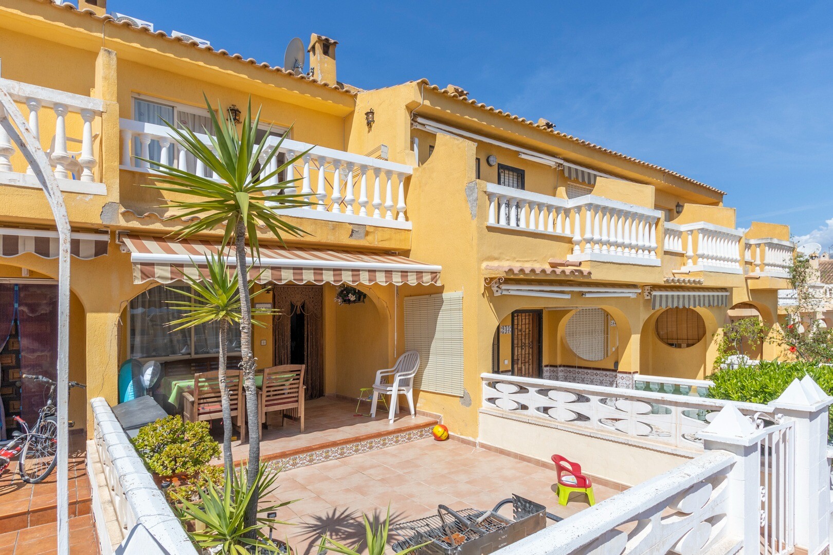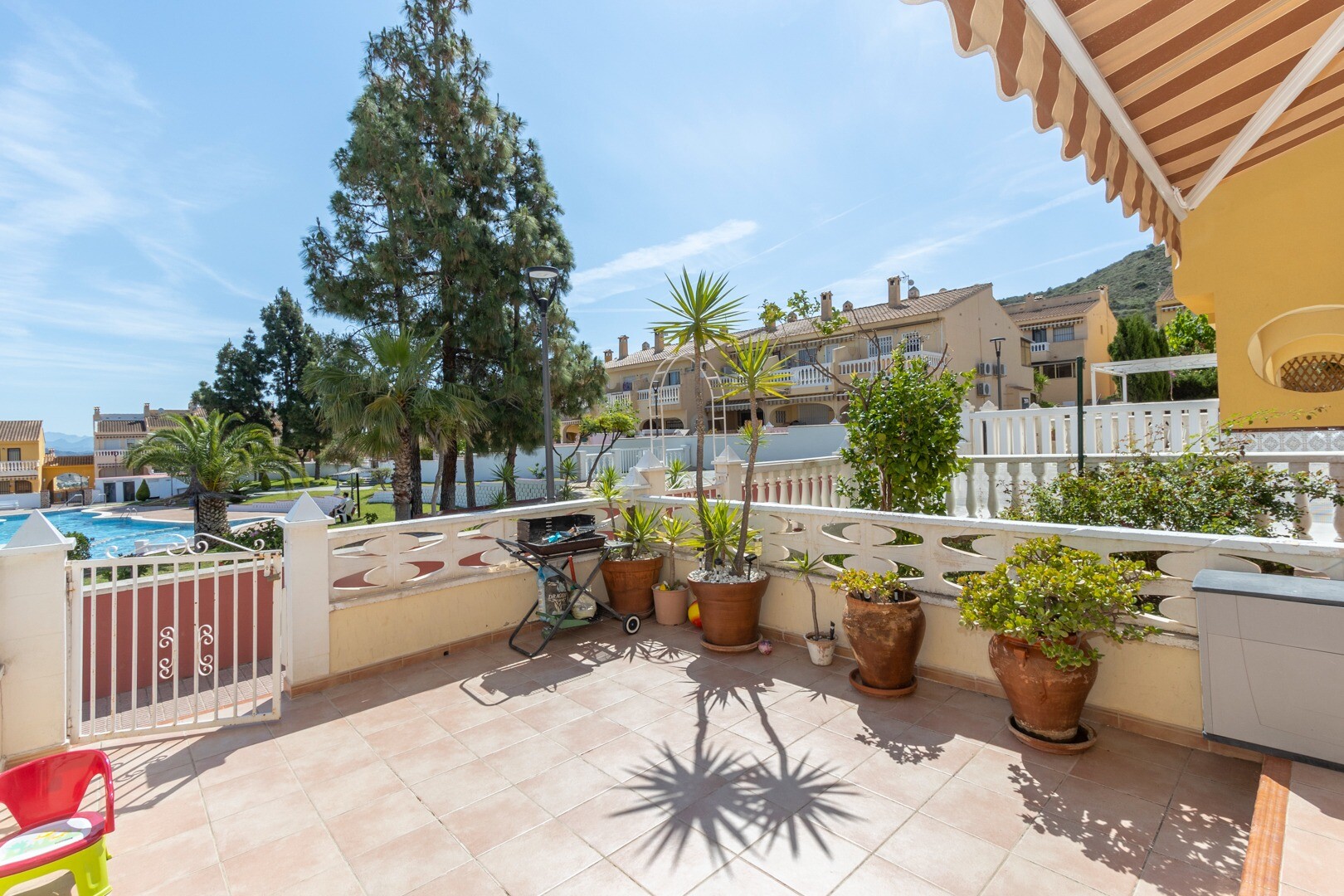 När det gäller bekvämligheter inkluderar fastigheten en gemensam pool, perfekt för varma dagar. Den har även ett förråd och ett tvättrum, element som förbättrar funktionaliteten i utrymmet. Huset säljs fullt möblerat, inklusive hushållsapparater, vilket underlättar flytten.