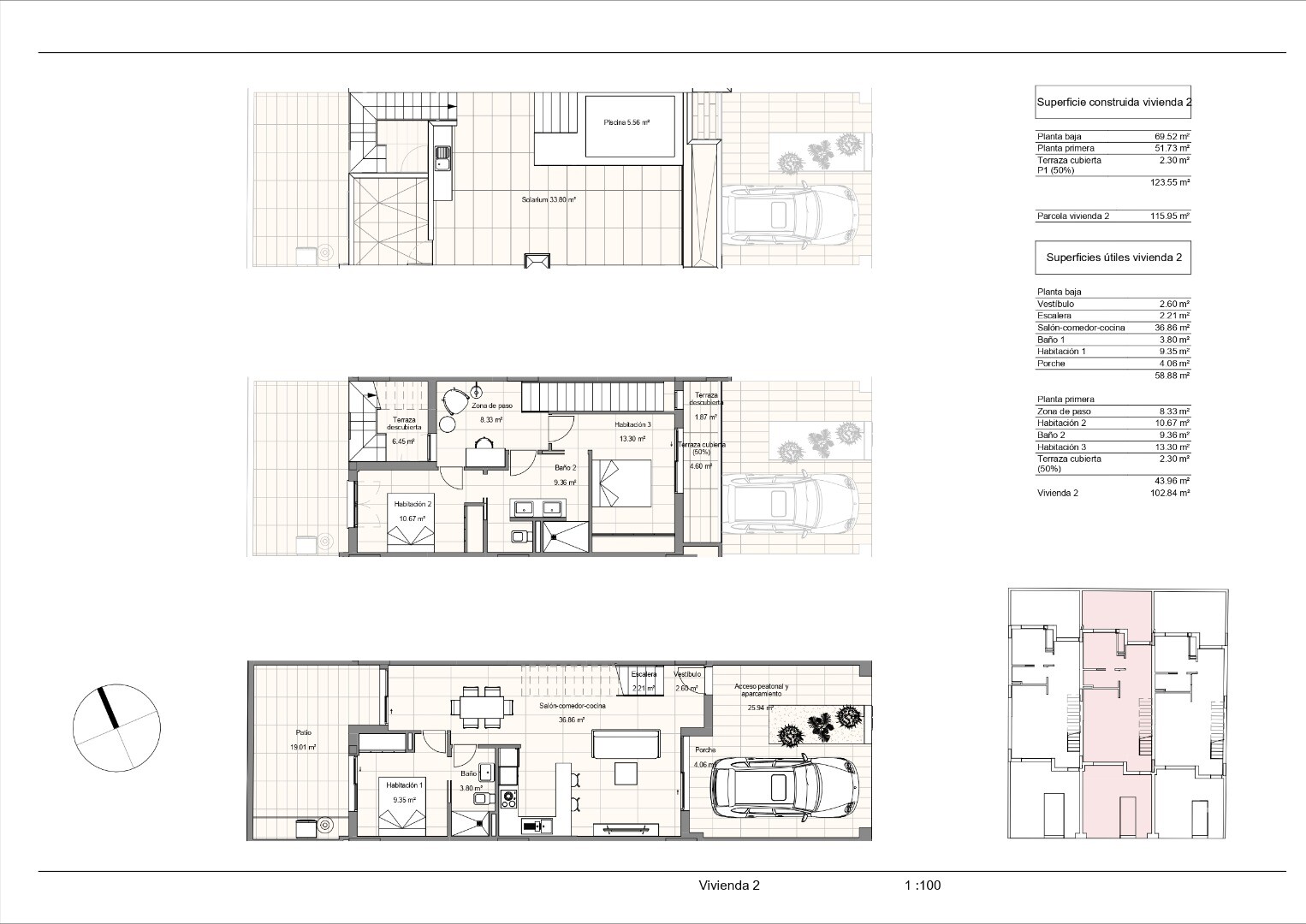 Bella Salina Collection är en herrgård som utmärker sig för sin exteriöra design, en kombination av rena linjer och utsmyckade element som skapar en unik, modern och elegant stil. Med söderläge och beläget i ett etablerat bostadsområde bara 150 meter från stranden, är det idealiskt för dem som vill njuta av livet vid Medelhavet. Bostäderna kommer a...tt vara helt färdigställda inklusive: köksapparater, helt färdiga badrum, elektriska jalusier, inomhus- och utomhusbelysning, utekök och uppvärmd saltvattenpool. På bottenvåningen har ett "öppet och ljust" utrymme skapats där vardagsrum, matsal och kök är anslutna via skjutdörrar till en innergård för utomhusbruk och njutning året runt. Trappan, med en enkel vitmetallkonstruktion och en glasräcke, utgör ett perfekt komplement för att bibehålla ljus och rymd från entrén. Planlösningen på denna våning kompletteras av ett rum med utgång till uteplatsen och ett badrum med Jack and Jill-säng. På översta våningen, tillgänglig via denna trappa, finns ett relaxområde. Denna multifunktionella avsats leder till två rymliga sovrum, ett med egen terrass och båda delar ett elegant 10m² stort Jack Jill-drömbadrum. Takterrassen är idealiskt utformad där du kan njuta av havsutsikten, äta utomhus, sola i lugn och ro eller ta ett uppfriskande dopp i den uppvärmda saltpoolen. Flygplatserna i Murcia och Alicante kan nås på cirka 40 minuter för Murcia respektive 50 minuter för Alicante.