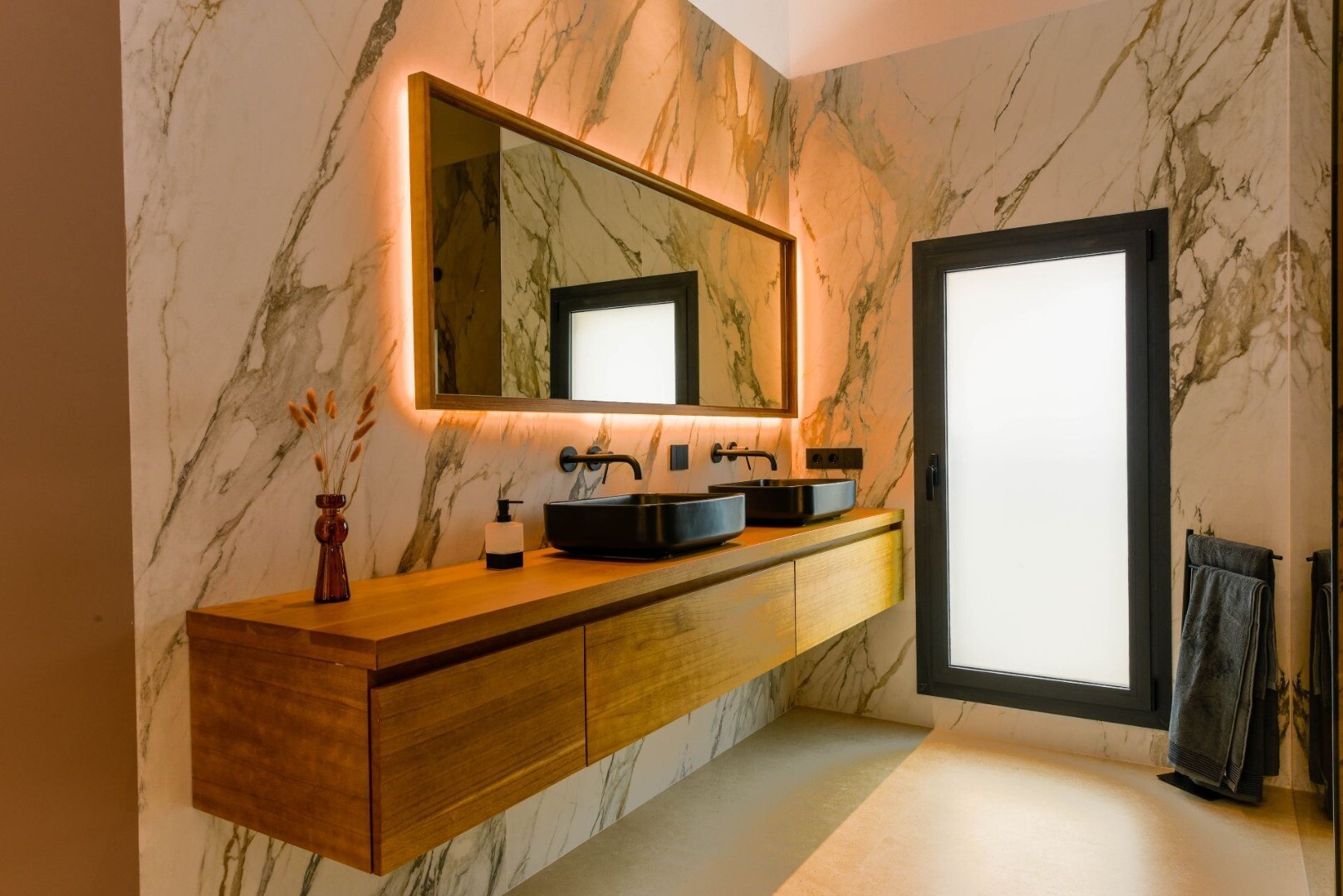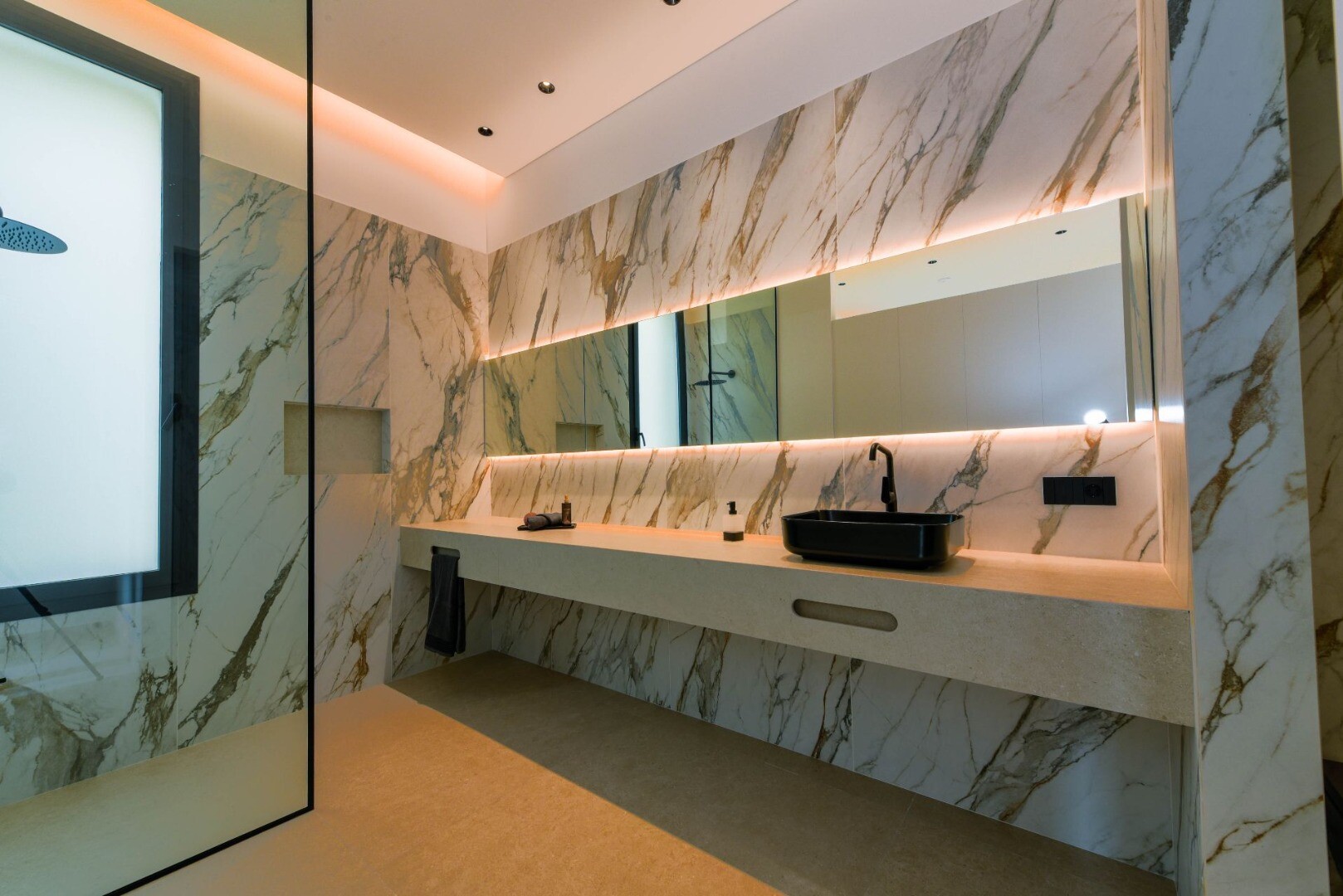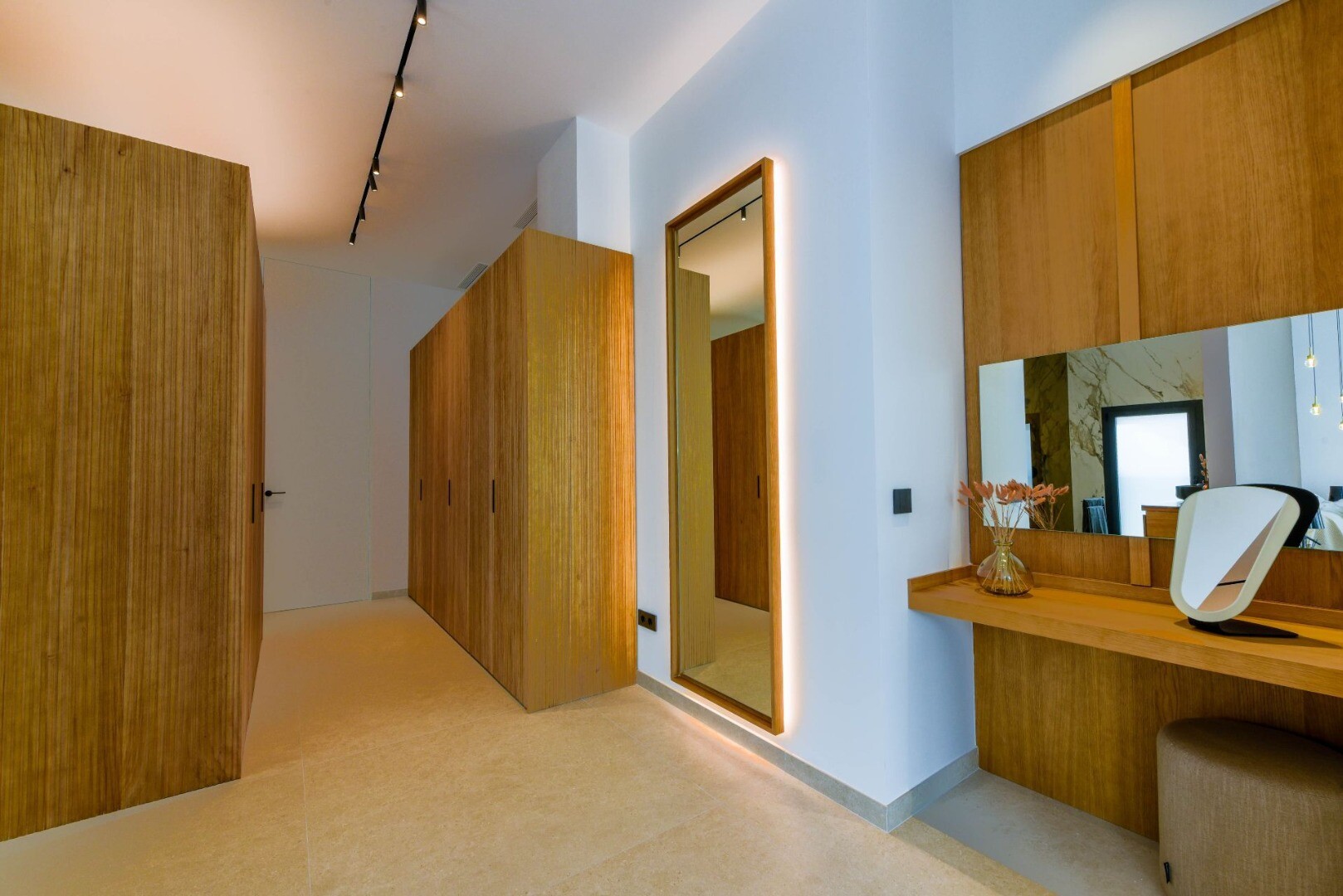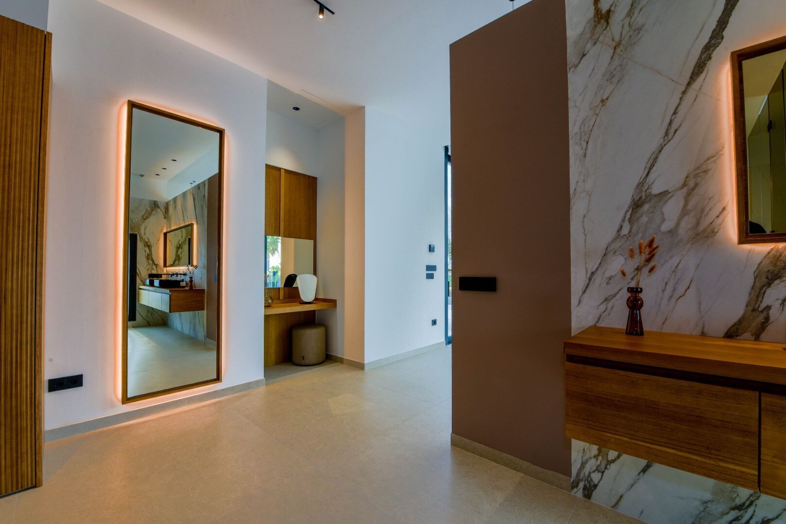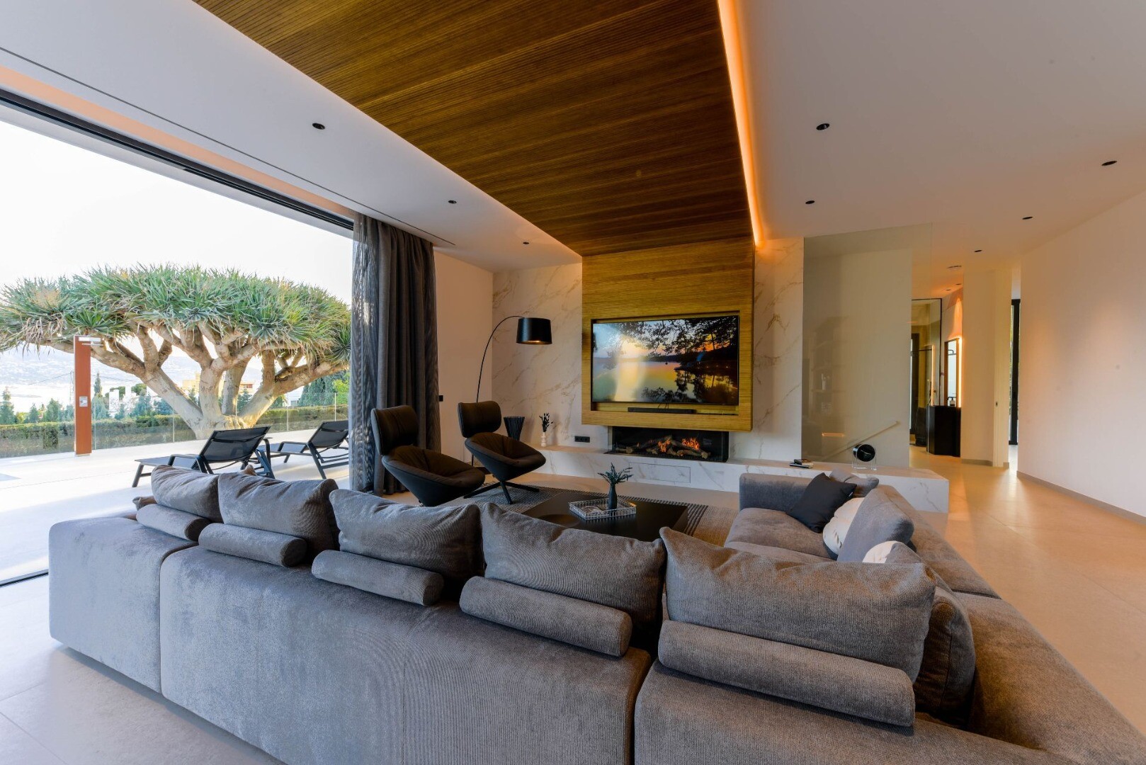 Przestronny salon z otwartą kuchnią z większą niż zwykle wyspą z elektrycznie sterowanymi oknami, które dyskretnie wpasowują się w ściany, aby wpuścić do środka świat zewnętrzny i odwrotnie. W salonie znajduje się również piękny, nowoczesny kominek gazowy, który zapewnia przytulne zimowe wieczory. 4 sypialnie i 5 łazienek. Obok basenu rośnie duże smocze drzewo, które jest gatunkiem chronionym i którego wiek szacuje się na ponad 300 lat.