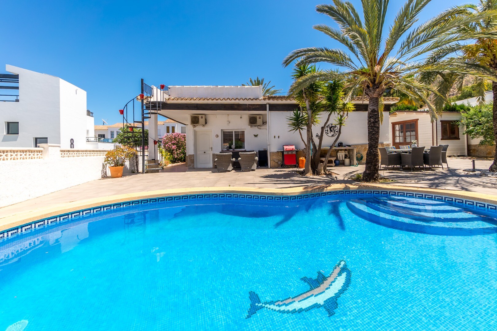 Belägen på en solig södervänd tomt på 600 m² i en lugn återvändsgata, erbjuder denna exceptionella medelhavsvilla avskildhet, komfort och enastående mångsidighet bara 900 meter från stranden och 600 meter från butiker, stormarknader och kollektivtrafik.