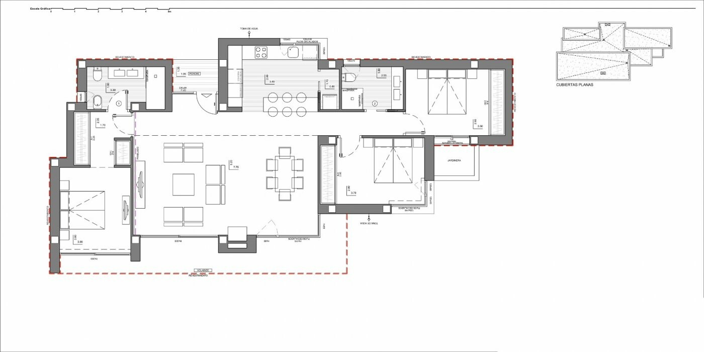 Husets vardagsrum/matsal, som är dess centrala inslag, har direkt kontakt med verandan och poolens terrass. Det kommunicerar också med köket med hjälp av en frukostbar; denna layout gör att du fortfarande kan njuta av havsutsikten från köket.