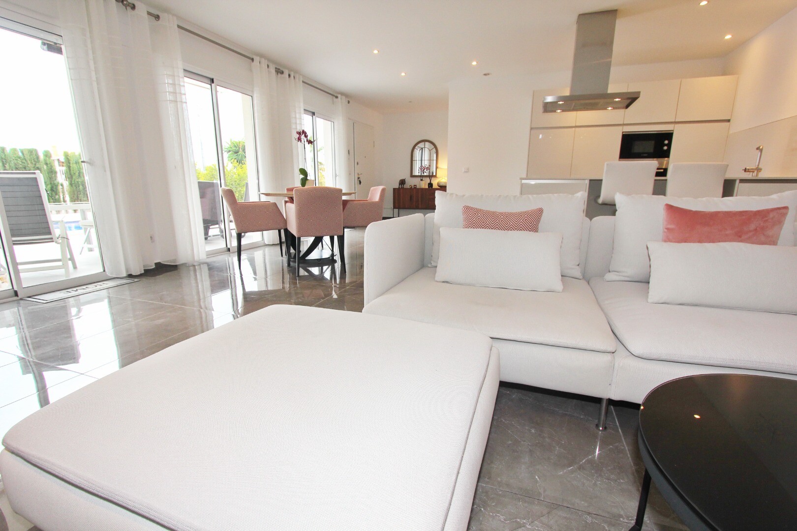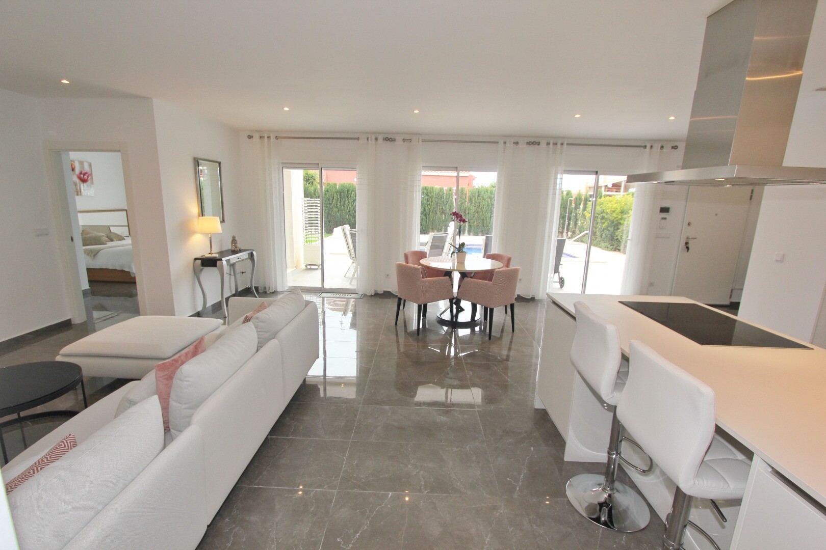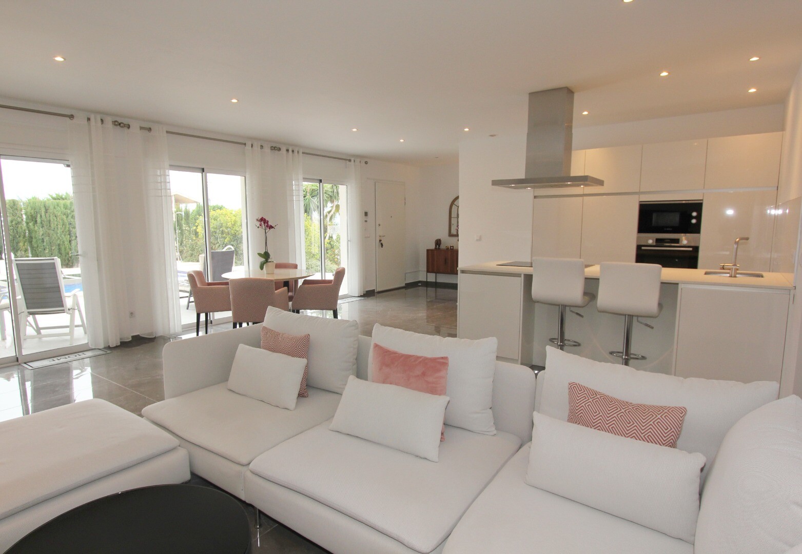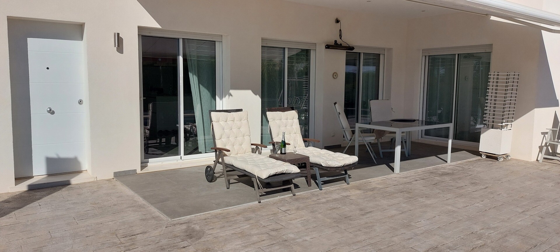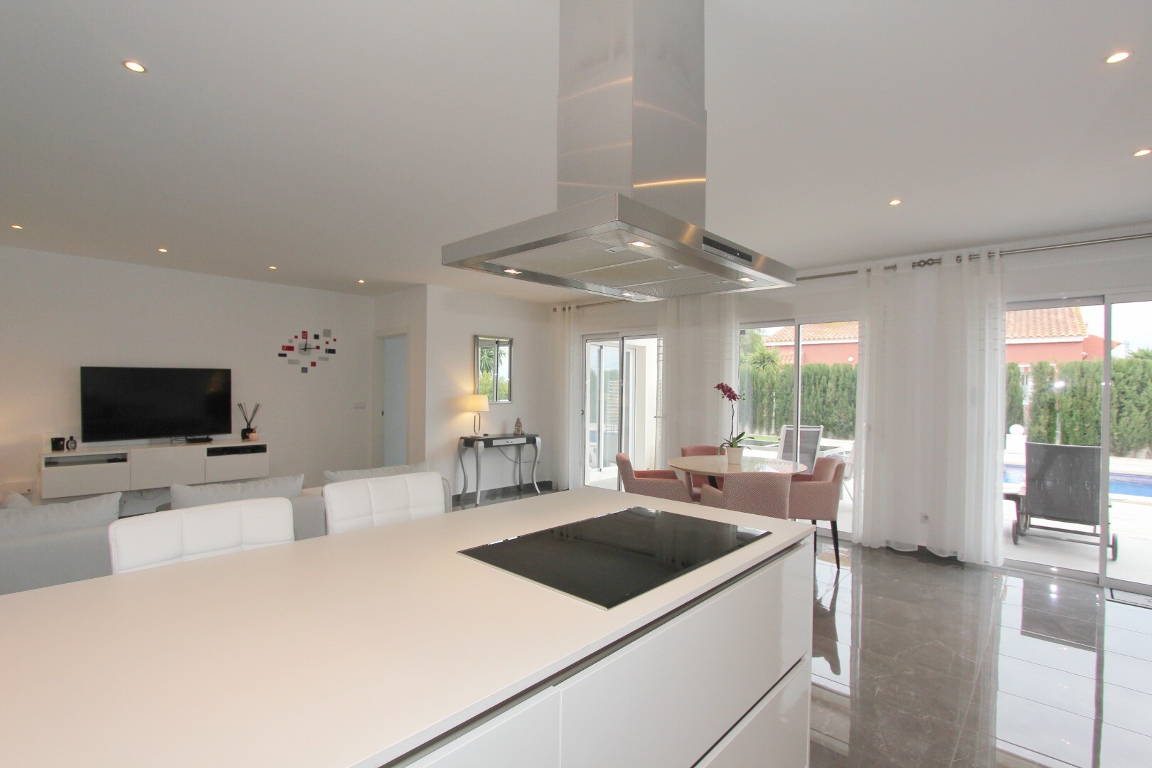 Välkommen till din lantliga fristad! Denna stilfulla villa på ett plan har eleganta moderna ytskikt och ett överflöd av naturligt ljus som dansar genom de generösa fönstren från golv till tak. Njut av gourmetköket, en fristad för blivande kockar, och njut av ditt morgonkaffe på den privata terrassen vid poolen, där utsikten över trädgården och pool...en utspelar sig framför dina ögon. Inbäddat i en lantlig by, är denna privata villa din inkörsport till en lugn livsstil, omgiven av din egen stora trädgård med frodig vegetation och fruktträd, en idealisk plats att äta "al fresco" eller smutta på cocktails vid poolen! Staden Mutxamel ligger bara 7 minuters bilresa bort och stranden 10 minuter. Mutxamel och Busot har en sprudlande "spansk by"-känsla och har många lokala hantverksbutiker, märkesvaror och frukt- och grönsaksmarknader varje vecka!.