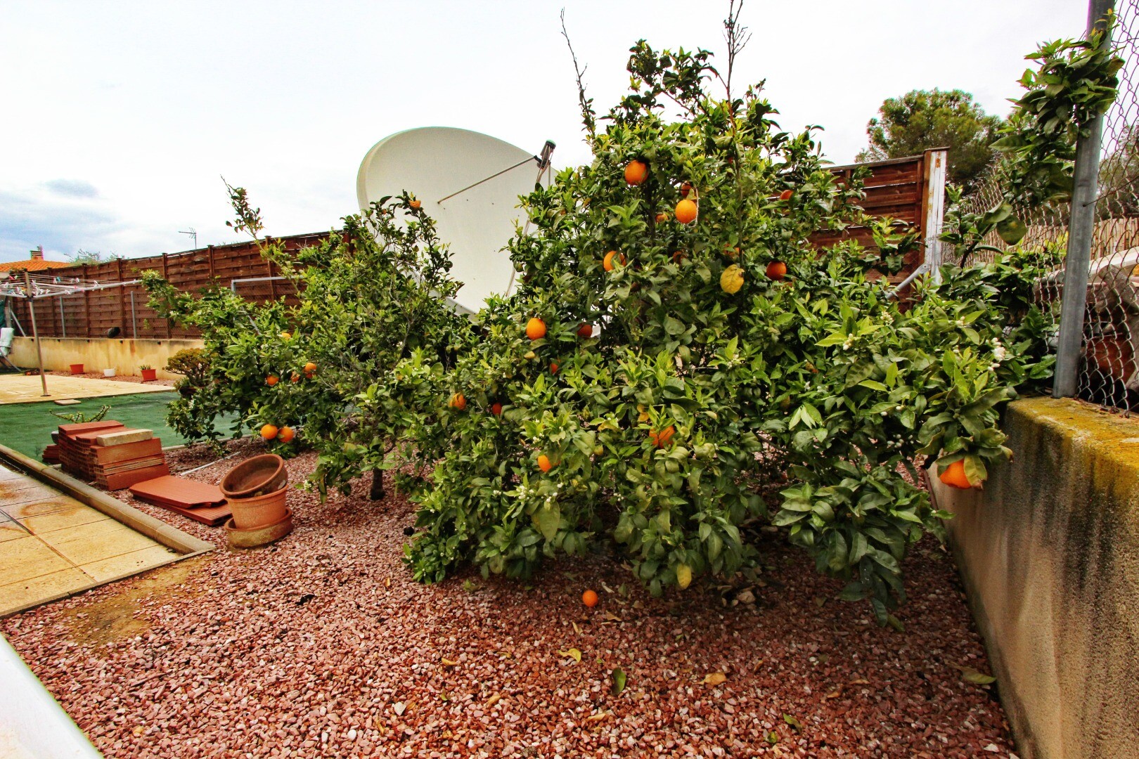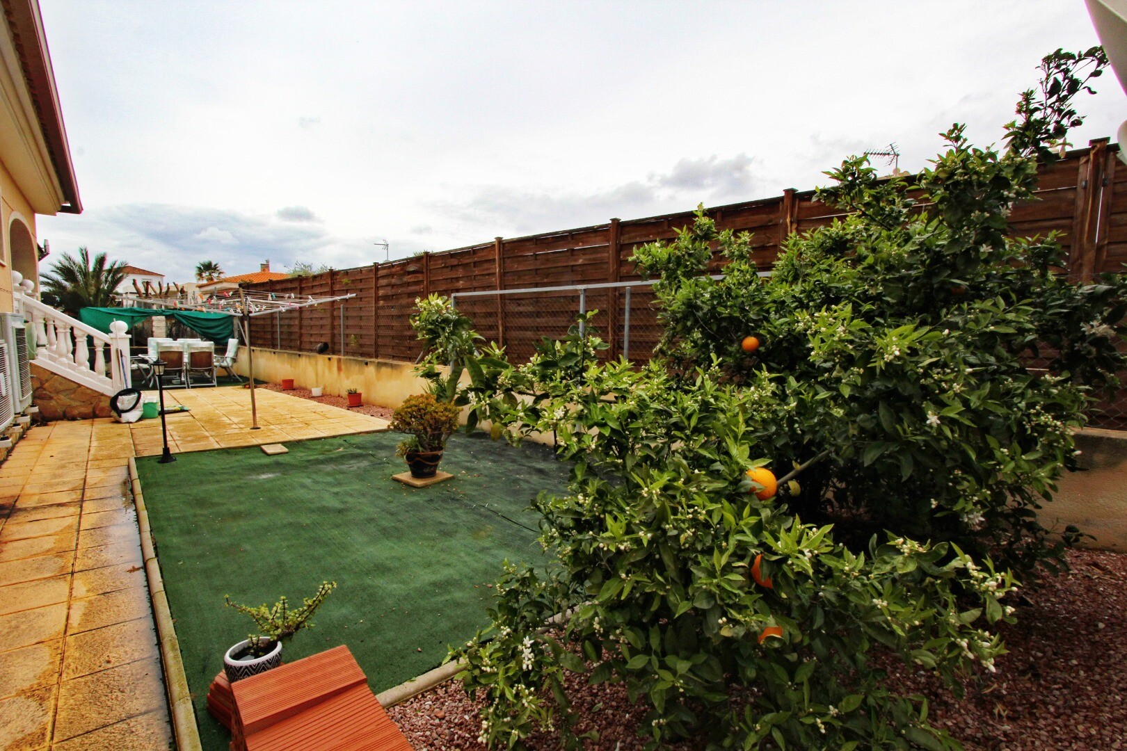 På baksidan av fastigheten hittar du ytterligare utomhusutrymme inklusive fruktträd, ett torkområde och en liten veranda – perfekt för vardaglig praktisk användning i kombination med avslappnat utomhusliv.