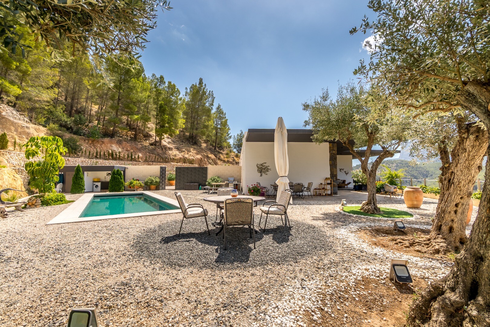 Villan ligger på en vidsträckt tomt på 13 319 m² och erbjuder exceptionell avskildhet och fri utsikt över skogar och berg. Tomten har omsorgsfullt utformats för att kombinera medelhavslandskap med lättskött praktiska egenskaper, med naturstensmurar, fruktträd, subtil stämningsbelysning och flera terrasser och relaxområden i hela fastigheten.