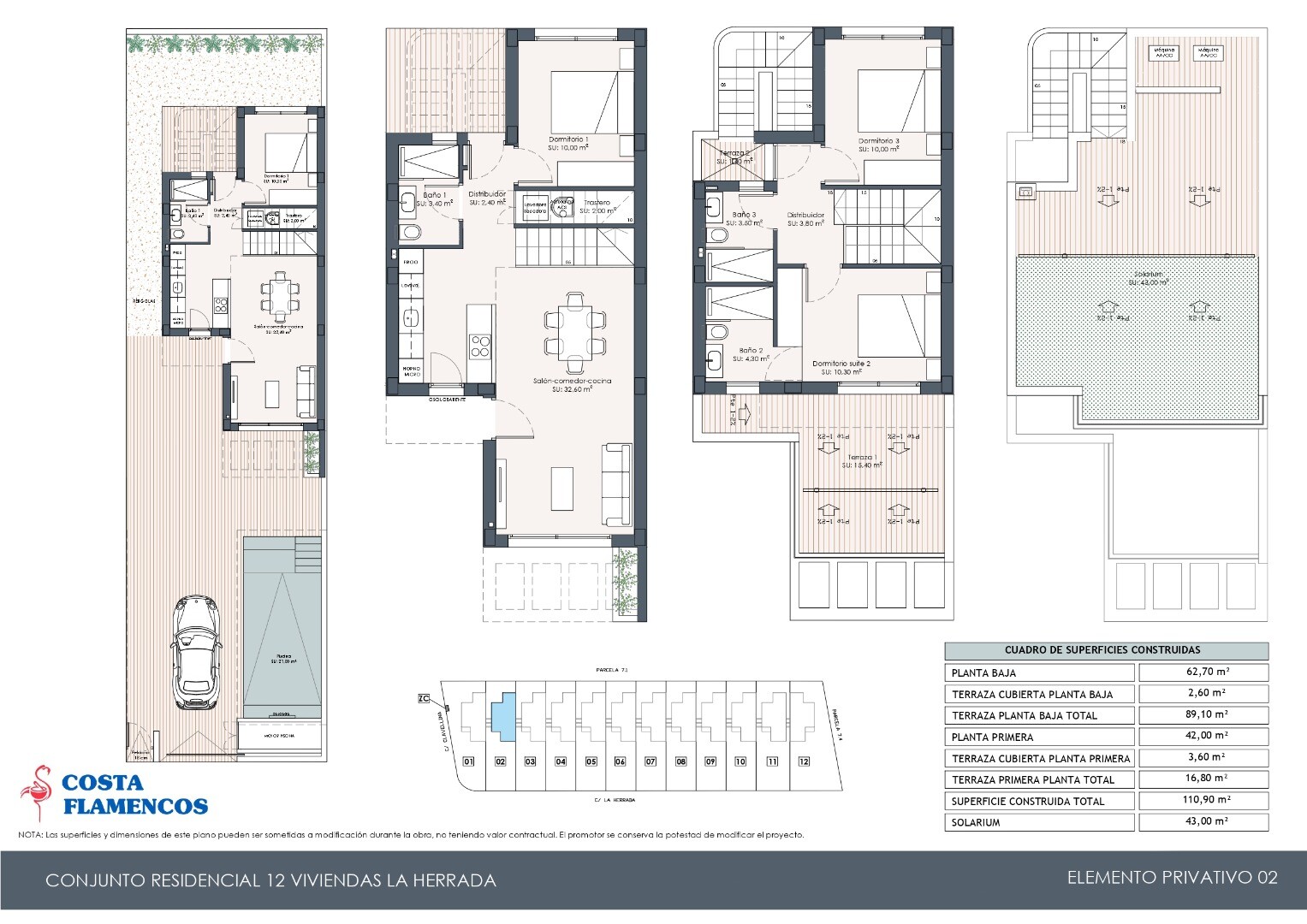 Poolen på 7x3m har ett vattenfall med sittgrupp med jacuzzi och utomhusdusch. Villorna är utrustade med taksolarium med utsikt över Torreviejas saltsjöar, fullt utrustade badrum med golvvärme och innerbelysning.