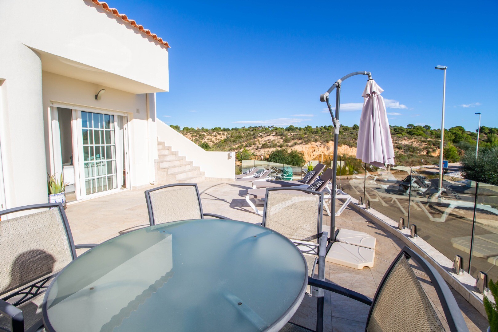 Huset ligger i ett av de bästa områdena på den exklusiva golfbanan Las Ramblas, några minuters promenad från köpcentret LA FUENTE (med barer, restauranger, apotek, busshållplats...) och golfbanorna Villamartín och Campoamor. Bara 5 km från de paradisiska stränderna och urbaniseringen Dehesa de Campoamor (med alla dess tjänster: småbåtshamn, stormarknader, apotek, hälsocenter, restauranger, tennis- och paddelklubb ……..). Med ett imponerande grönområde som går från Las Ramblas golfbana till stranden.