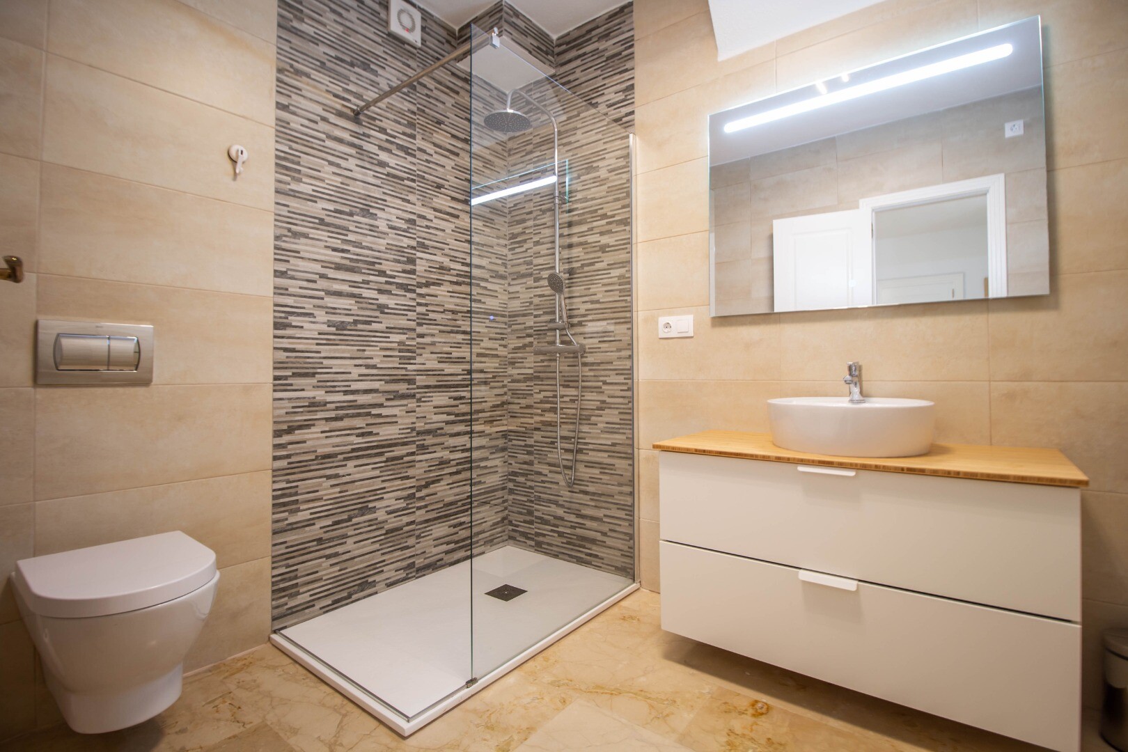 På övervåningen hittar vi ett mycket stort vardagsrum, matsal och kök, med utgång till en stor terrass med grill och imponerande utsikt över havet och grönområdet. det finns också ett annat badrum här.