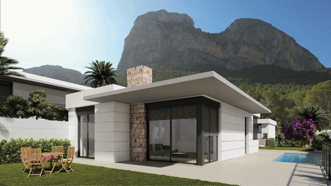 Denna exklusiva nybyggda fristående villa i ett plan erbjuder 124 m² byggd yta på en 347 m² stor tomt i ett lugnt bostadsområde i Polop.