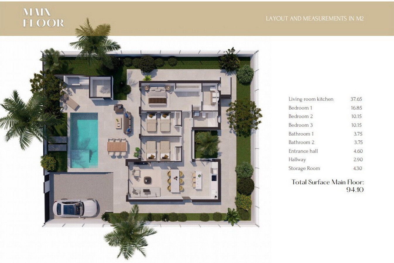 Dess arkitektoniska design och breda spridning på... en våning gör att alla rum har direkt tillgång till den privata poolen och grillplatsen genom stora fönster.