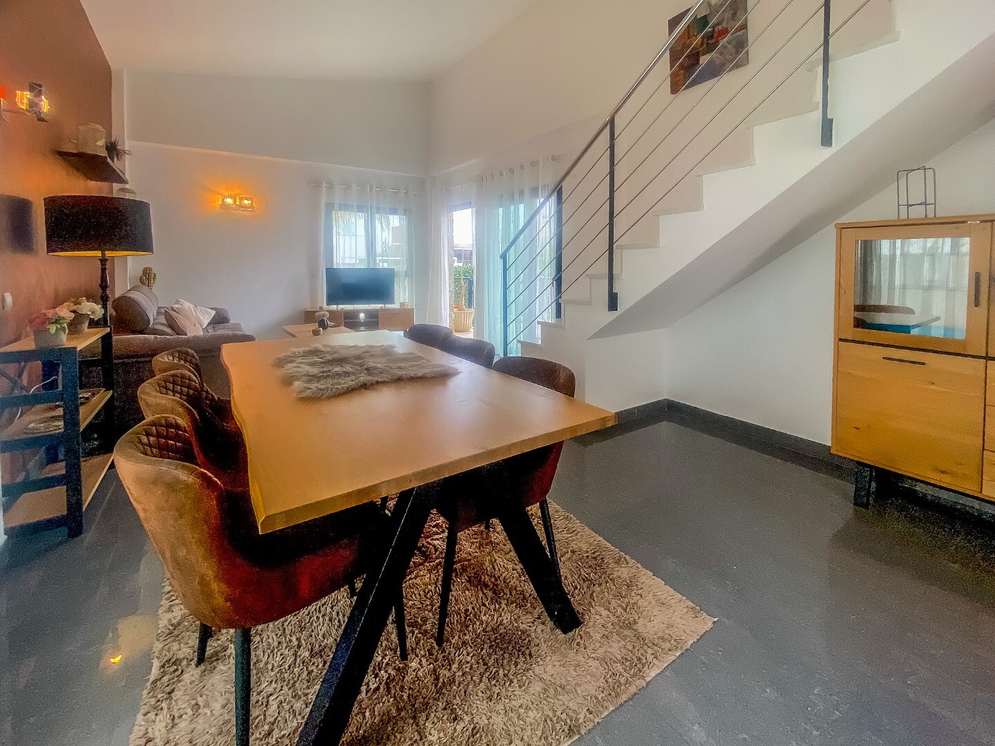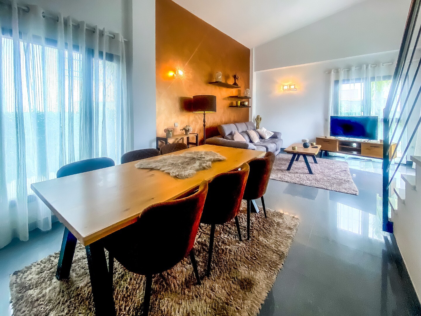 Hemmet är fördelat på två våningar: - Bottenvåningen erbjuder ett ljust vardagsrum och matplats i öppen planlösning med ett kök i amerikansk stil, två sovru...m och ett komplett badrum.