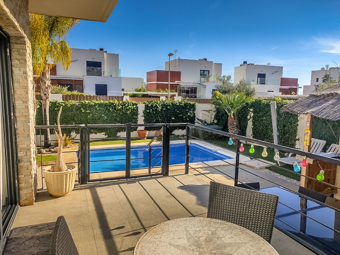 Utrustad med ett luftkonditioneringssystem med kanal (varm och kall) för komfort året runt. Utanför finns det en separat tvättstuga/förråd för extra bekvämlighet.