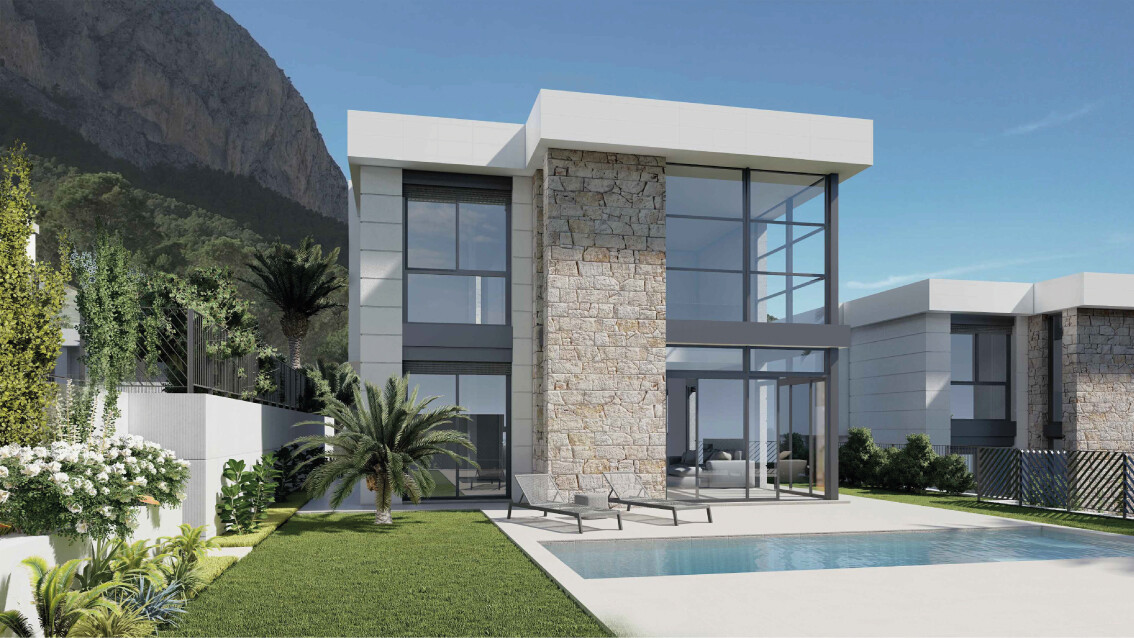 Denna eleganta, moderna nybyggda villa är fördelad på två våningar och erbjuder 163 m² byggd yta på en 393 m² tomt i ett lugnt bostadsområde i Polop.