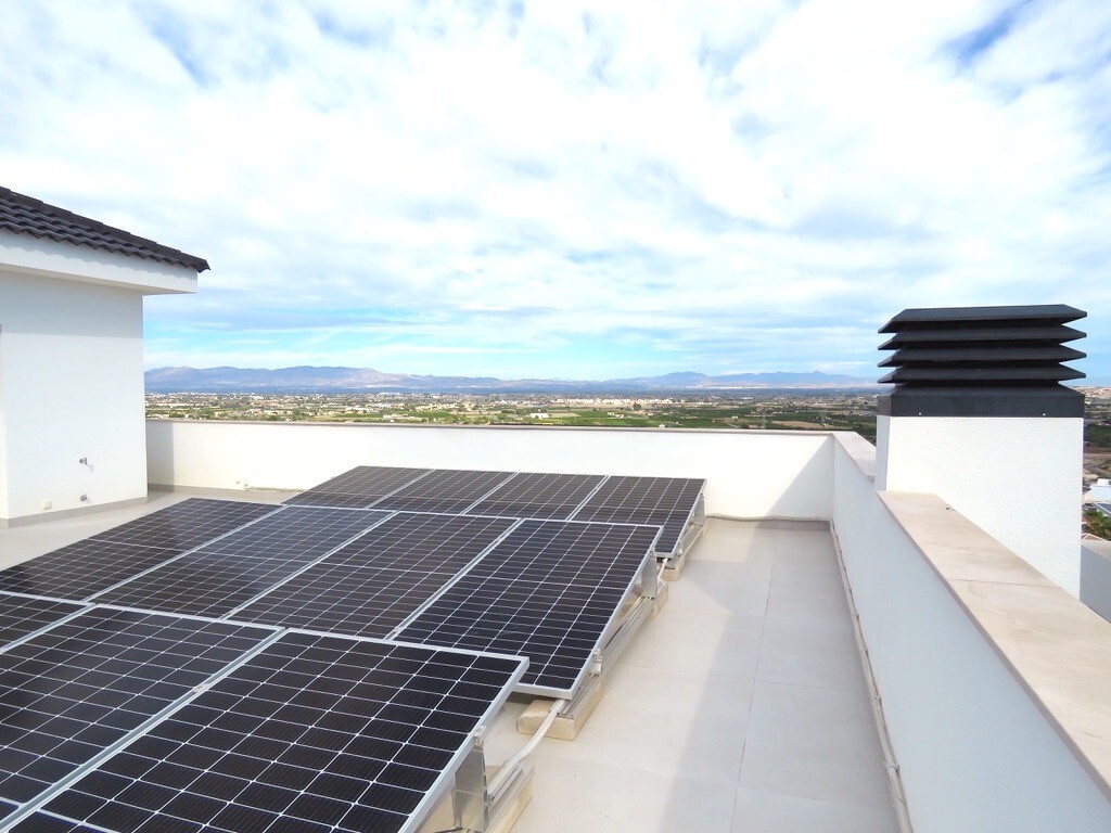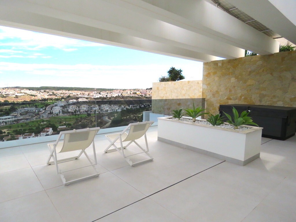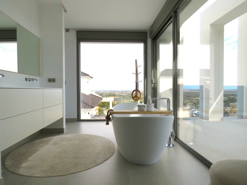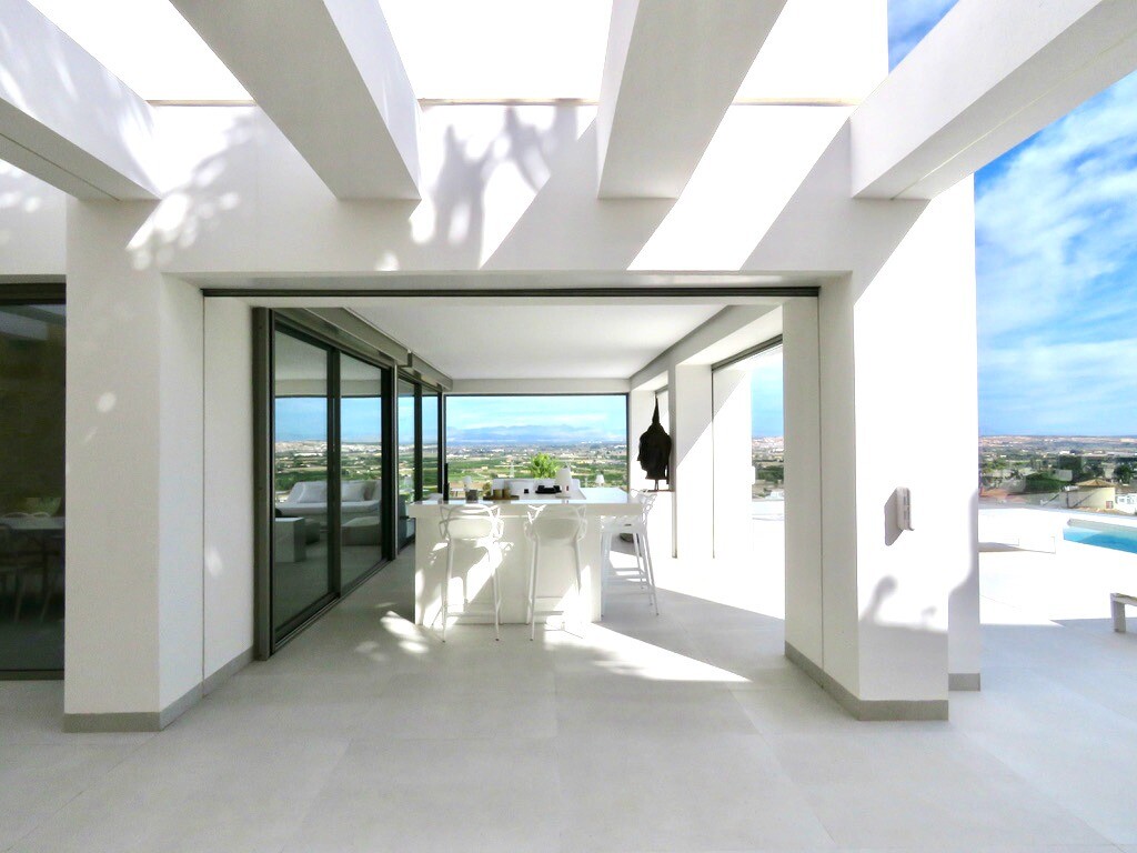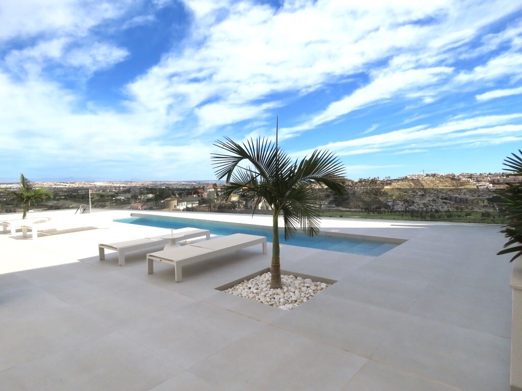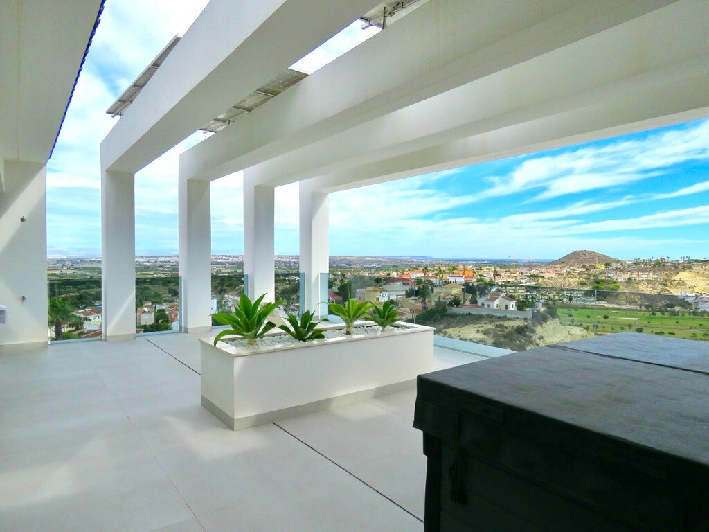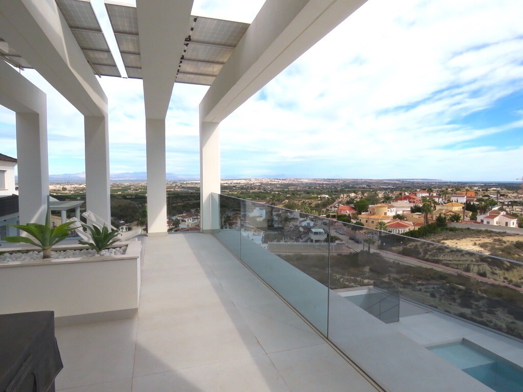 Solarium på 66m2. Denna designvilla är utrustad med den senaste tekniken och alla material är noggrant utvalda. På bottenvåningen finns vardagsrum och matsal med kök, grovkök och även den täckta terrassen. På första våningen har vi 3 sovrum och 3 badrum. På garageplan finns förstås garaget med plats för 8 bilar, ett nöjesrum och det 4:e sovrummet o...ch badrummet. Alla våningar i huset har golvvärme och huset är också helt luftkonditionerat. Hissen tar dig från garaget till husets översta våning. Denna vackra villa är även utrustad med solpaneler. Denna villa har en pool 12x2m, en utomhusdusch med toalett och handfat. Det kommersiella centrumet med La Marquesa Golfs klubbhus ligger bara 900 meter från denna villa. Alicantes flygplats kan nås på 30 minuter.